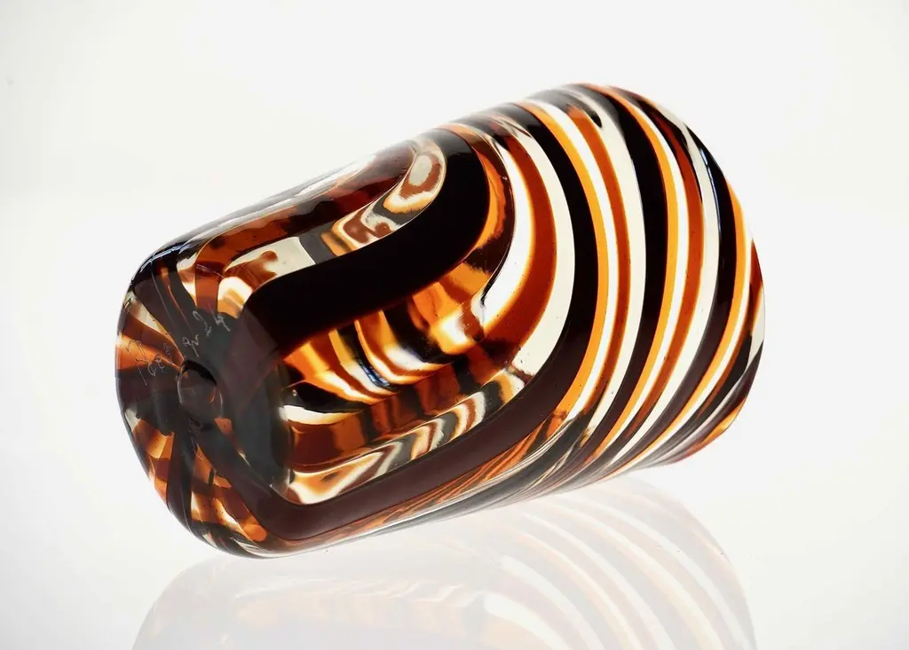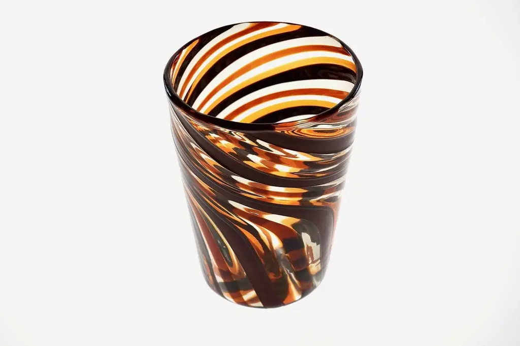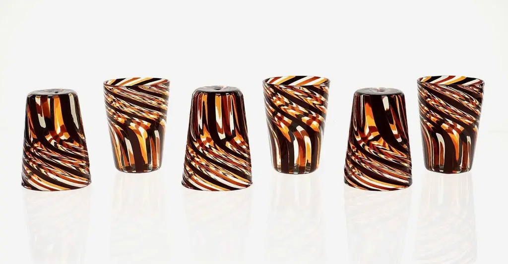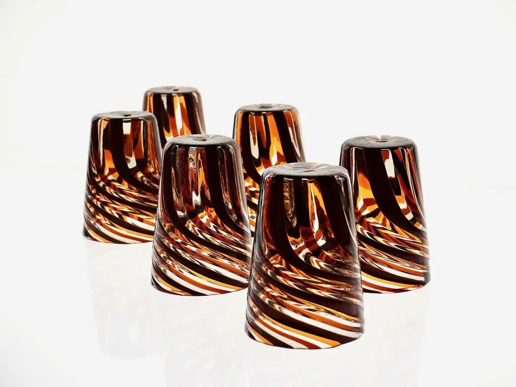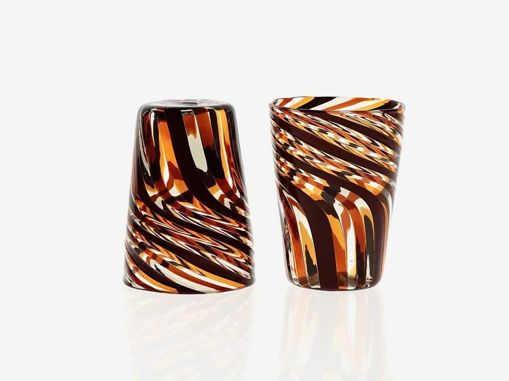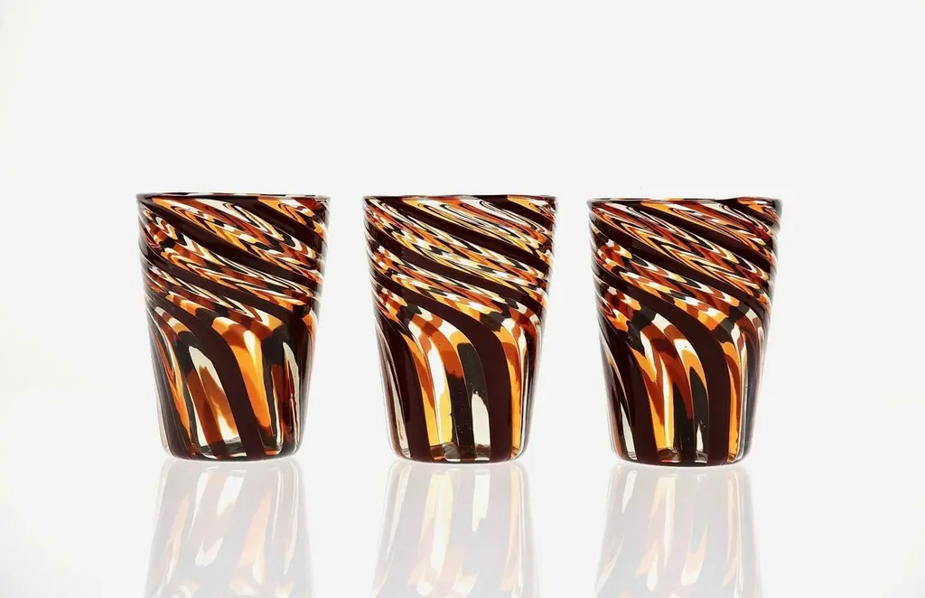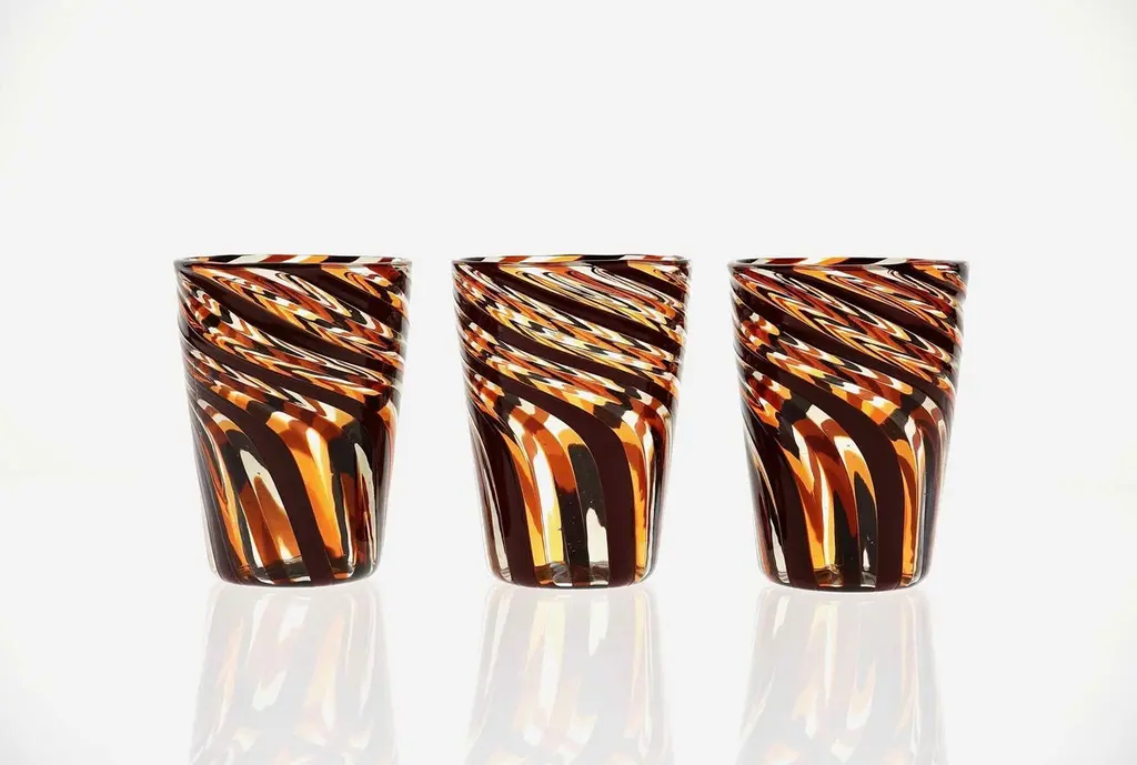 This set of six Murano glass tumblers showcases a harmonious blend of rich, vivid colors.The glasses are created using the traditional Murano technique, where a sequence of Murano glass rods is transformed into a stunning three-dimensional design. In this process, the classic technique of straight canes is enhanced with a special twist. Before the glass is blown, it is reheated to the perfect softness. The glass is then twisted into a spiral, a process known as ritorto—or mena in Murano dialect, meaning “to lead.” The spiral is carefully interrupted, creating a unique fold that straightens the rods, offering a striking visual effect.Inspired by Chaim Soutine's early works, particularly Les Platanes in Ceret (1920), these tumblers are a true testament to artistic craftsmanship.This intricate design evokes the bold, artistic spirit of the 1960s, where the intersecting colors create a beautiful patchwork effect. The body of each tumbler is crafted from fused glass rods in brown, amber, and yellow, creating an exquisite contrast of transparencies and hues. The interplay of light as it passes through the various shades of glass is simply breathtaking, making each piece one-of-a-kind.These tumblers are handmade in Murano using the challenging “a piera” technique, also known as the roll-up method, in which glass is carefully rolled onto the pipe without forming a patch. Every glass cane and element is perfectly fused together through a process called rimarginatura before being placed on the counter punty (pontello) and hand-opened. The canes retain their lens-like effect, creating an enchanting play with light.Each tumbler is a true work of art, and when displayed as part of a set, they’ll be sure to attract attention and spark conversation. The price is per unit, so you can purchase any quantity, with complimentary shipping on orders of 12 or more. Each tumbler is signed, underscoring its authenticity.Slight variations in height and diameter are a testament to the high level of craftsmanship that goes into creating each piece.