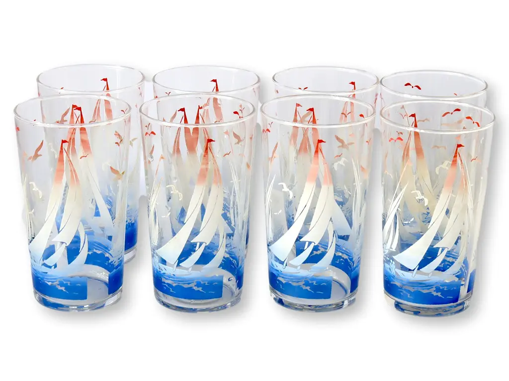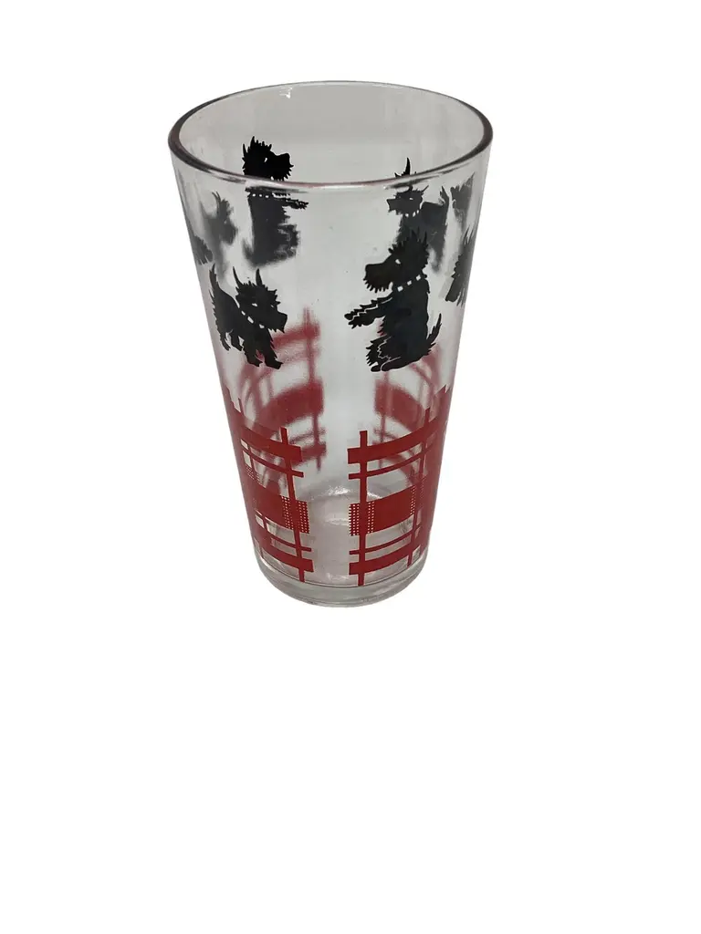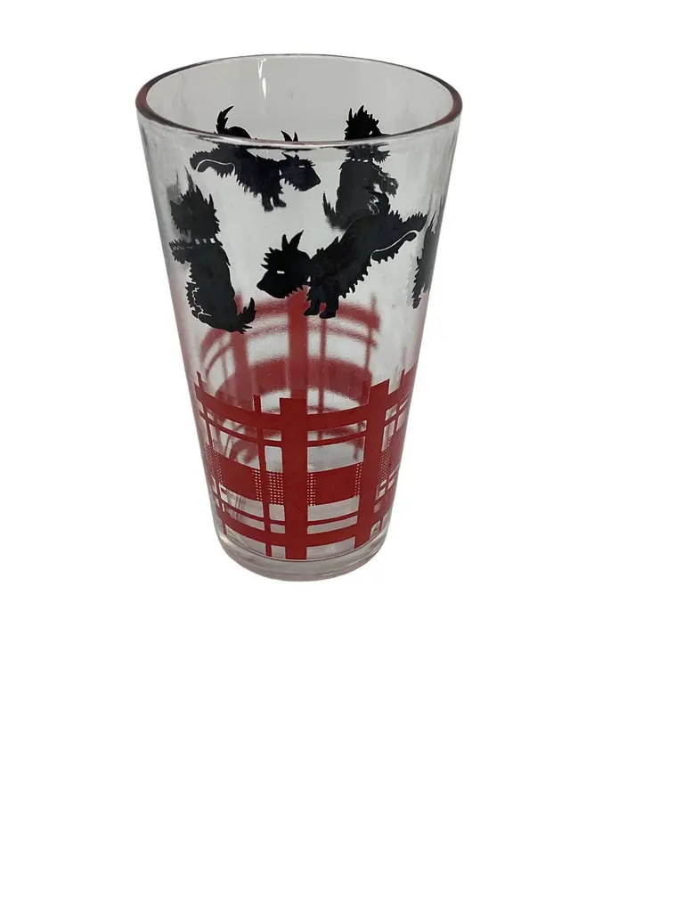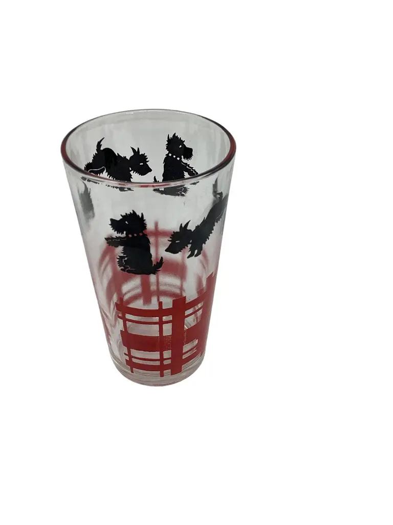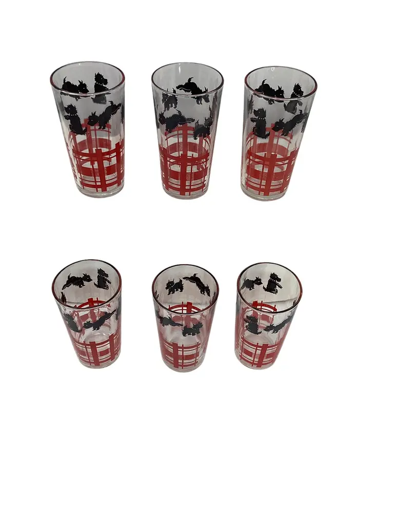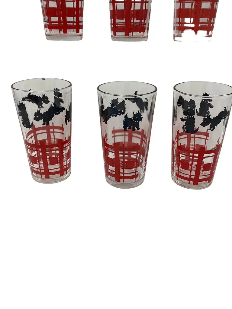 Set of 6 Vintage Hazel Atlas Scotty Tumblers. Playful black scotties in various jumping pose leaping over a red enamel fence. We have 3 sets available in this pattern.