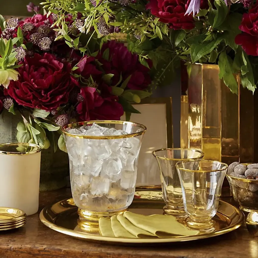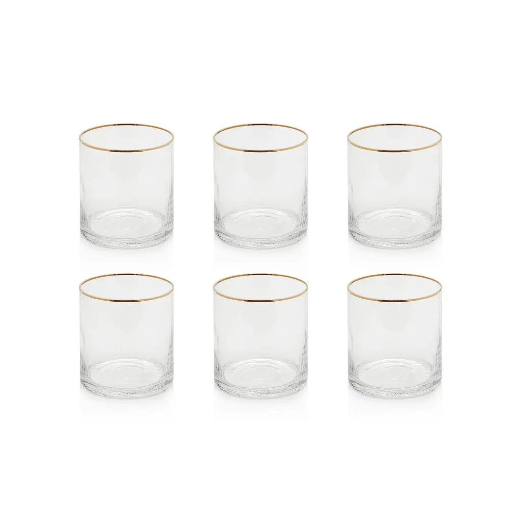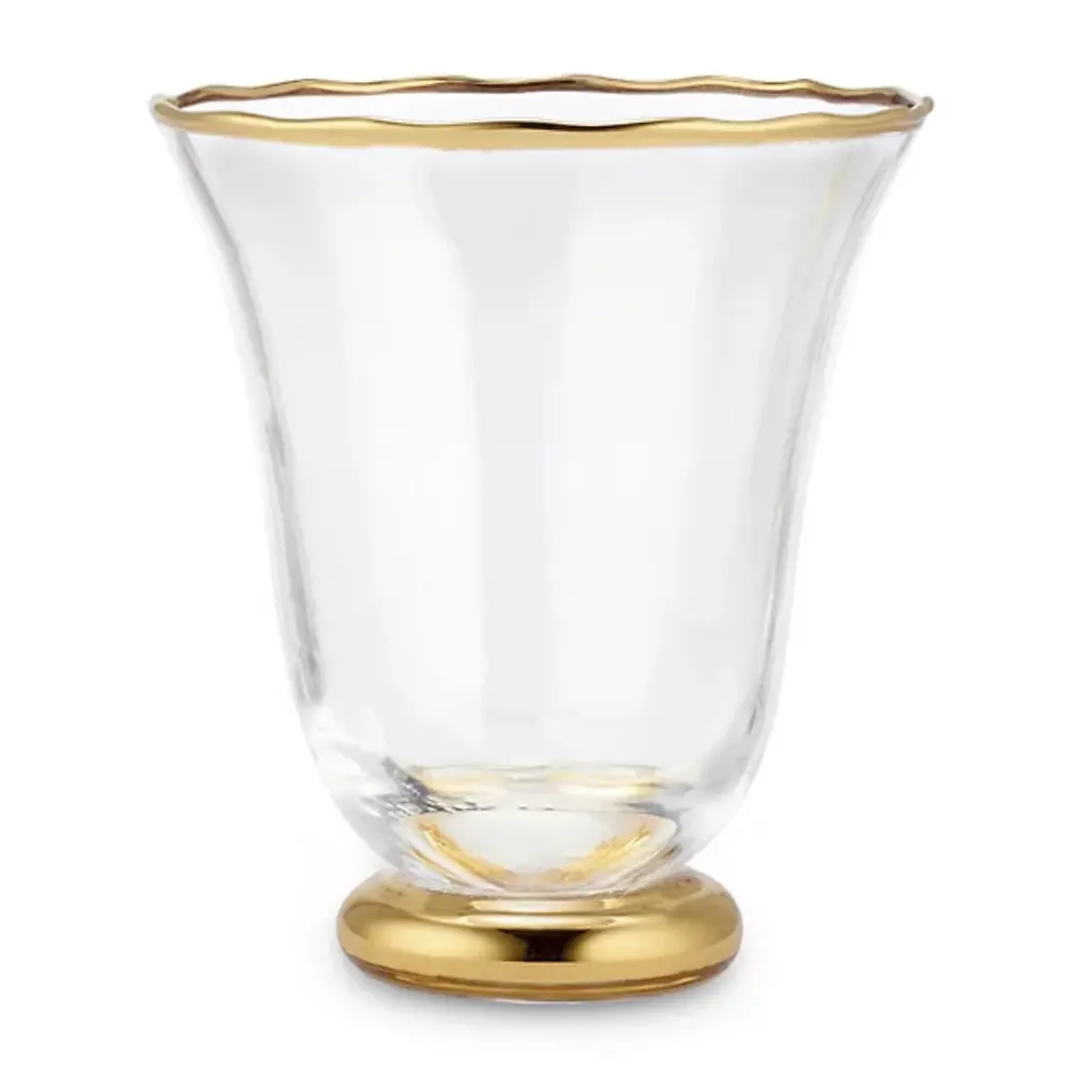 The Sophia Tumbler, Set of 4 from AERIN combines hand-blown Italian crystal construction with subtle fluting that runs along the sides of each glass. The set of four includes hand-painted detailing at both the rim and base, creating coordinated accents that frame the drinking area. Each tumbler features lead-free crystal that provides clarity while maintaining durability for regular use. These glasses work well for water, juice, or cocktails, and their fluted design adds texture while maintaining a comfortable grip. The set coordinates with other Sophia glassware pieces for complete table settings.