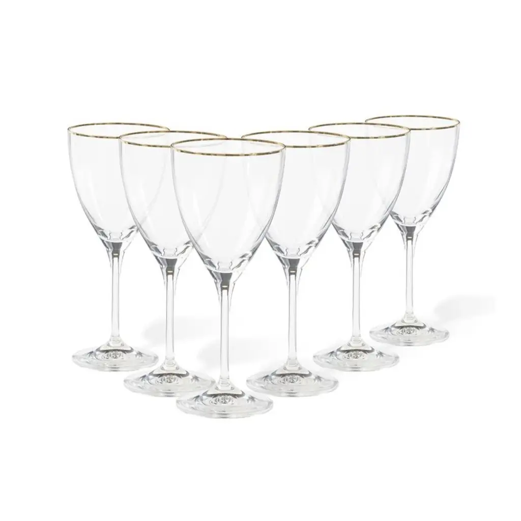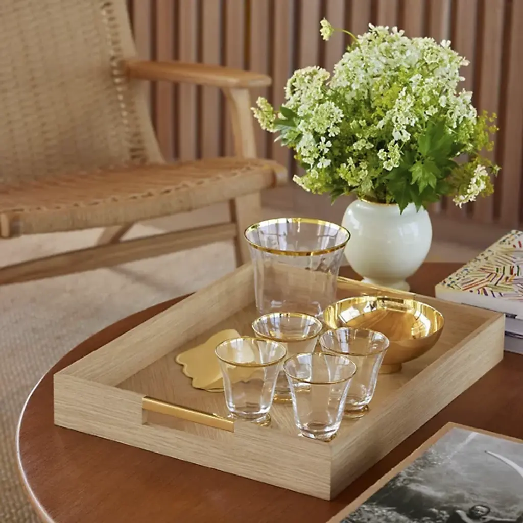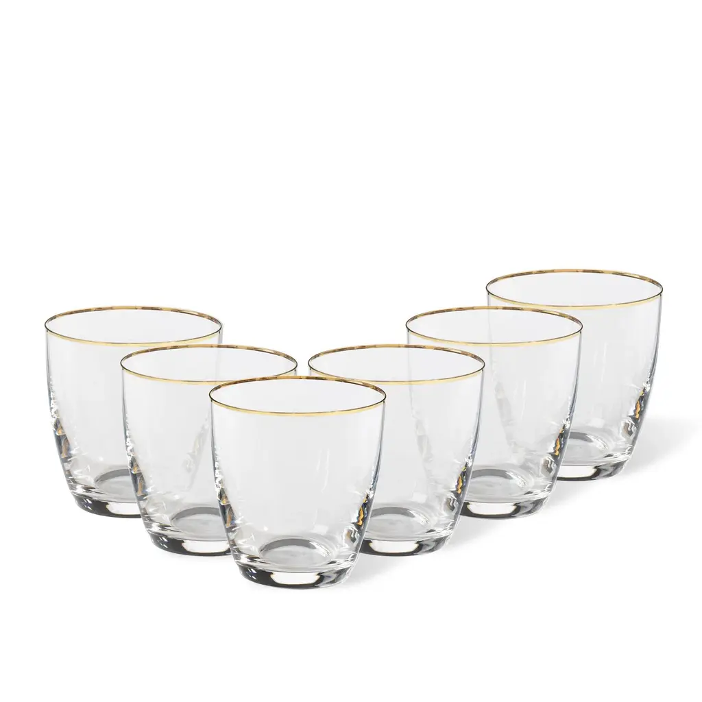 The Sophia Tumbler, Set of 4 from AERIN combines hand-blown Italian crystal construction with subtle fluting that runs along the sides of each glass. The set of four includes hand-painted detailing at both the rim and base, creating coordinated accents that frame the drinking area. Each tumbler features lead-free crystal that provides clarity while maintaining durability for regular use. These glasses work well for water, juice, or cocktails, and their fluted design adds texture while maintaining a comfortable grip. The set coordinates with other Sophia glassware pieces for complete table settings.