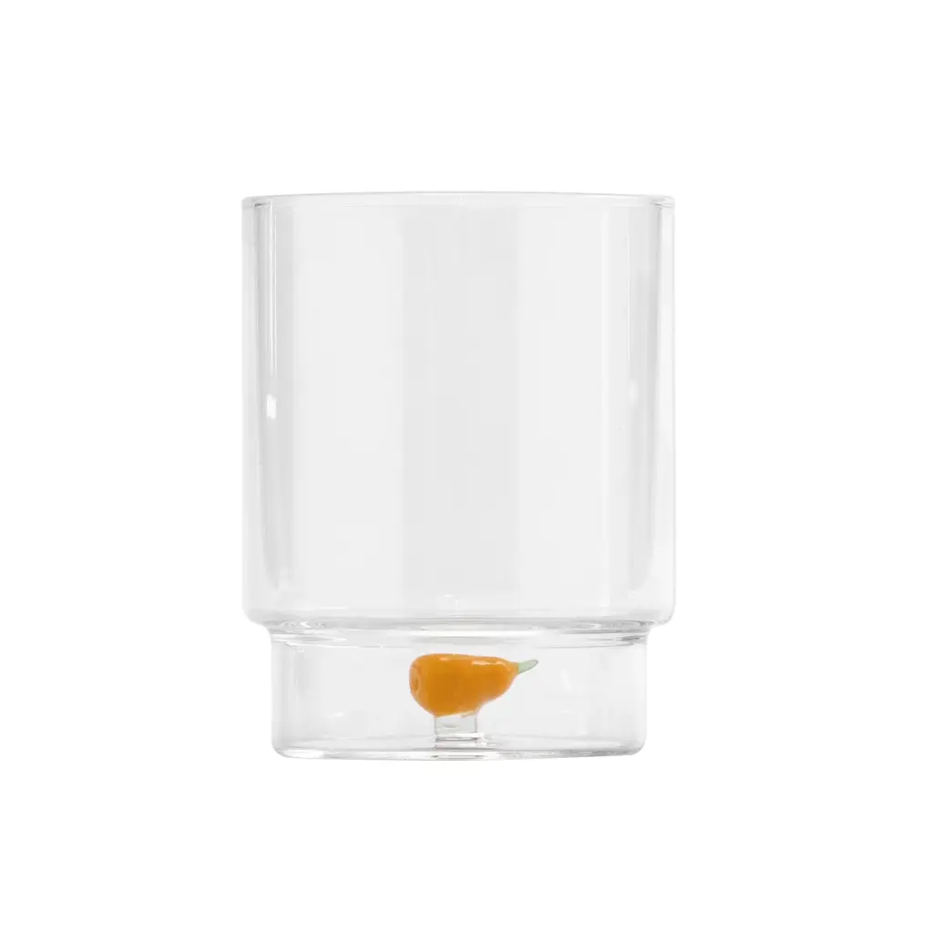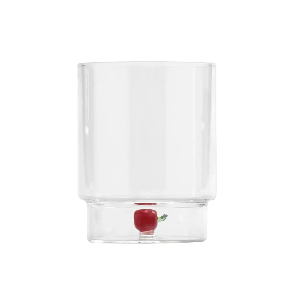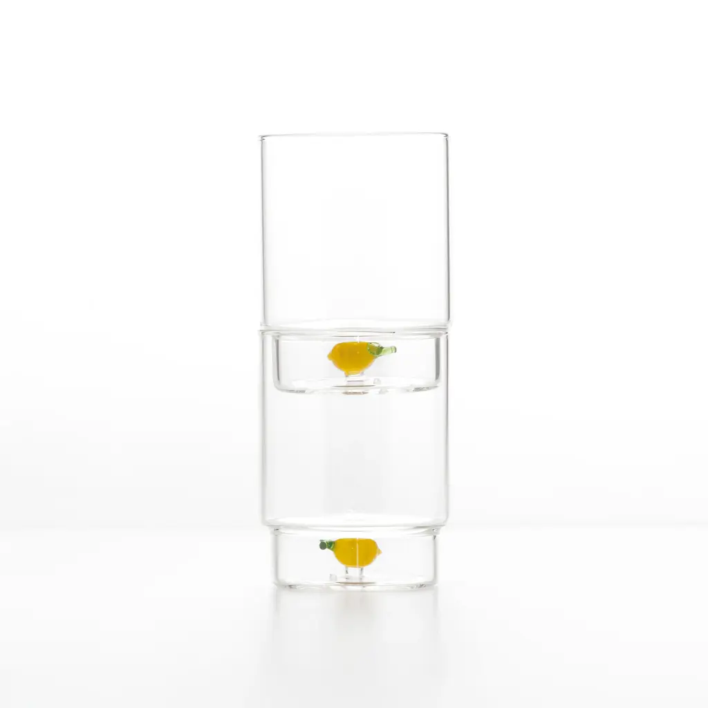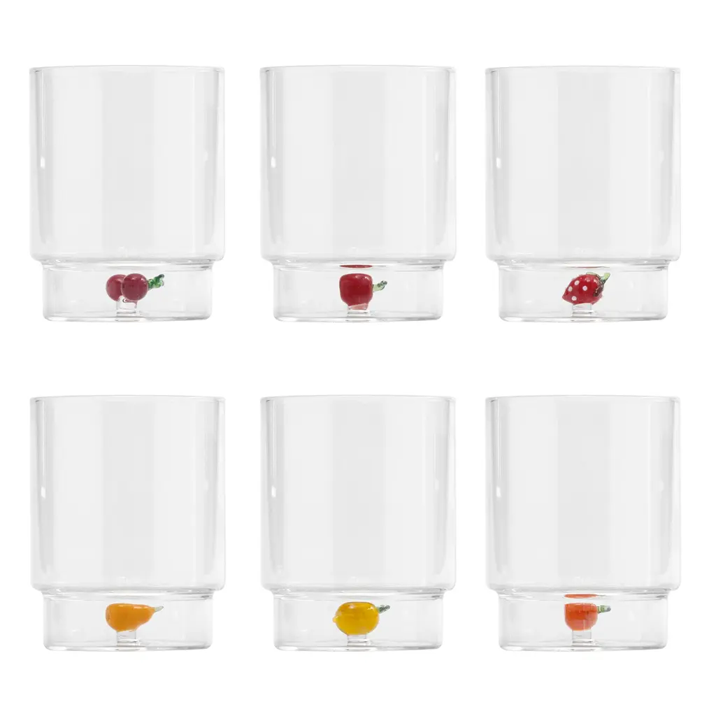 Add a touch of playful charm to your table with the Teca Frutta Tumbler Set from Zafferano. Crafted in Italy from durable borosilicate glass, each tumbler features a unique double-walled base. Safely nestled within is a colorful, handmade fruit decoration, allowing for easy cleaning and worry-free use with ice. With six different fruits, this stackable set lets guests easily identify their glass, blending whimsical Italian design with smart, everyday functionality. Highlights