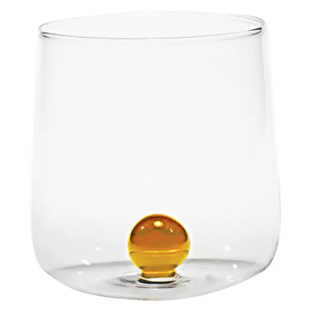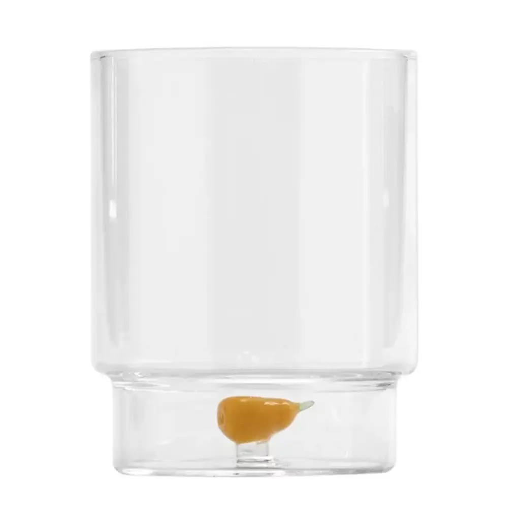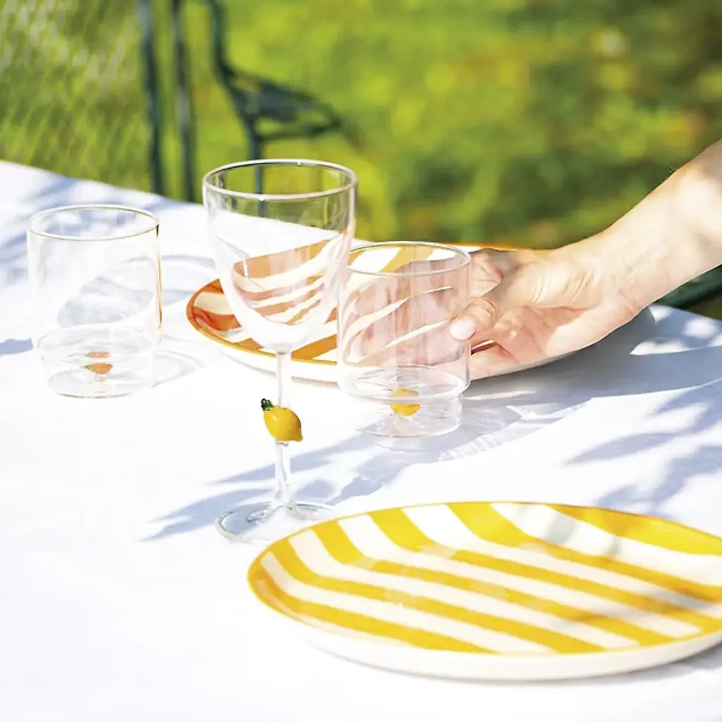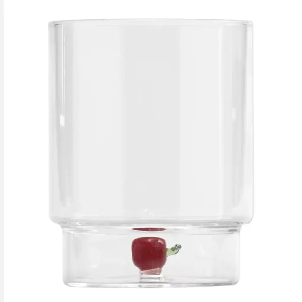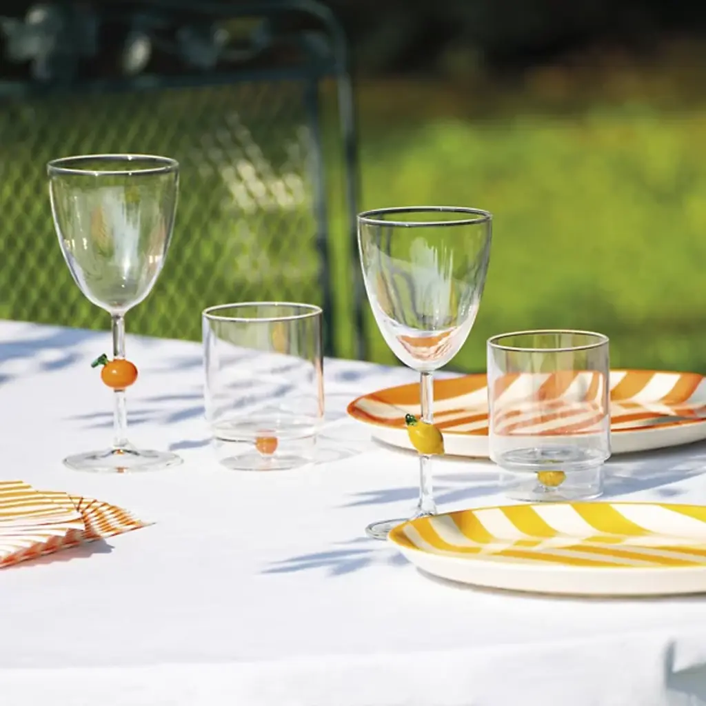 The Teca Frutta Tumbler, Set of 6 from Zafferano America uses whimsical fruit patterns that offer inventive design with vibrant artistry. The tumbler is designed by Federico De Majo and blown from durable borosilicate glass. It features a double-bottom chamber holding handmade decorations shaped like colorful pieces of fruit. Each fruit is distinct, making the glasses identifiable in a group setting. An engraved script dances around the central detail, declaring each one is proudly handmade, offering charm and character to any table.