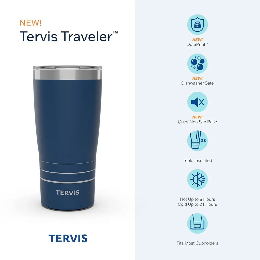 Tervis insulated drinkware delivers the ultimate combination of personality and performance for pure drinking enjoyment. Features: DuraPrint™ technology makes tumblers chip-resistant, peel-resistant, and dishwasher safe. Quiet, nonslip base prevents noisy slipping and sliding. Slider lid is BPA-free, leak resistant, easy to open and close, and easy to clean.Triple insulation reduces condensation and keeps drinks hot for up to 8 hours or cold for up to 24 hours (always use caution with hot liquids).Fits most cup holders for on-the-go convenience, making it the perfect stainless steel travel tumbler and tumbler for coffee.Durable, copper-lined 18/8 stainless steel construction won't retain tastes or odors. Do not soak or use harsh cleaning materials (like bleach, chlorine, etc.) Do not put in freezer or microwave.Manufactured in China. Designed in, printed in, and shipped from Florida, USA. Stainless steel tumblers feature a limited 2-year guarantee.