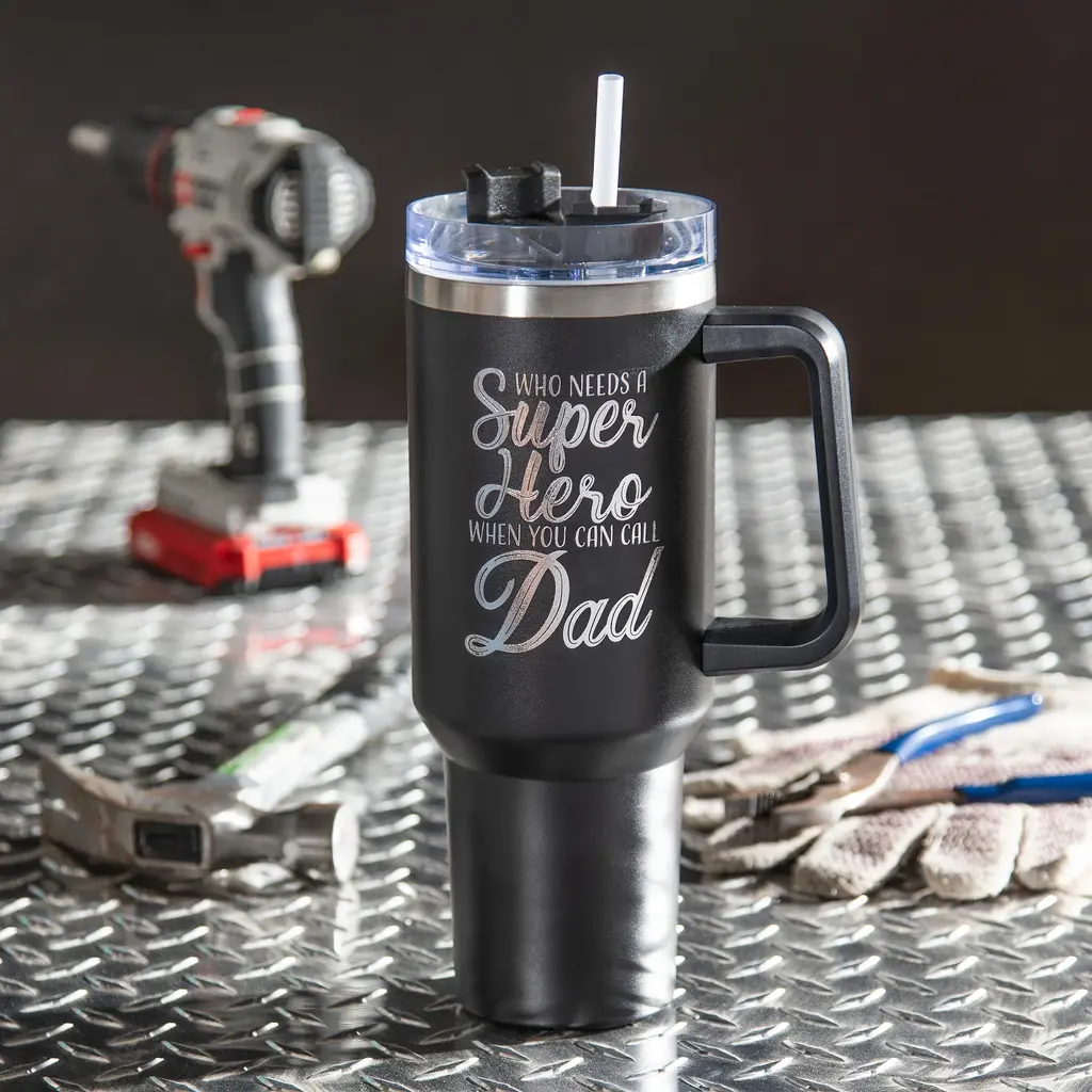 The perfect gift for "you know who", this black tumbler reads, "The Boss" in silver lettering across the front. The double-walled stainless steel tumbler fits inside most vehicle cup holders, has a BPA-free plastic lid with sliding lock, a removable straw and a sturdy red handle. Perfect for hot and cold beverages. Hand wash. Holds 40 oz. 5 1/2"L x 4"W x 12 1/2"H.