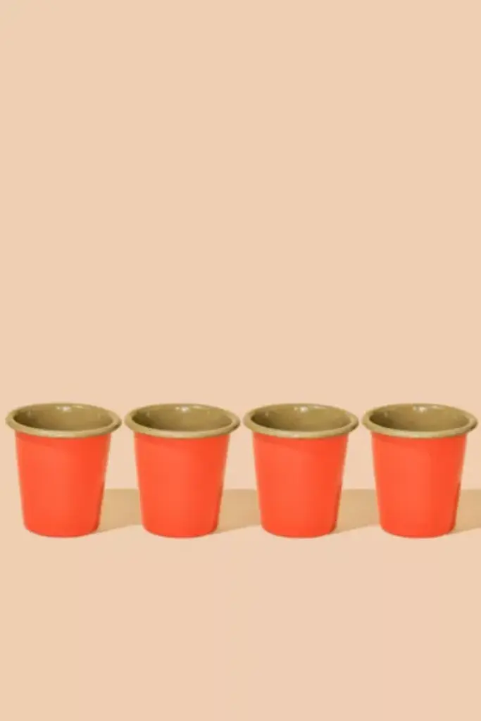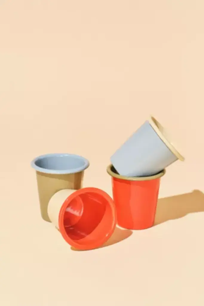 Lightweight, stackable and meant to last a lifetime, this collection of enamelware is inspired by vintage camping adventures. With Sky, Brick, Cream and Olive designed to stand alone or play well together, this is our version of your childhood camping set. Each set includes 4 x tumblers **Content + Care** \- Made from enamel-coated food-grade steel. \- If you drop our enamelware, it might chip, but it won't break. If the powder coating chips, the steel beneath it may naturally oxidize. The enamelware remains safe to use. \- Recommended hand wash. \- Do not use abrasive cleaners or hard water stain removers. \- Imported **Dimensions** Tumbler: 3.5" tall, 3.5" diameter
