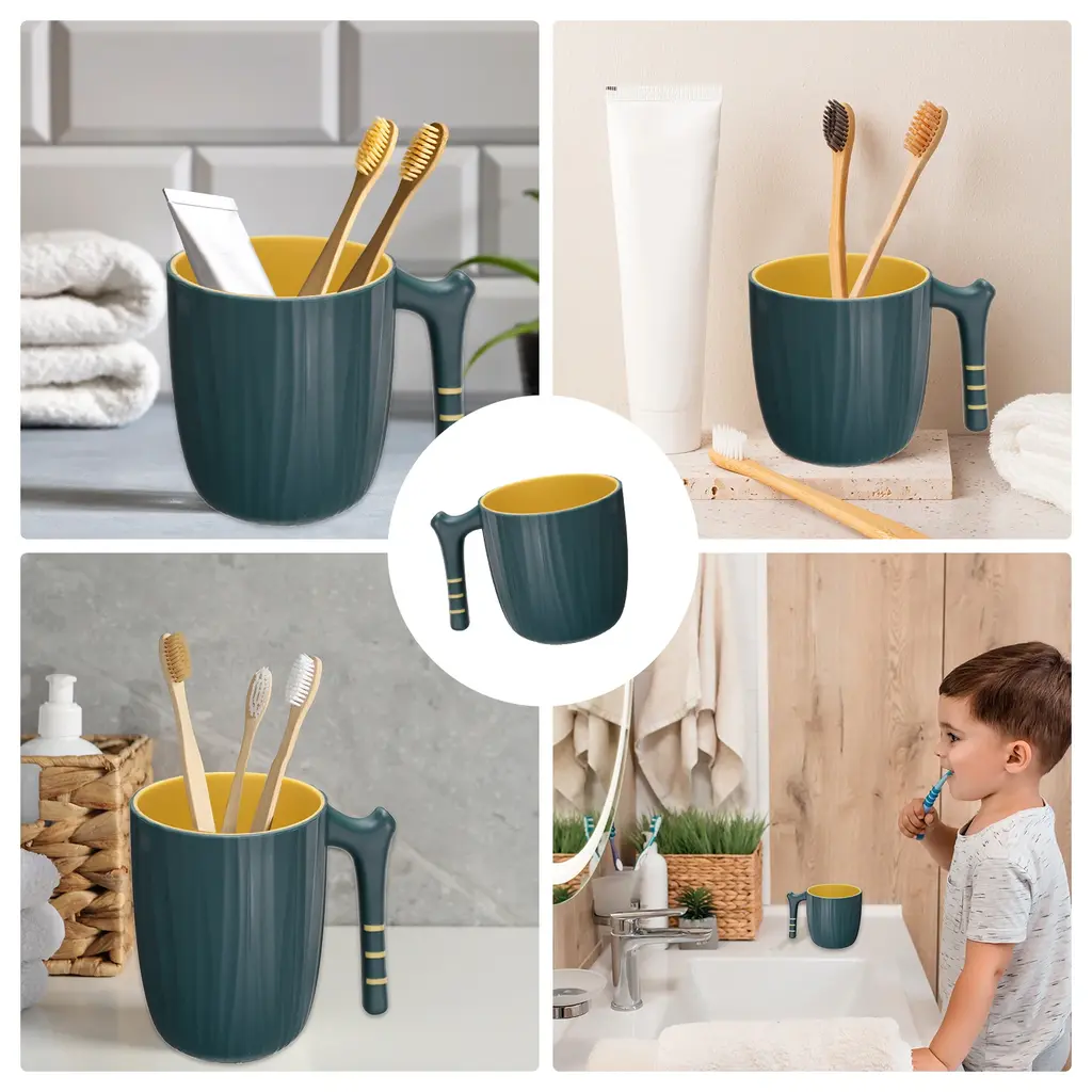 Description:Durable Plastic: The toothbrush holder is made from lightweight and elastic TPR and PP material, which is built to last, and easy to easy-to-clean, reusable toothbrush cup that helps reduce waste from single-use cups.Handle Design: The toothbrush cup features a tumbler design with a handle, offering a comfortable grip and easy transportation, and is designed to hold multiple toothbrushes.Simple Use: To use, simply place your toothbrushes and toothpaste into the cup, utilizing the handle for easy access and transportation, the wide opening allows for easy access and cleaning.Home and Travel: Suitable for both home bathroom organization and travel use. The tumbler's compact size and handle make it convenient for carrying in the bathroom or packing for trips.Specification:Material: PP and TPRColor: Dark GreenCup Diameter: 9 cm/3.5 inchCup Height: 9 cm/3.5 inchCapacity: 400mlPackage Included: 1pc x Toothbrush Cup