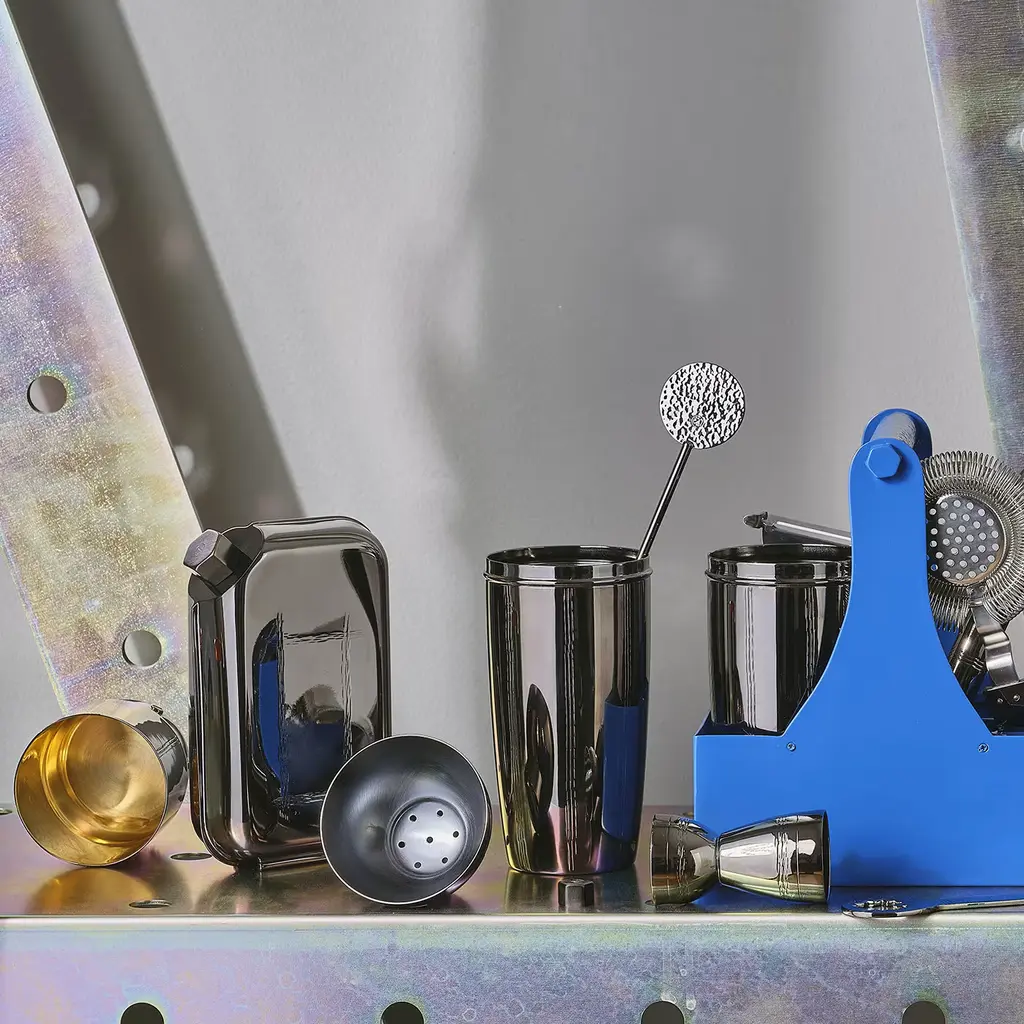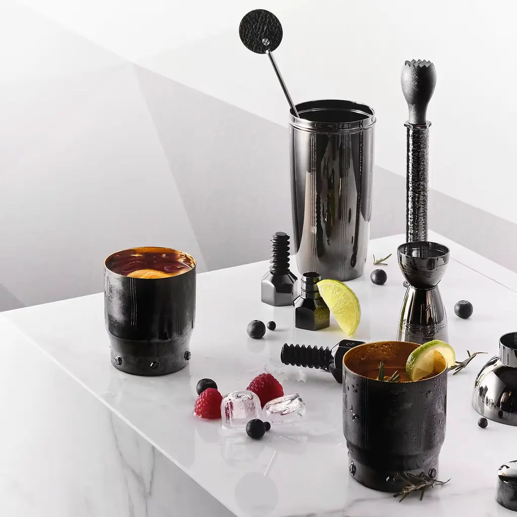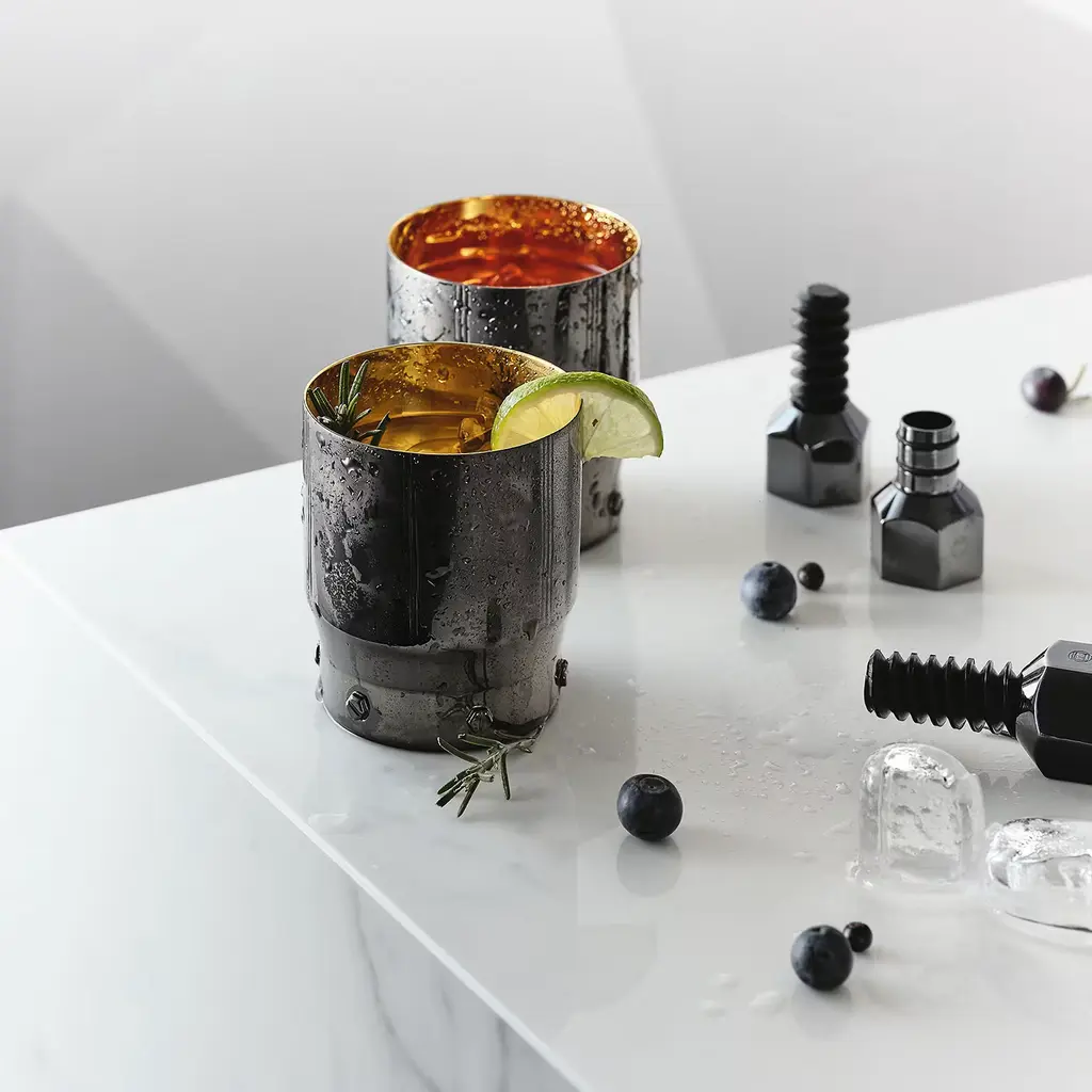 This stylish tumbler is inspired by the world of mechanics, giving rise to its simple yet robust design. Crafted from solid brass, this tumbler features a sleek titanium-plated finish: a dynamic alternative to silver. Finished with a gilded interior for a glamorous touch, this piece is produced in collaboration with renowned Lebanese designer Samer Alameen.