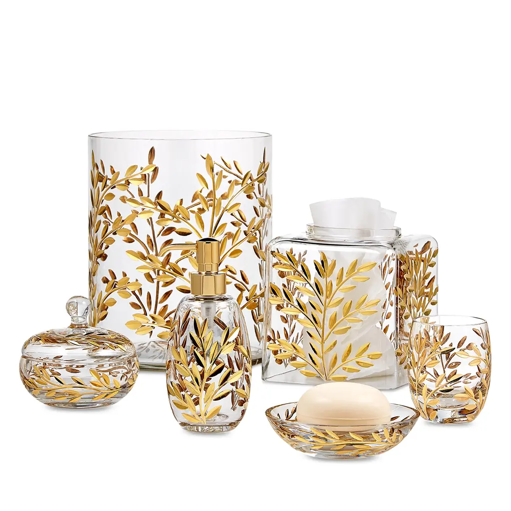 Leafy vines encircle these artisanal glass bath accessories. Each sparkling, mouth-blown piece is cut by hand and embellished with 14k gold accents or platinum.