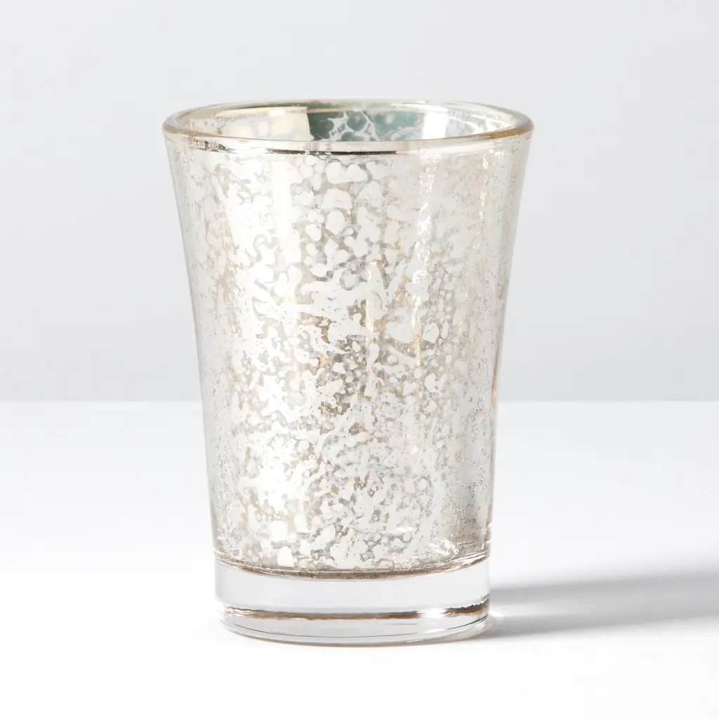 An elegant tumbler in mercury glass with a metallic finish and silver edge.