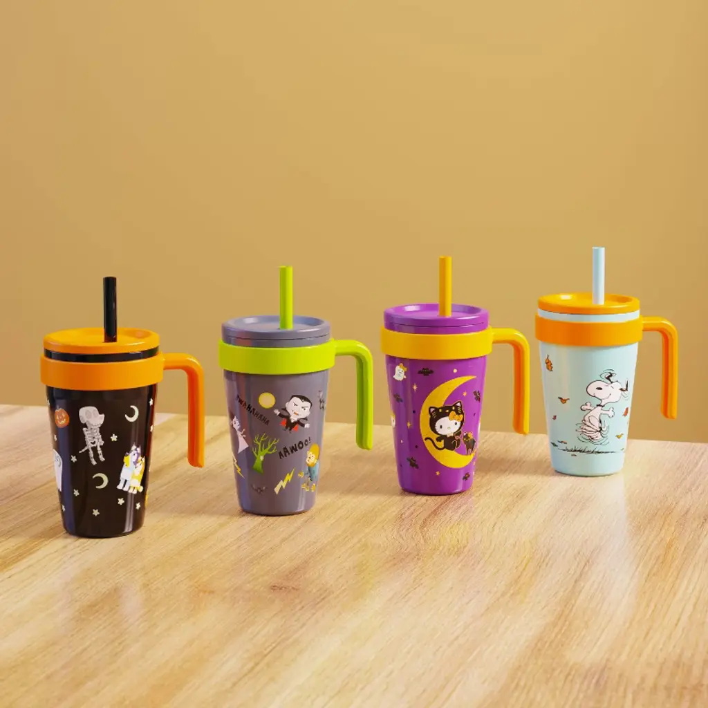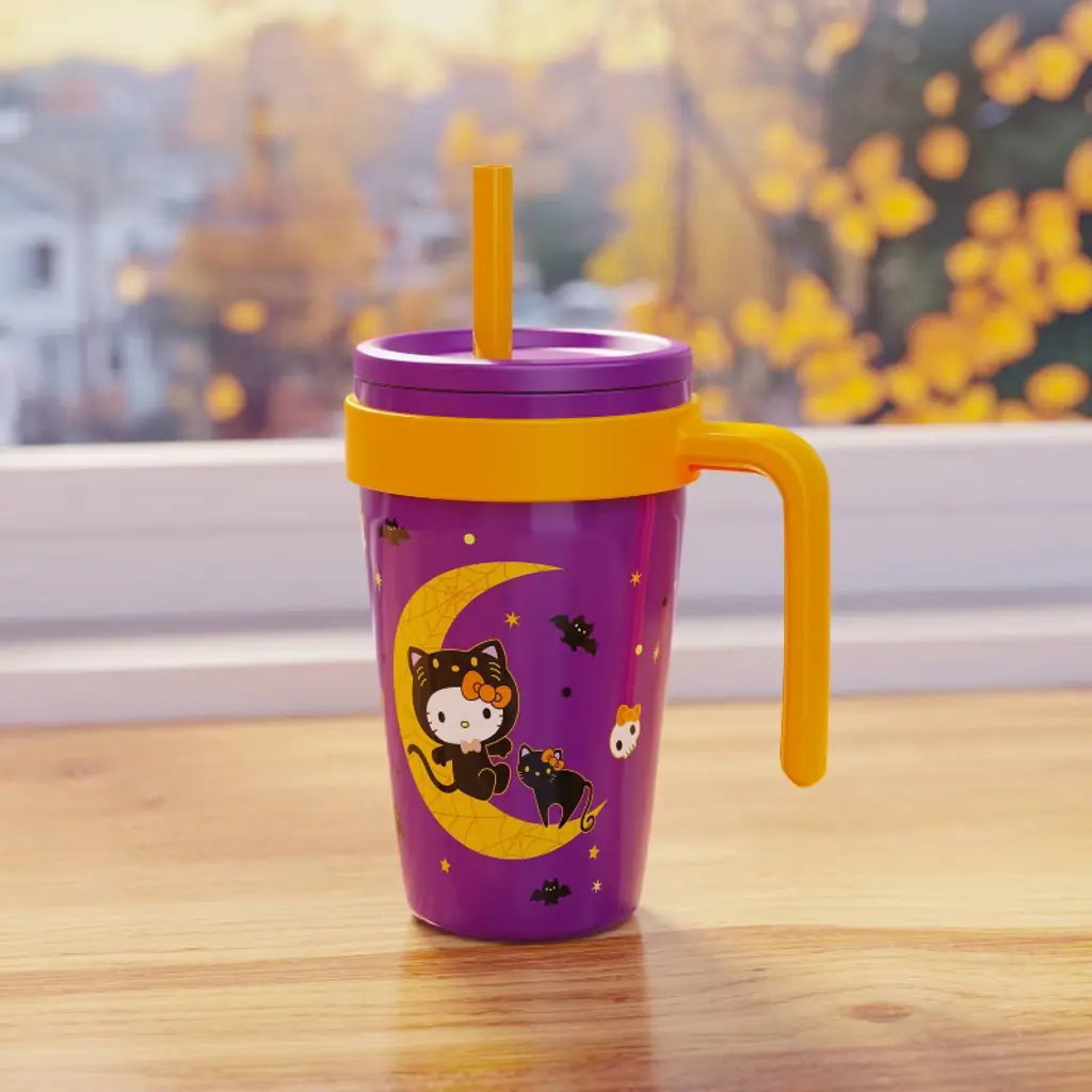 This Halloween-themed tumbler featuring Hello Kitty is perfect for keeping your child hydrated during the spooky season! The 16-ounce tumbler is easy for your little one to carry with its handle, whether they're out trick-or-treating or enjoying Halloween activities. The lid and straw keep water accessible and help prevent spills, ideal for everyday use. Made of durable plastic, it fits comfortably in most car cup holders and is a great companion on family outings. Plus, it's top rack dishwasher safe, making cleanup a breeze for busy parents. Grab one today and make your child’s Halloween even more special!
