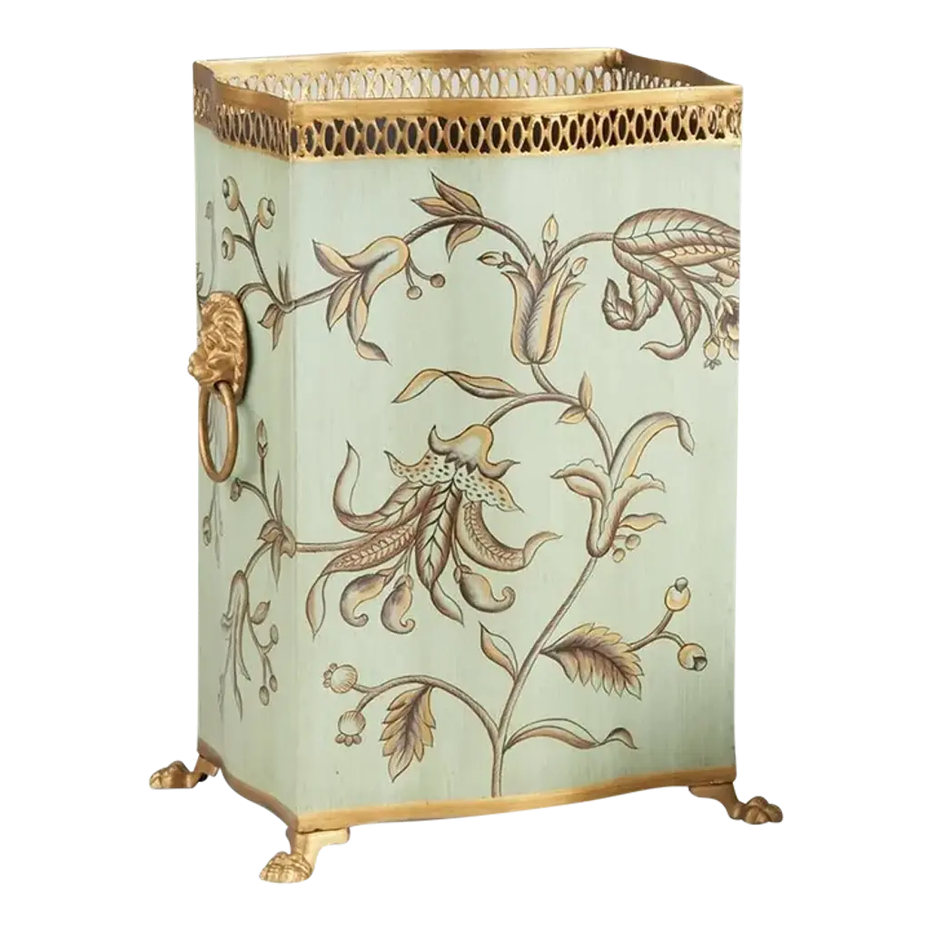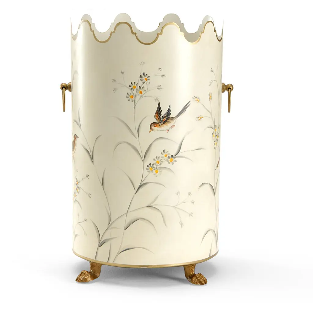 Collect waste in your home or office with this elegant oval wastebasket. Crafted of tole with a scalloped top, it features a stunning hand painted flower and bird motif. The soft neutral color palette with gold paw feet, ring handles, and trim create a complementary design for any traditional decor.