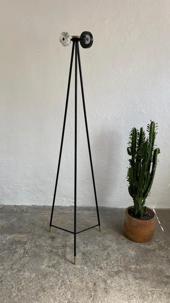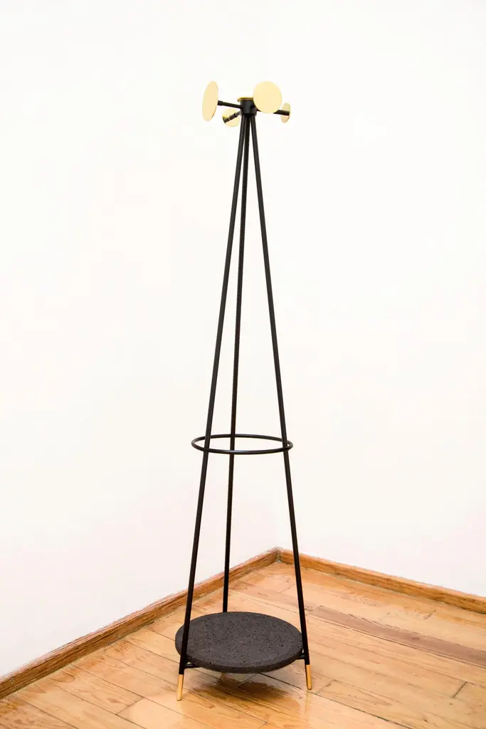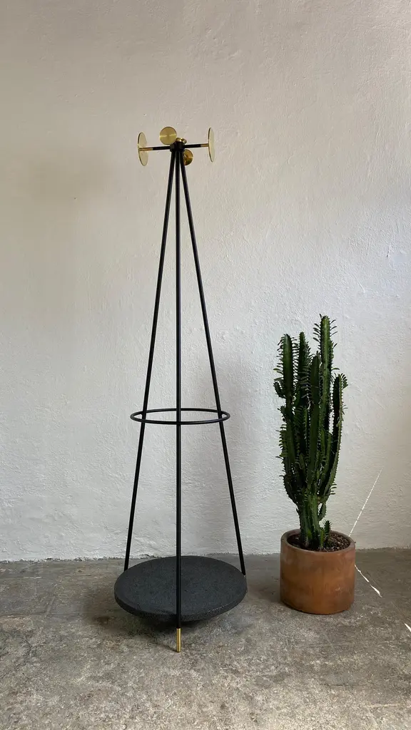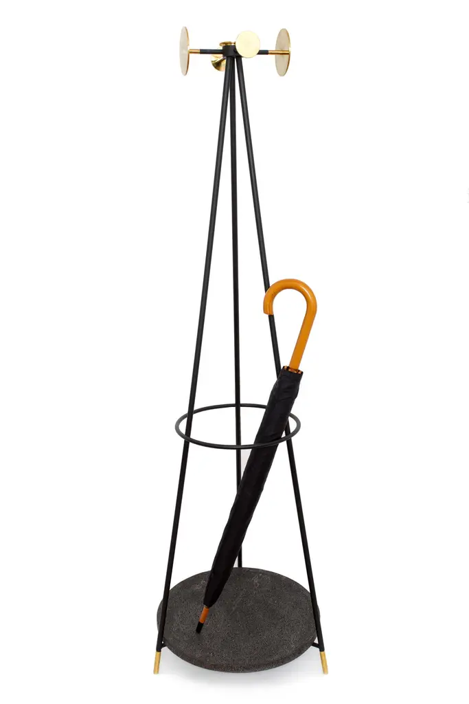 Brass coat and umbrella stand by Comité de ProyectosDimensions: 40 x 40 x 145cmMaterials: metal, brass The hooks of this coat rack are made from leftover marble slabs that we collected from our marble worker's workshop. The body is made of metal rod finished with electrostatic matte black paint and has turned brass details on the legs.We are an interior and furniture design firm founded in 2014 by Andrea Flores and Lucía Soto in Mexico City.We study the relationship between people and spaces making an x-ray of the lives of our clients in each project to offer an aesthetic proposal and a set of spatial solutions that promote the dynamics of integration between individuals and the spaces to be inhabited.Our objects are divided in two: products and collection. Products are those that arise from the specific needs of a project. The collection objects are the result of a work of reflection and aesthetic search. We think of design as a cultural conductor and it is in the collection objects that we find a space to communicate what motivates us.