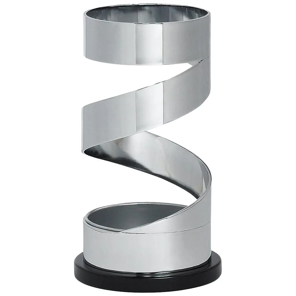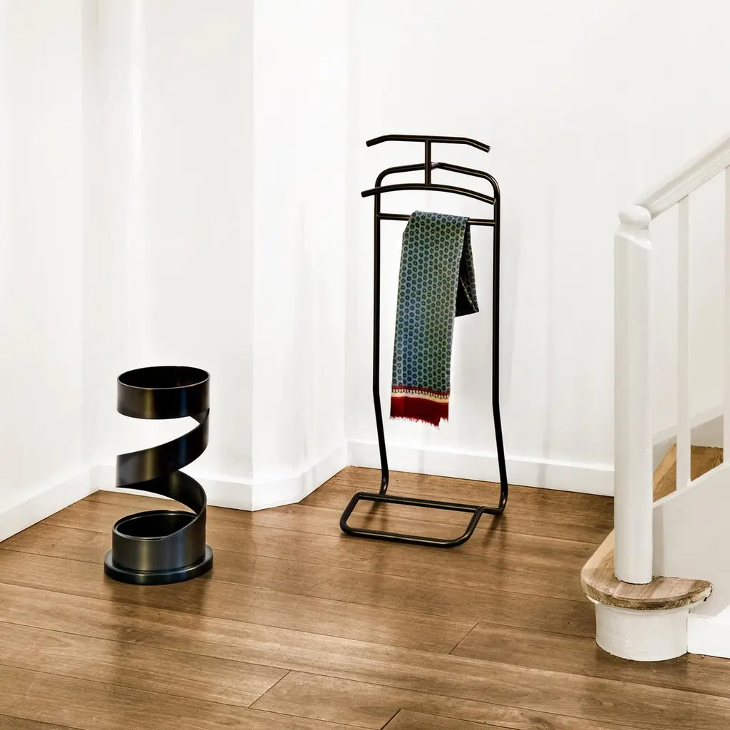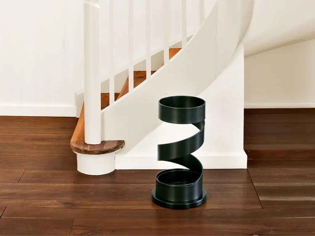 It is a sign of a most mature culture when articles of everyday use also come to catch the aesthetic eye. Coiling upwards like a snake at a snake-charming is Eckart Muthesius‘ spiral-shaped umbrella stand Usha, created for the exotic fairytale palace of the Maharajah of Indore. By now it has found favor in regions all over the world where umbrellas are part of everyday life. Base of wood painted black with satin gloss finish.Dimensions: W 28 cm, H 50 cm.