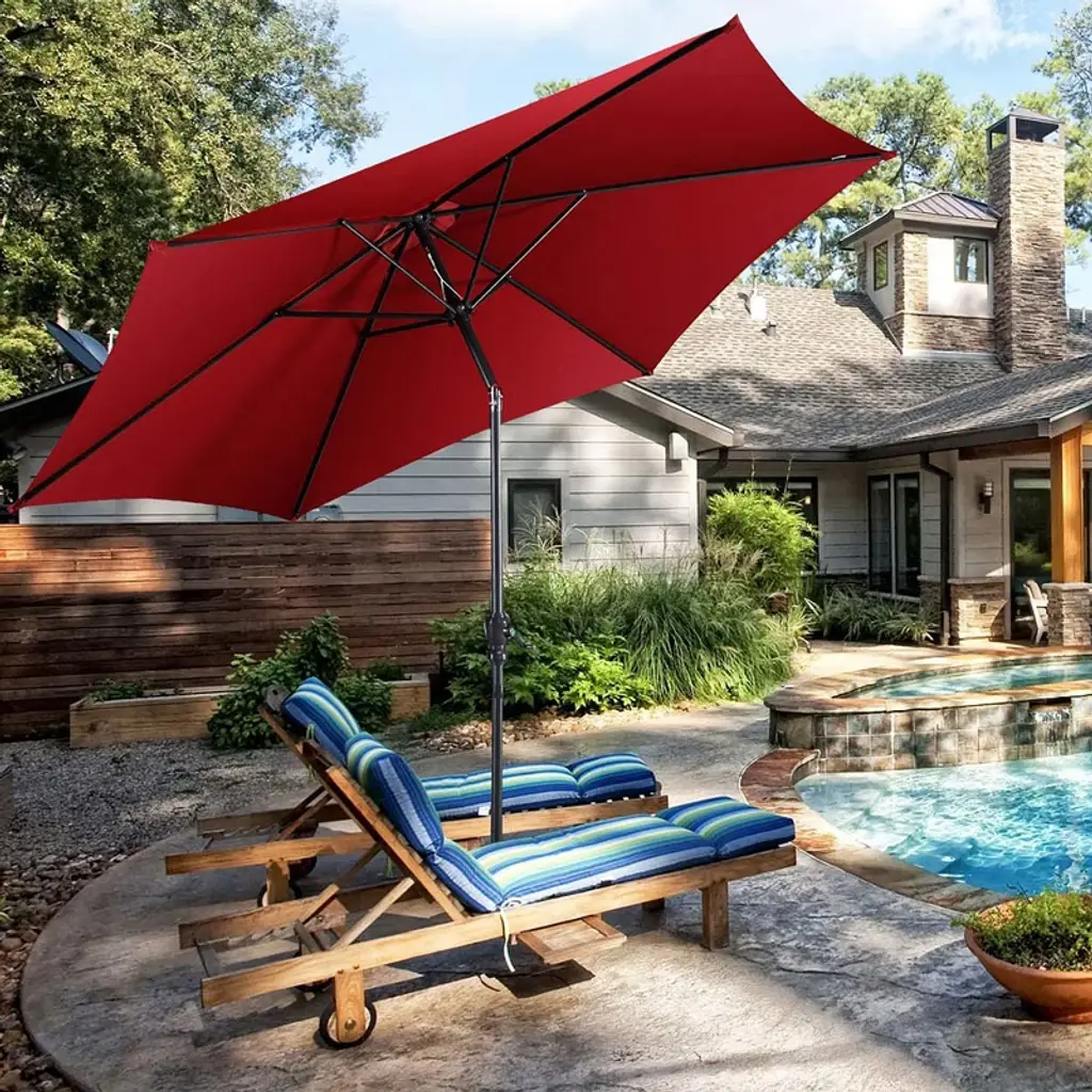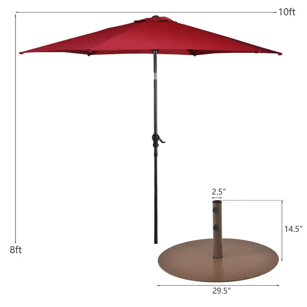 Enjoy leisure time with this patio umbrella. Designed with modern appearance, it will be a perfect addition whether for family or commercial. It can be used in all weather with the large umbrella cover of 10” to resist both sun and rain. As it is tilting, there is no illumination discomfort. Combined with the crank lift system, it will be much easier to use. The push-button tilt adds longevity to your umbrella by separating the tilt feature from the handy open/close crank. And a 59lbs umbrella stand can keep the umbrella stable when using it. Thanks to the simple structure, our umbrella is convenient to disassemble and assemble. FeaturesIncluding a 10ft market umbrella with a heavy-duty 59lbs umbrella stand Large sunshade area with 10' umbrella cover Easy raising and lowering with crank lift system Strong construction with 6 firm ribs Vented canopy for air circulation Easy to assemble and disassemble Light weight for convenient transport Space saving with compact design Suitable for garden, patio, deck, backyard and marketMaterial: Polyester Cloth, Steel Color of umbrella: Beige, Wine, Tan, Blue, Orange Color of umbrella stand: Brown Dimension of base stand: 29.5'' x 29.5'' x 14.5'' (L x W x H) Dimension of umbrella:10'x 8'(DiaxH) Pole size of umbrella: 1.5” (Dia) Pole Holder Size for umbrella stand: 1.4'', 1.5'', 1.9'' Rib Number: 6 Net Weight of Umbrella Stand: 59lbs Net Weight of Umbrella: 11lbs Package Includes 1 x Patio Umbrella 1 x Umbrella Stand 1 x User Guide