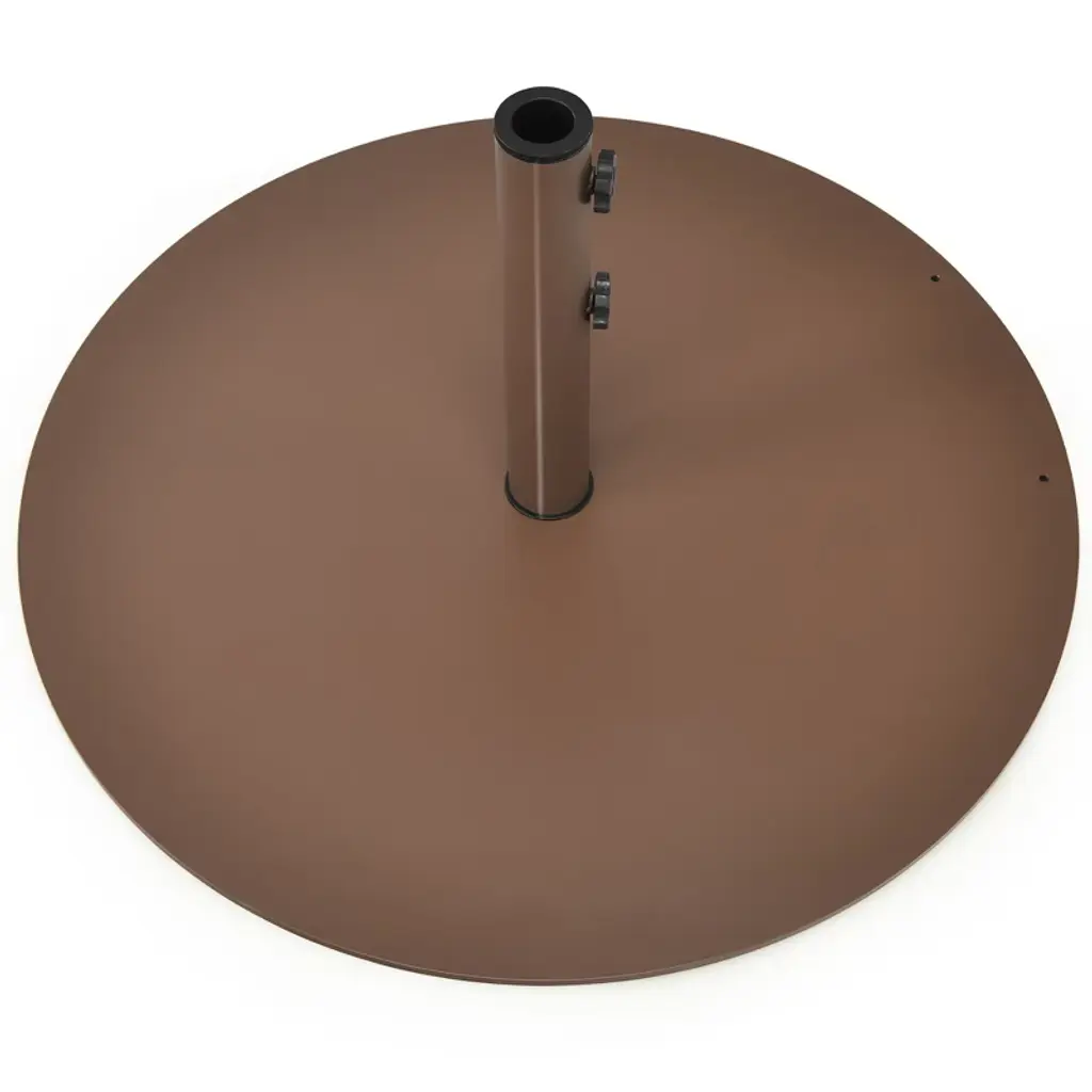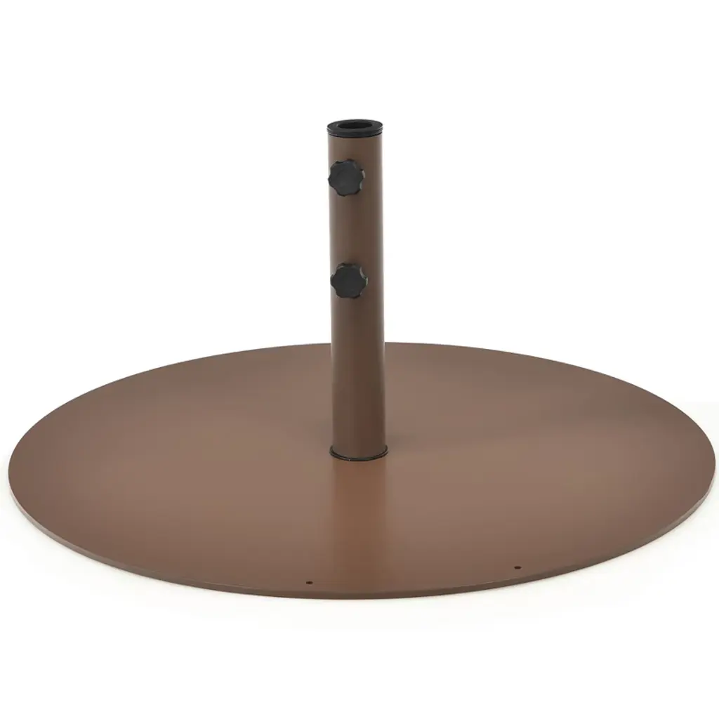 Our umbrella base is your perfect partner helping you to have more enjoyable outdoor time. Made of heavy-duty steel frame with powder coating, the umbrella base is not easy to rust, chipping and peeling for years to come. With 2 hand tightening knobs, the umbrella stand offers a secure grip for tightening the position of the umbrella pole in windy conditions. The umbrella base is compatible with umbrella pole from 1.37” to 1.88”, and it perfectly work with the 1.37”/1.49”/1.88” diameter pole for 3 adapters, making it an ideal choice for balcony, poolside, backyard, etc.FeaturesSolid metal frame for long service time Stable enough to ensure the umbrella safety in windy conditions 50lbs weight is heavy enough to support umbrella Can be used with freestanding umbrella or under the patio table Fit to a 1.37”/1.49”/1.88” diameter umbrella poles because of 3 adapters 2 hand tightening knobs to tighten the position of umbrella Suitable for garden, poolside, backyard, balcony, etc Easy to assemble with detailed instructionColor: Brown Material: Steel, Plastic Overall Dimension:φ29.5" x 29.5"(W) x 14.5" (H) Diameter of Poles: 1.37"/1.49"/1.88" Net Weight: 59lbs Package includes: 1 x Umbrella Base 1 x User Guide