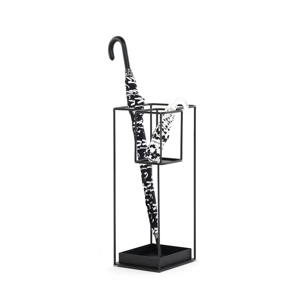 Duo designed by Carlo Contin is an umbrella stand made of black painted metal. It is a useful accessory with simple lines where you can place both the classic umbrella and the folding one.