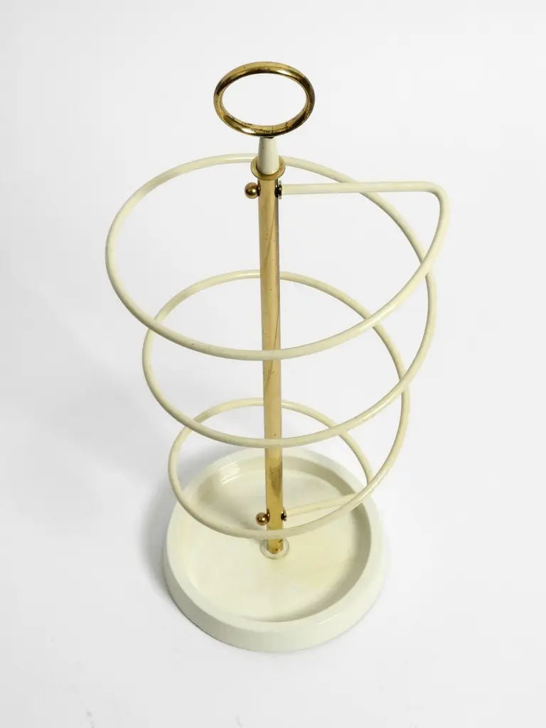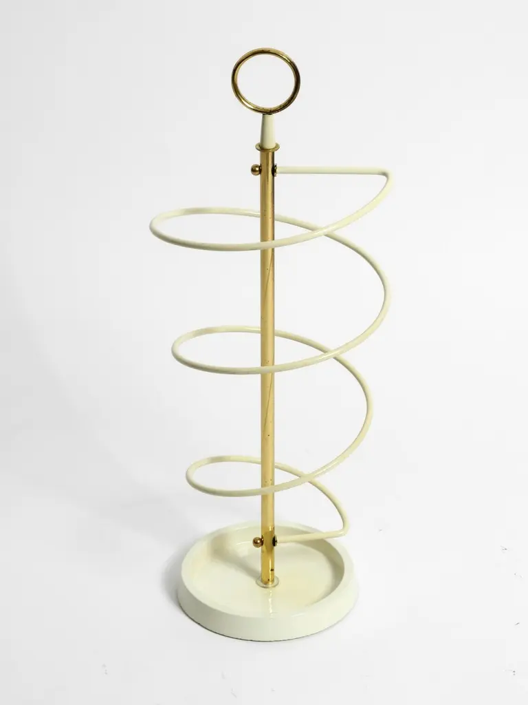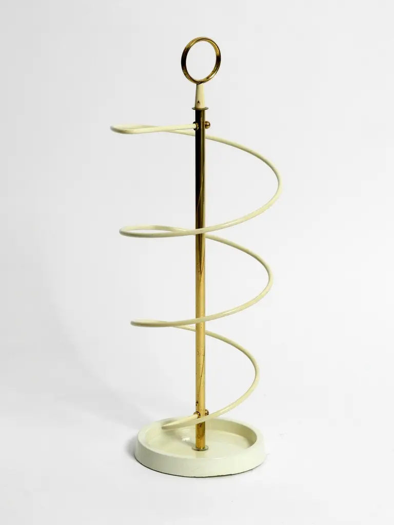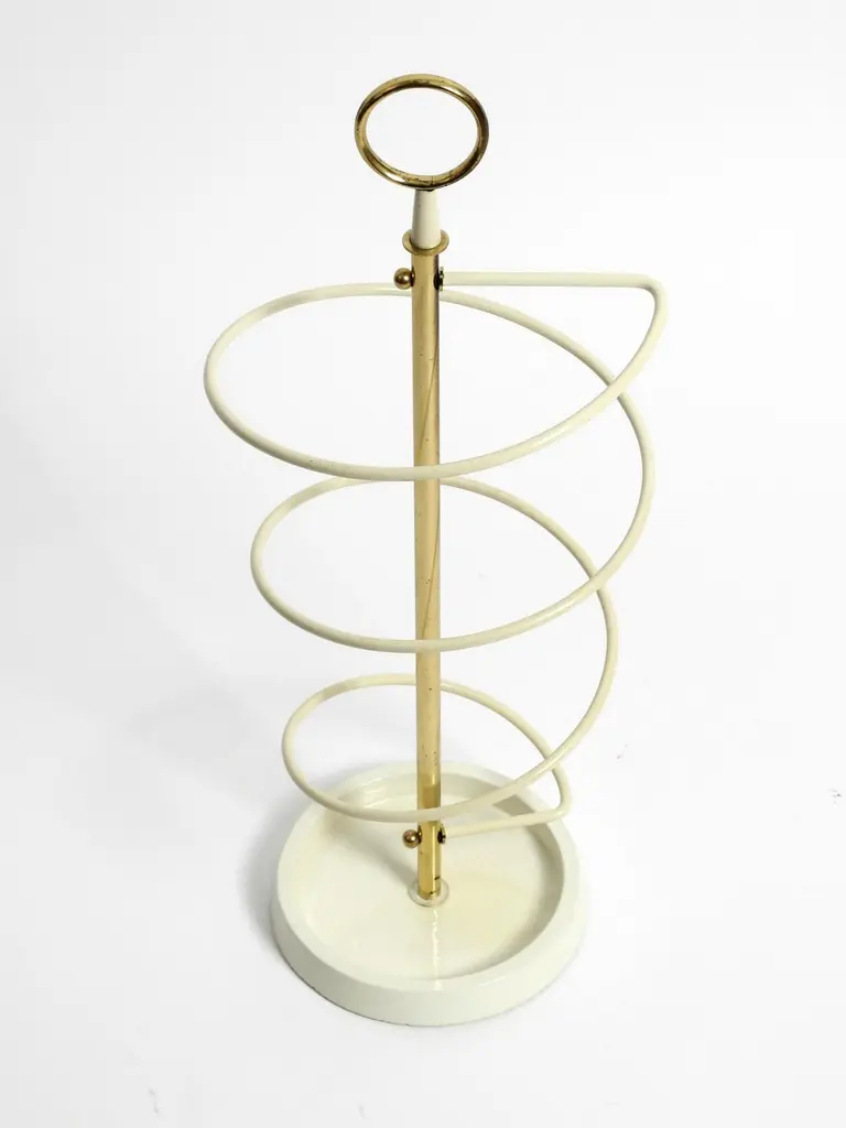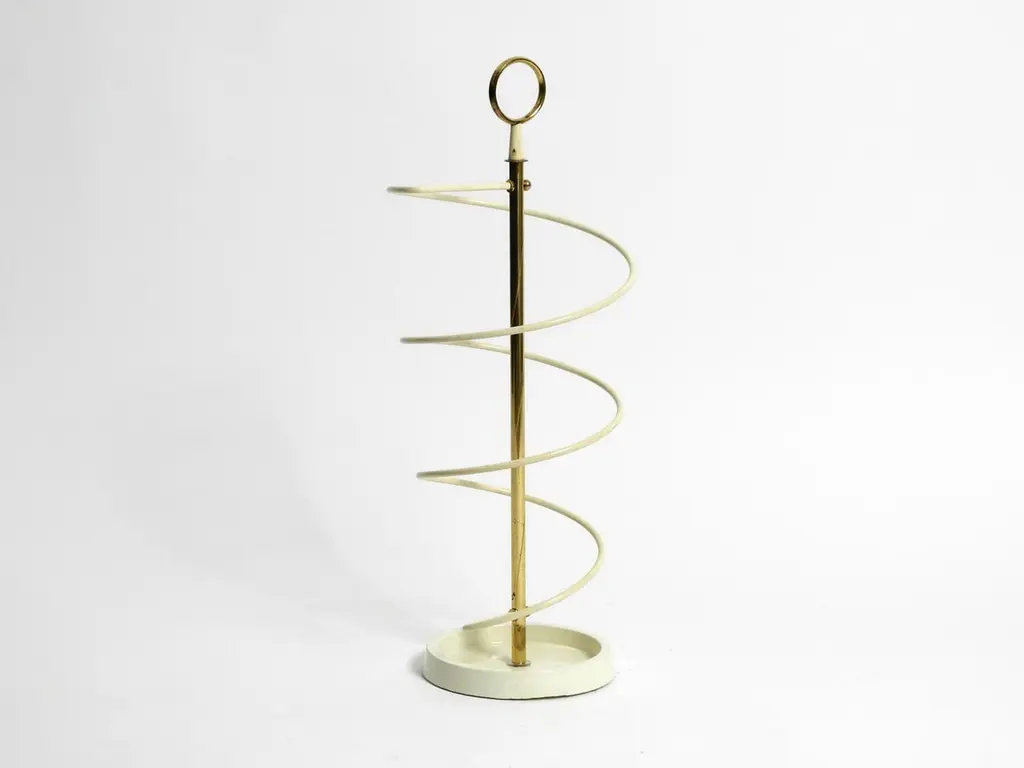 Exceptional rare Mid-Century Modern umbrella stand.Very elegant minimalist string spiral design.The base is made of cast iron and the metal spiral has a plastic coating.The round handle is made of brass.Very good condition without damages with minimal signs of wear.Only the cast-iron base was professionally prepared and repainted in the same color.Nice patina, no damage.100% original condition and very decorative.Measures: Height: 53cm 20.9"Metal spiral diameter: 21 cm 8.3"Diameter base: 16.5 cm 6.5".