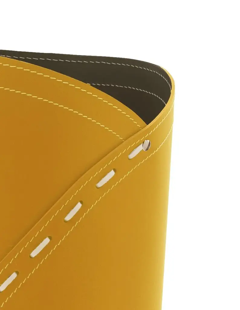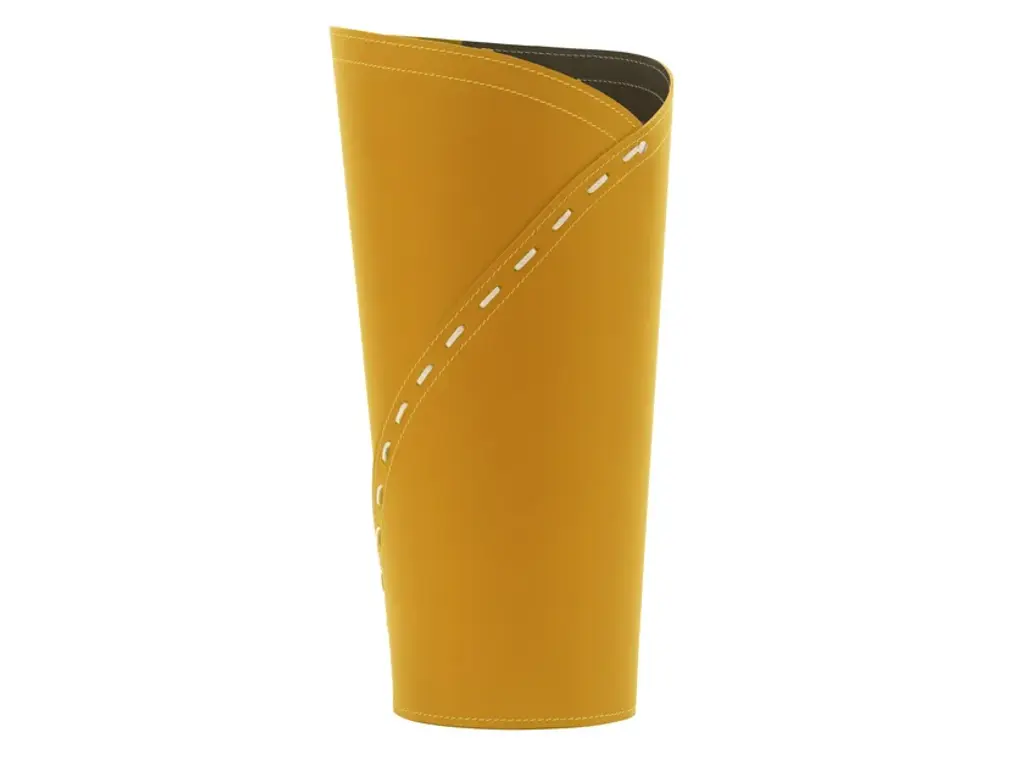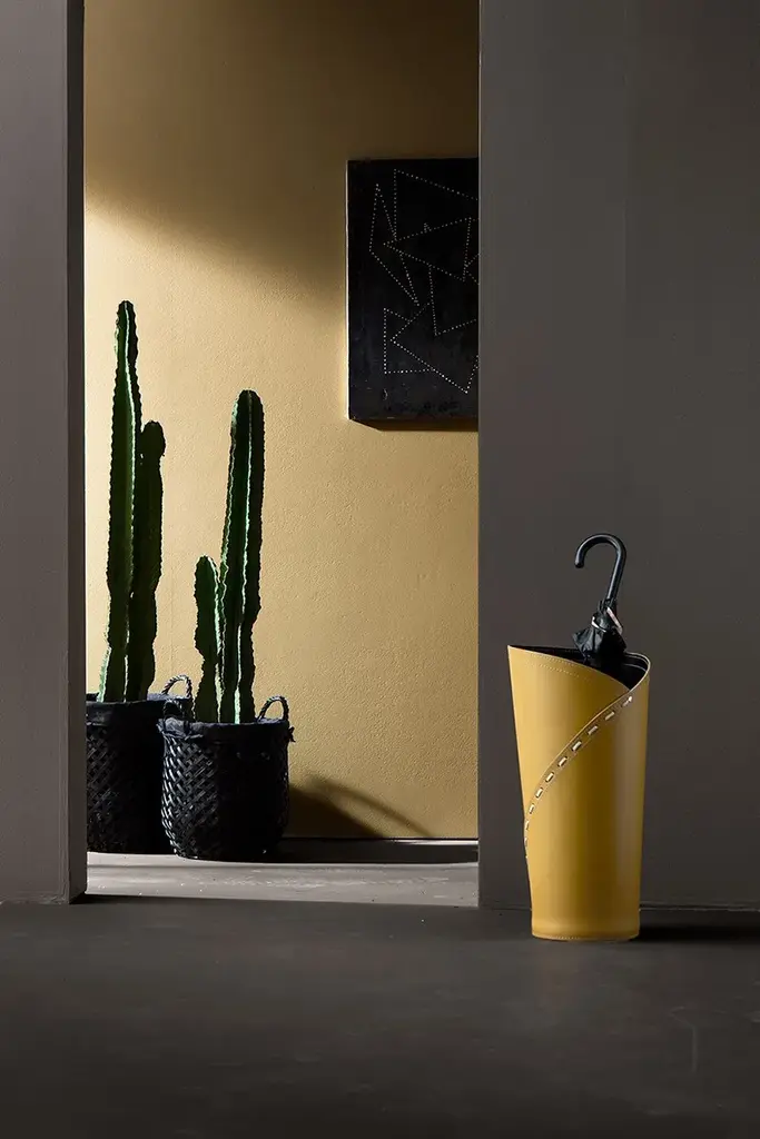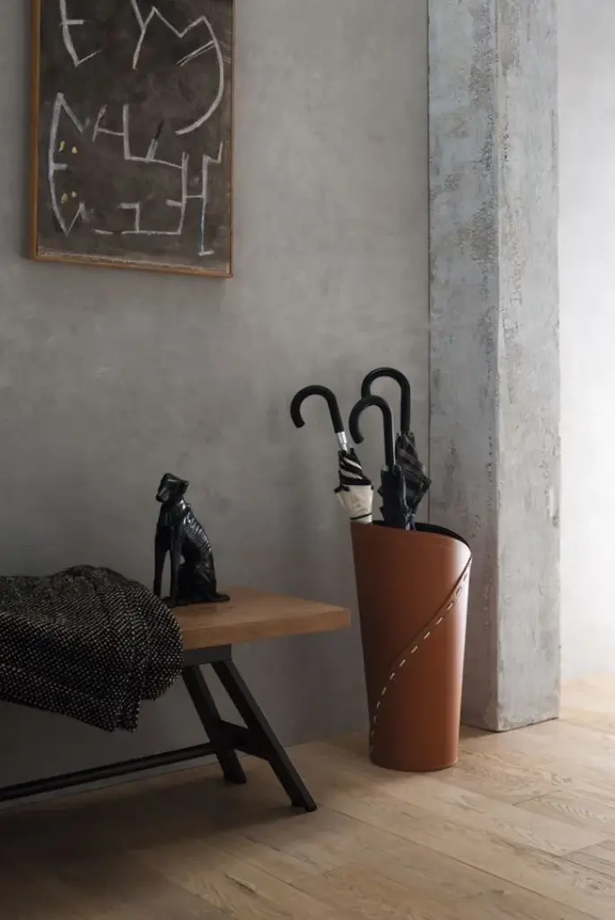 Umbrella holder of regenerated leather on plywood frame, fitted with drip collector of plastic material.