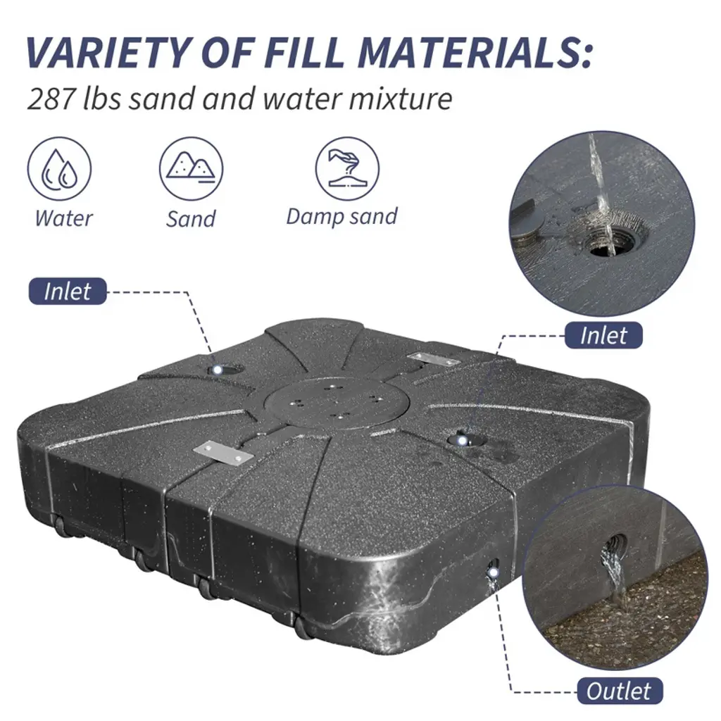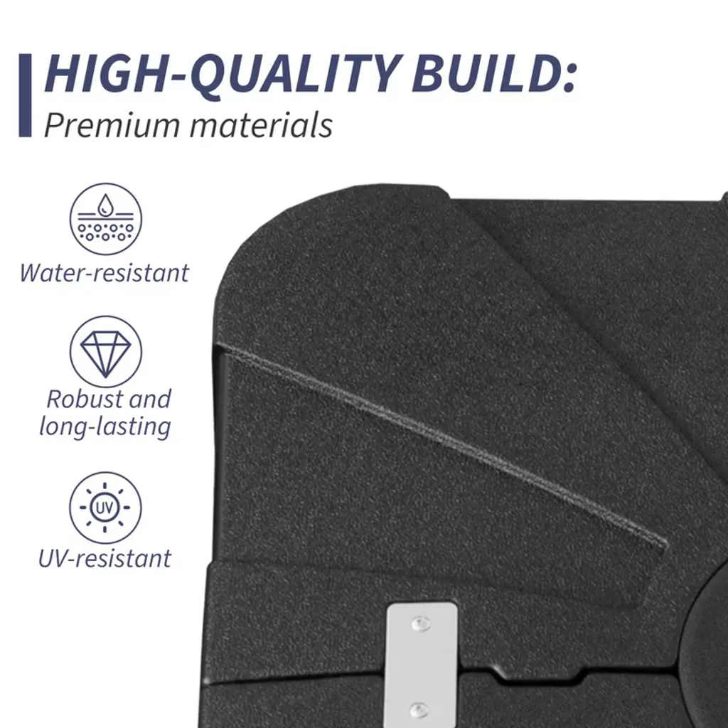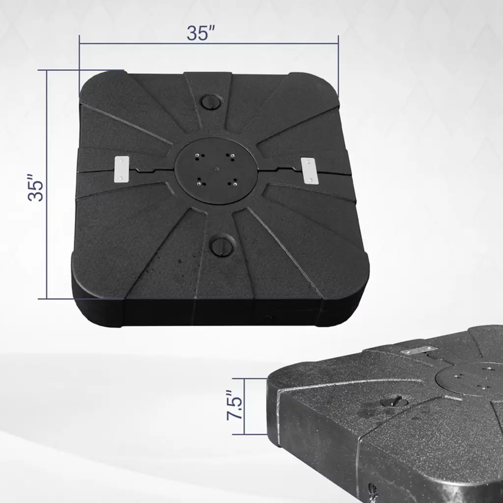 This premium umbrella base with wheels features a massive 260LBS fill capacity, providing exceptional stability for your outdoor shade solutions. The patio umbrella base is constructed from high-density resin that resists cracking and fading in all weather conditions. Measuring 35" x 35" x 7.5", this outdoor umbrella base offers generous space for water or sand filling to secure your cantilever umbrellas. Four smooth-rolling wheels make this umbrella stand outdoor base effortlessly movable across any surface. The integrated fill/drain system with two large ports ensures quick and easy setup of your patio umbrella stand. Designed for both functionality and style, this black square umbrella holder complements modern outdoor furniture perfectly.