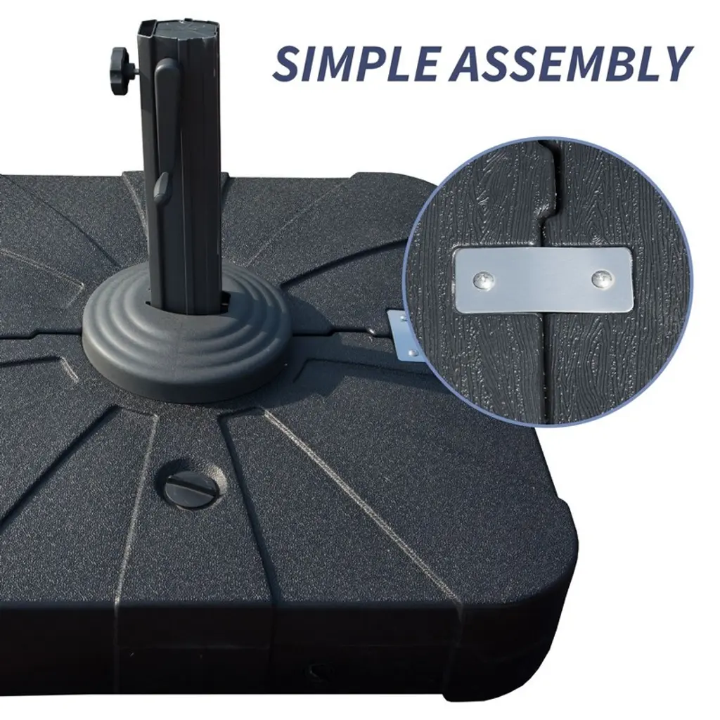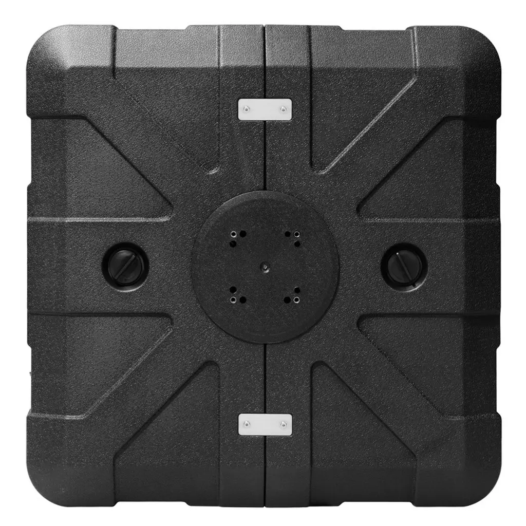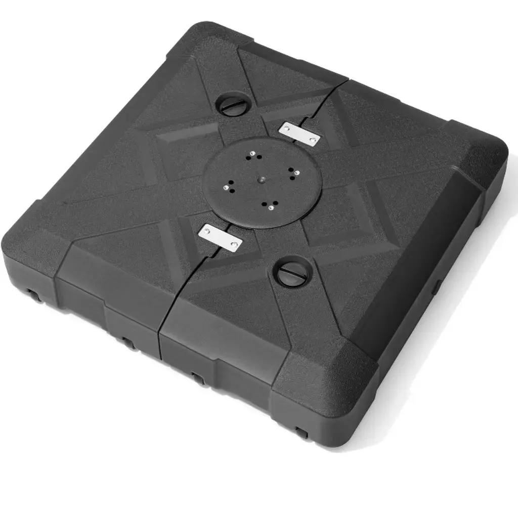 This premium umbrella base with wheels features a massive 260LBS fill capacity, providing exceptional stability for your outdoor shade solutions. The patio umbrella base is constructed from high-density resin that resists cracking and fading in all weather conditions. Measuring 35" x 35" x 7.5", this outdoor umbrella base offers generous space for water or sand filling to secure your cantilever umbrellas. Four smooth-rolling wheels make this umbrella stand outdoor base effortlessly movable across any surface. The integrated fill/drain system with two large ports ensures quick and easy setup of your patio umbrella stand. Designed for both functionality and style, this black square umbrella holder complements modern outdoor furniture perfectly.