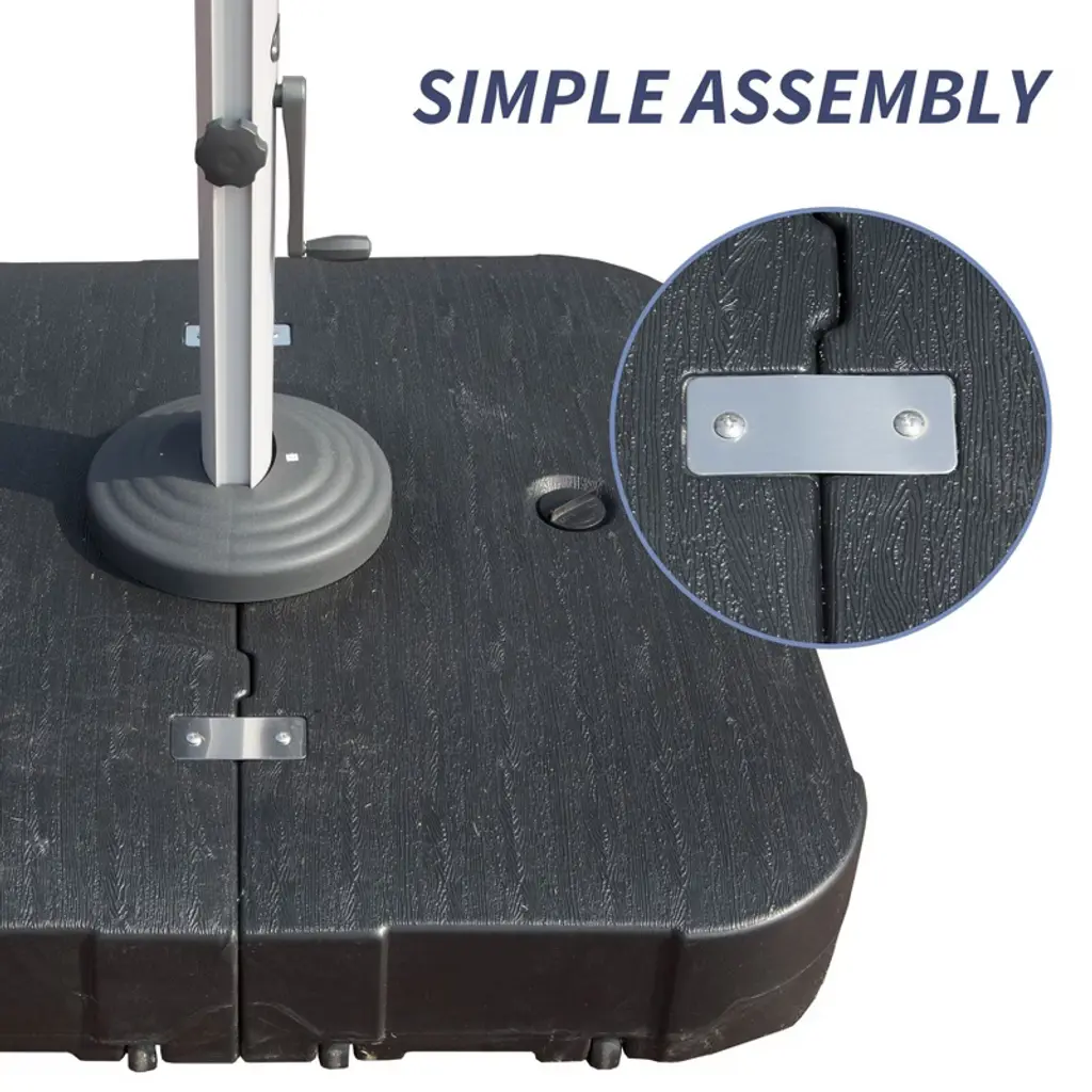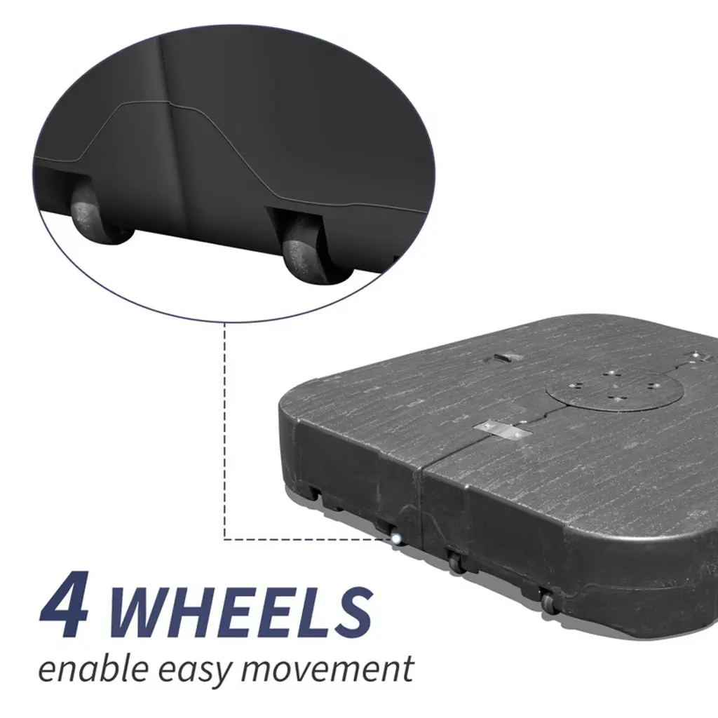 This premium umbrella base with wheels features a massive 300LBS fill capacity, providing exceptional stability for your outdoor shade solutions. The patio umbrella base is constructed from high-density resin that resists cracking and fading in all weather conditions. Measuring 38.6" x 38.6" x 7.1", this outdoor umbrella base offers generous space for water or sand filling to secure your cantilever umbrellas. Four smooth-rolling wheels make this umbrella stand outdoor base effortlessly movable across any surface. The integrated fill/drain system with two large ports ensures quick and easy setup of your patio umbrella stand. Designed for both functionality and style, this black square umbrella holder complements modern outdoor furniture perfectly.
