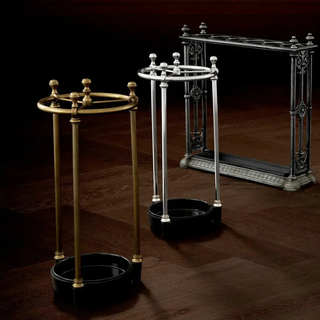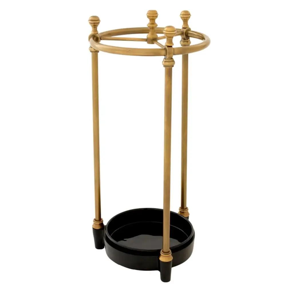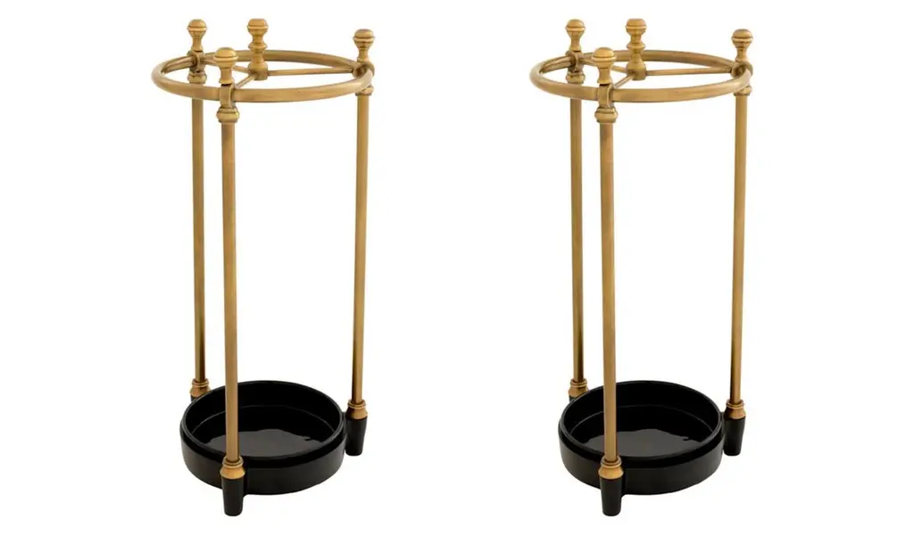 Pair of elegant umbrella stands with a patinated brass finish and black drip tray.Add a touch of boutique hotel chic to your hallway with the glamorous charm of this umbrella stand.Its elegant frame, with an antique brass finish, is composed of 3 sections offering generous storage space for up to 6 umbrellas. A practical black drip tray underneath protects your hallway floor from water and residue and is easily removable for cleaning.Ø 26.5 H. 60 cm