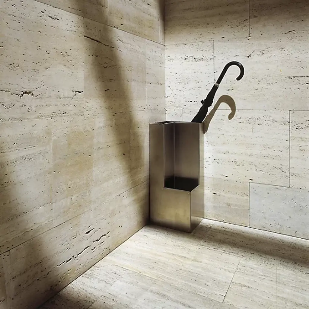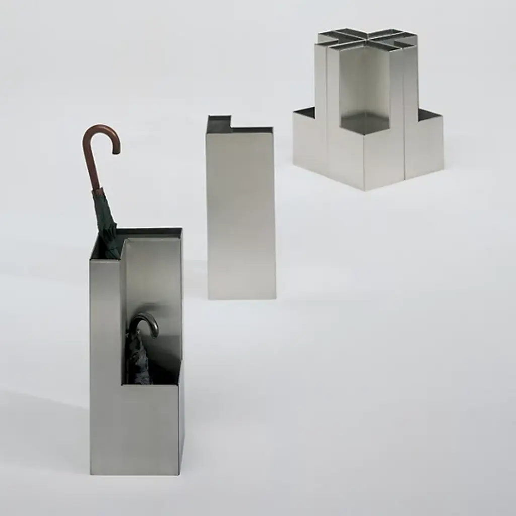 Add a bold-ultra-modern accompaniment to interior spaces with the Plec Umbrella Stand from BD Barcelona. Ideal for rainy days, it’s an excellent place to store umbrellas or walking sticks by the door and features a polyester foam base to soften its interior. It’s explicitly designed by Isabel Gamero and Jordi Pérez to make the most of overlooked corner spaces that would otherwise go to waste and is crafted of smooth stainless steel, showcasing a double-container construction with a square frontal space for shorter umbrellas and a taller, corner-shaped section for full-size umbrellas. The stand can play well in residence or commercial spaces as individual instances, or placed together in an array of four stands, creating a cross-shaped plinth with ample structural depth and functionality.