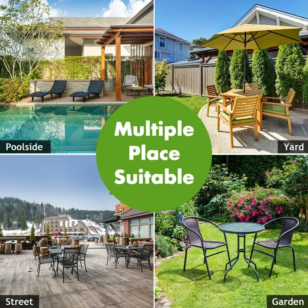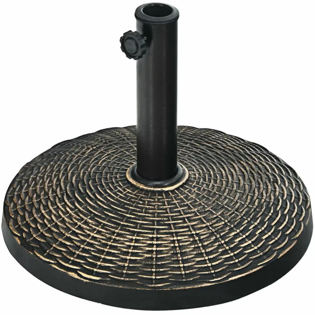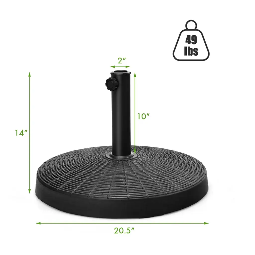 Enjoy outdoor leisure time with our attractive umbrella base! It is made of selected resin and steel, which is not easy to rust, crack and deform for years to come. The umbrella stand features a hand-turn tightening knob to help you secure umbrella to the base, so you can sit under the umbrella safely. Equipped with 2 adapters, the umbrella base perfectly works with 1.5"/1.9" diameter umbrella pole to well suit your different needs. It is an ideal choice for commercial use, such as concession stand, craft fairs, flea markets, etc. In addition, you can also use the base with umbrella for family gathering or backyard barbecue with your friends. FeaturesSelected resin material for long service time Weighing 49lbs, it ensures stability in windy conditions Can be used with freestanding umbrella or under the patio table Fit to a 1.5"/1.9" diameter umbrella pole for 2 adapters Fasten the umbrella with hand-turn tightening knob All-weather umbrella base with imitation rattan style Suitable for garden, poolside, backyard, market, etc Easy to assemble with clear instructionSpecifications: Color: Black Material: Resin and Steel Overall Dimension: φ20.5" X 14.5" (H) Diameter of Poles: 1.5"/1.9" Net Weight: 49lbs Package includes: 1 x Umbrella Base 1 x User Guide