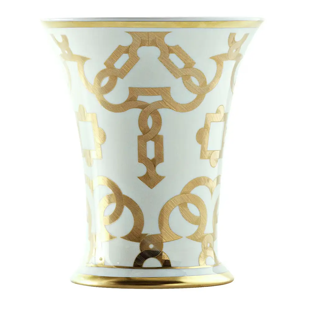 The timeless pairing of pure- white porcelain and prized 24k gold originated this outstanding umbrella stand, perfect to complement total-white decors while adding a further accent of brightness. The 24K gold decorations are arranged in a stimulating, geometry-inspired pattern that results in a perfectly symmetrical order.