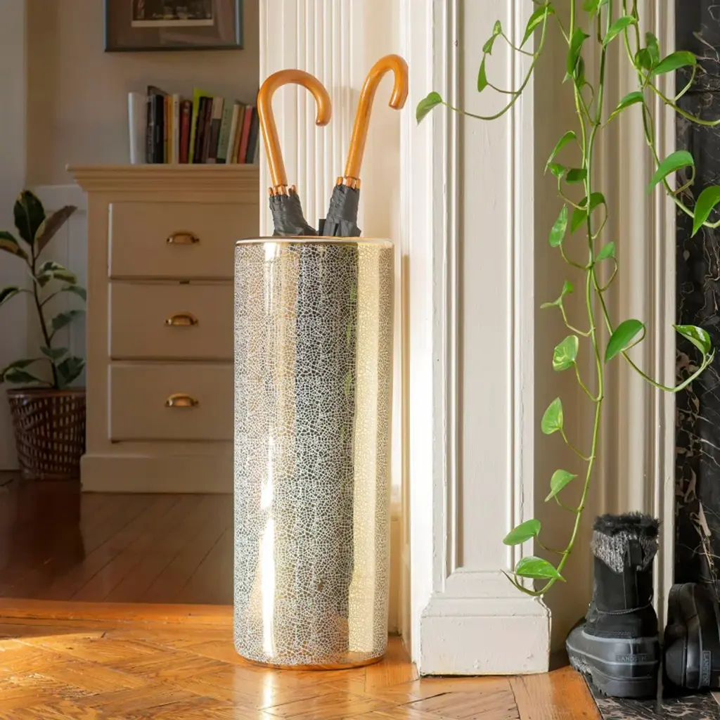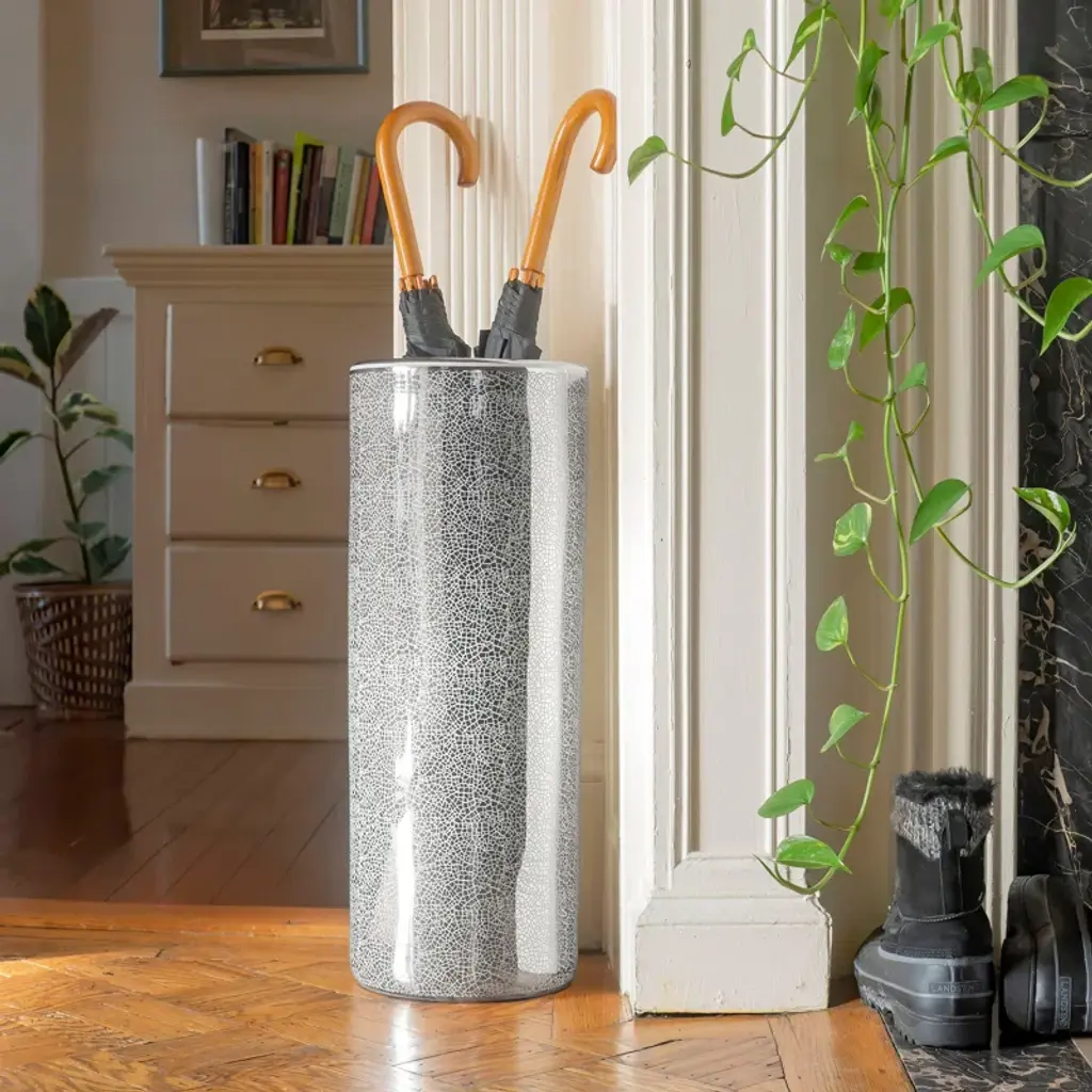 The Oriental Furniture Umbrella Stand can be a great solution for keeping umbrellas organized. This umbrella stand has a cylindrical shape and sports a gloss finish. It has a simple yet elegant design and can accommodate multiple umbrellas at the same time. The Umbrella Stand from Oriental Furniture has a porcelain construction, which makes it sturdy and long-lasting. This stand is available in multiple finishes, giving you the option of choosing the one that best suits your home decor. It can be easily placed in any space and can blend with any style of home decor, adding a modern or contemporary appeal to it. This umbrella stand will help you to keep your umbrellas organized and within reach during rainy or snowy days. It also helps keep the floors dry as it does not let water from damp umbrellas drip onto the floor. This freestanding umbrella stand can be a perfect addition to your home entryway as it will provide you quick access to umbrellas. It is easy to take care of. You can just wipe clean it with a soft damp cloth to keep it looking as good as new for years to come.