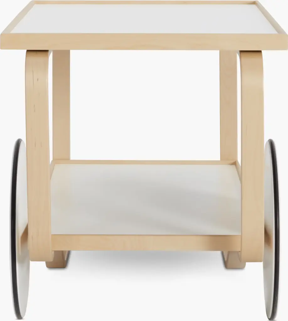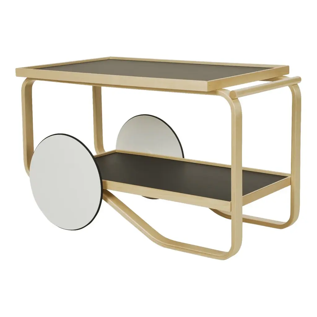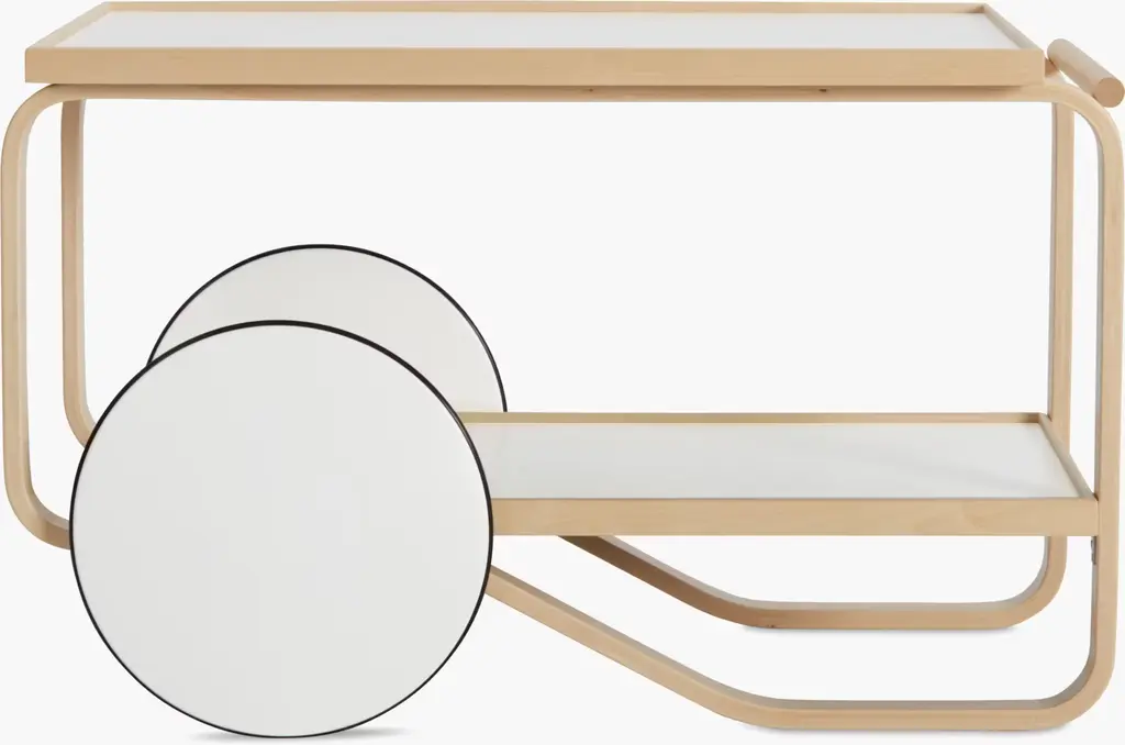 The Aalto Tea Trolley 901 is named for its designers, husband-and-wife duo Alvar and Aino Aalto, two of the four founders of Helsinki-based design studio Artek. Inspired by Japanese woodwork and British tea culture, this trolley features a birch frame and subtly recessed trays with linoleum or laminate surfaces. Contemporary Dutch industrial designer and color expert Hella Jongerius put a tonal twist on the classic cart, resulting in dark and light versions with two-tone trays. Made in Finland.