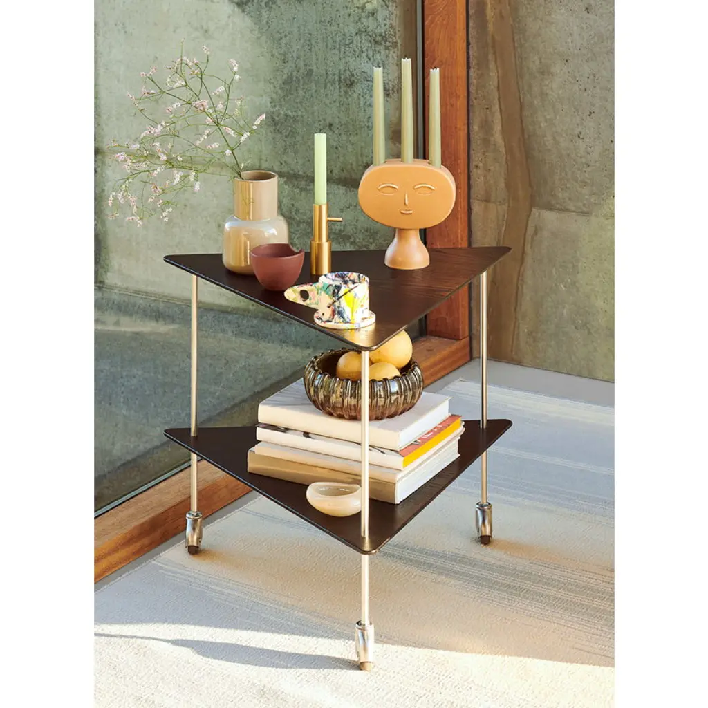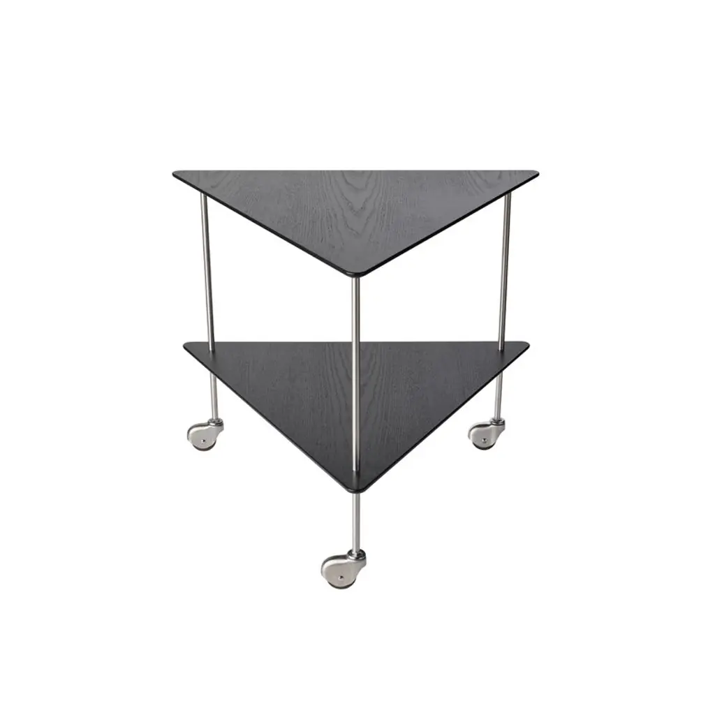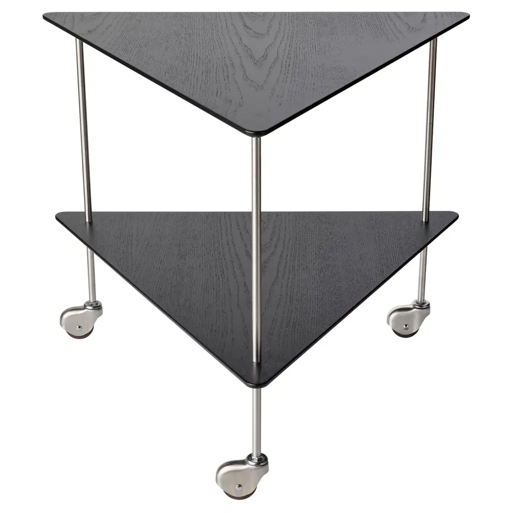 Fritz Hansen’s AJ Trolley consists of a slender metal frame with triangle-shaped ash shelves that can be used for serving tea or displaying your favorite decorative objects. Designed by legendary Danish architect Arne Jacobsen as a tea trolley for his own home, the piece has a distinctively architectural, modern appearance that still looks just as fresh and fascinating as it did back in the 1950s whether used as a practical serving trolley or sophisticated side table.
