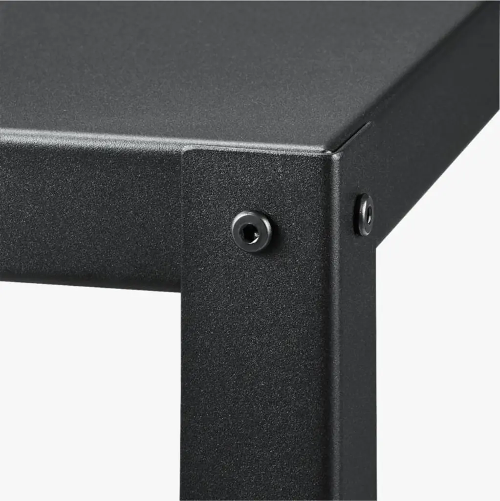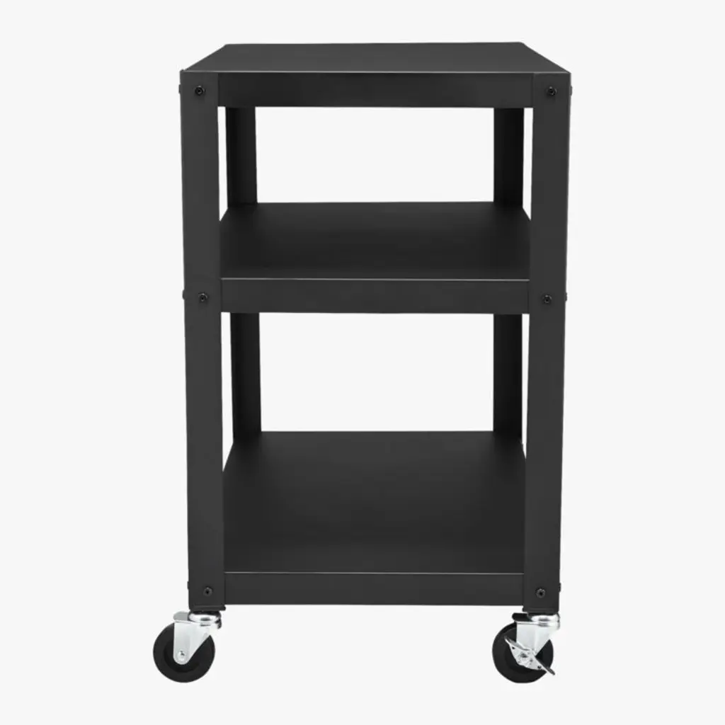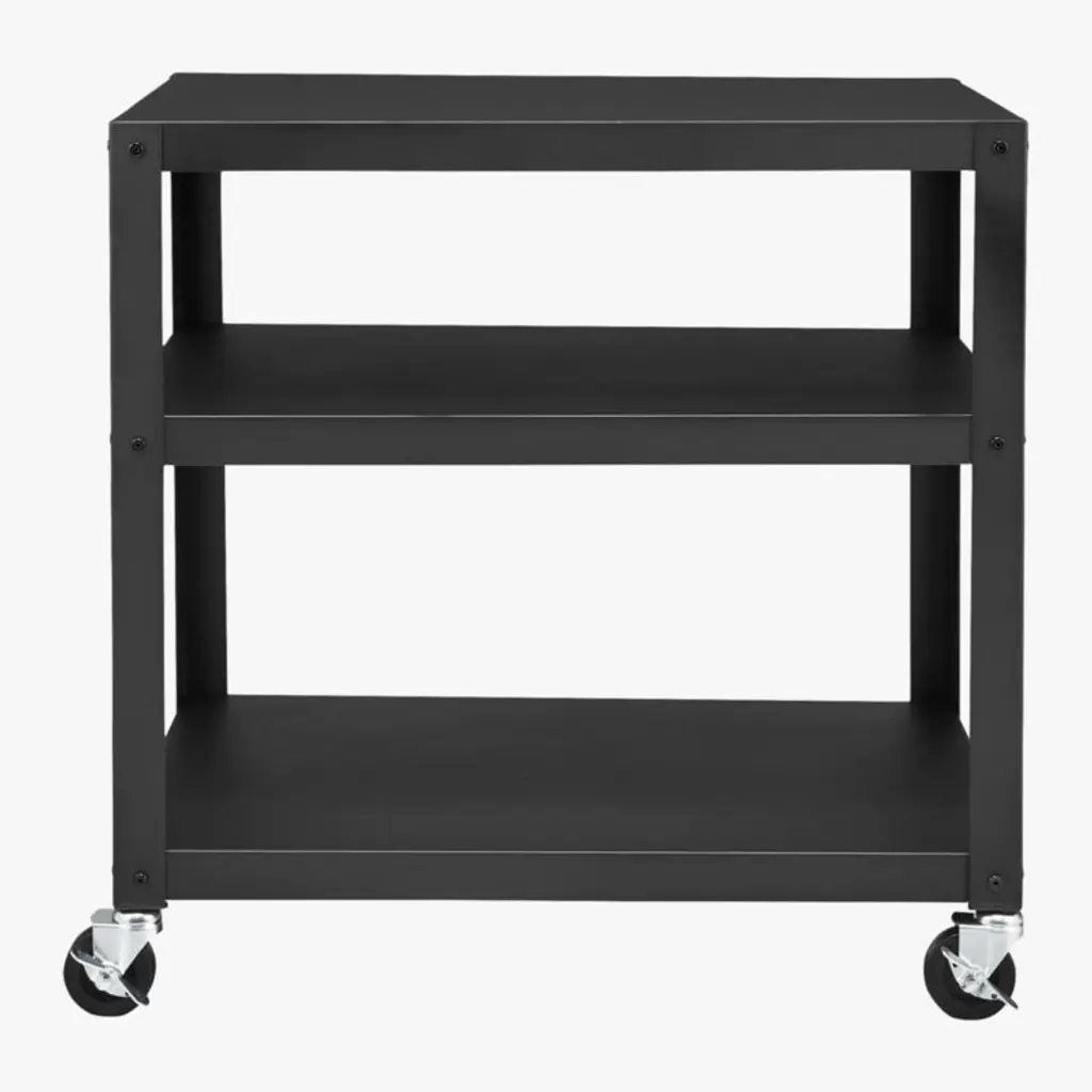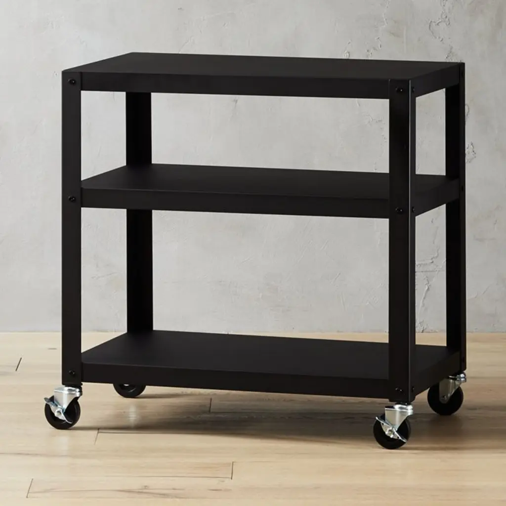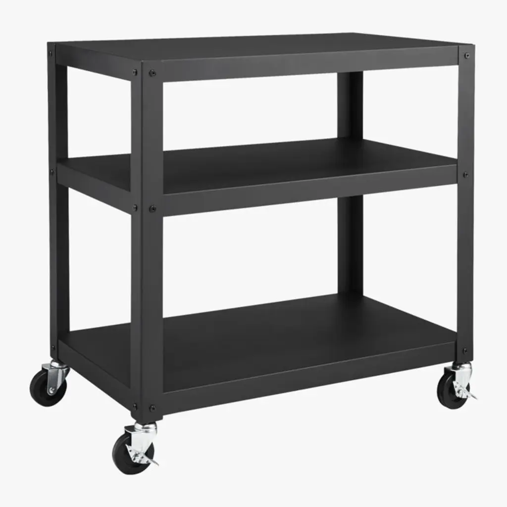 Nifty metal rolling cart in black powdercoated finish rolls into place on four wheels; two wheels lock. Three fixed shelves stash printer, supplies, files. We've also been known to stash towels on it in the bath, microwave and cookbooks in the kitchen. CB2 exclusive.