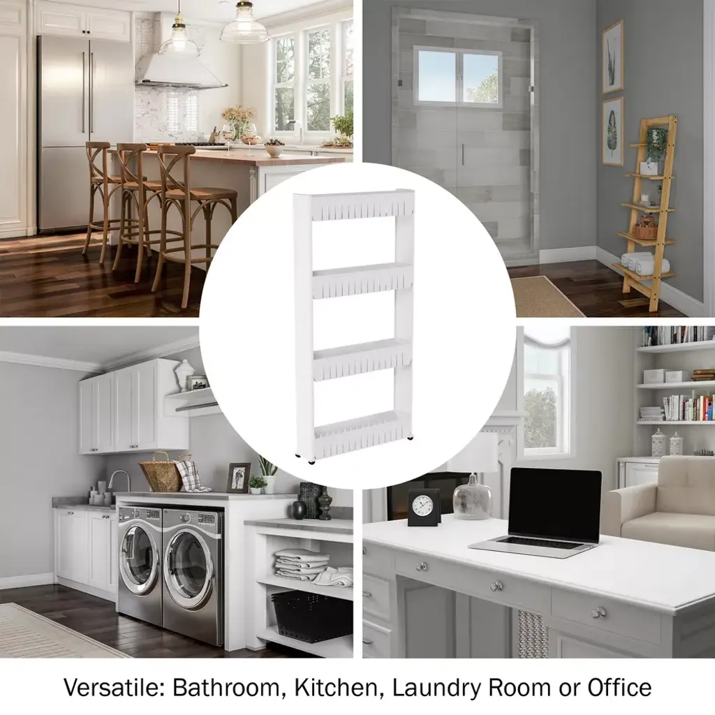 Declutter your space with this 4-Tier Bathroom Storage Organizer Rack by Hastings Home. High-sided shelves with lots of clearance make this rolling cart suitable for laundry room organization, dorm storage, and bathroom storage. Tough construction from easy-to-match white plastic lets this storage car readily support numerous items, including canned goods, spice jars, cooking oils, kitchen cleansers, crafting and sewing supplies, mechanical parts, laundry supplies, and hand tools.
