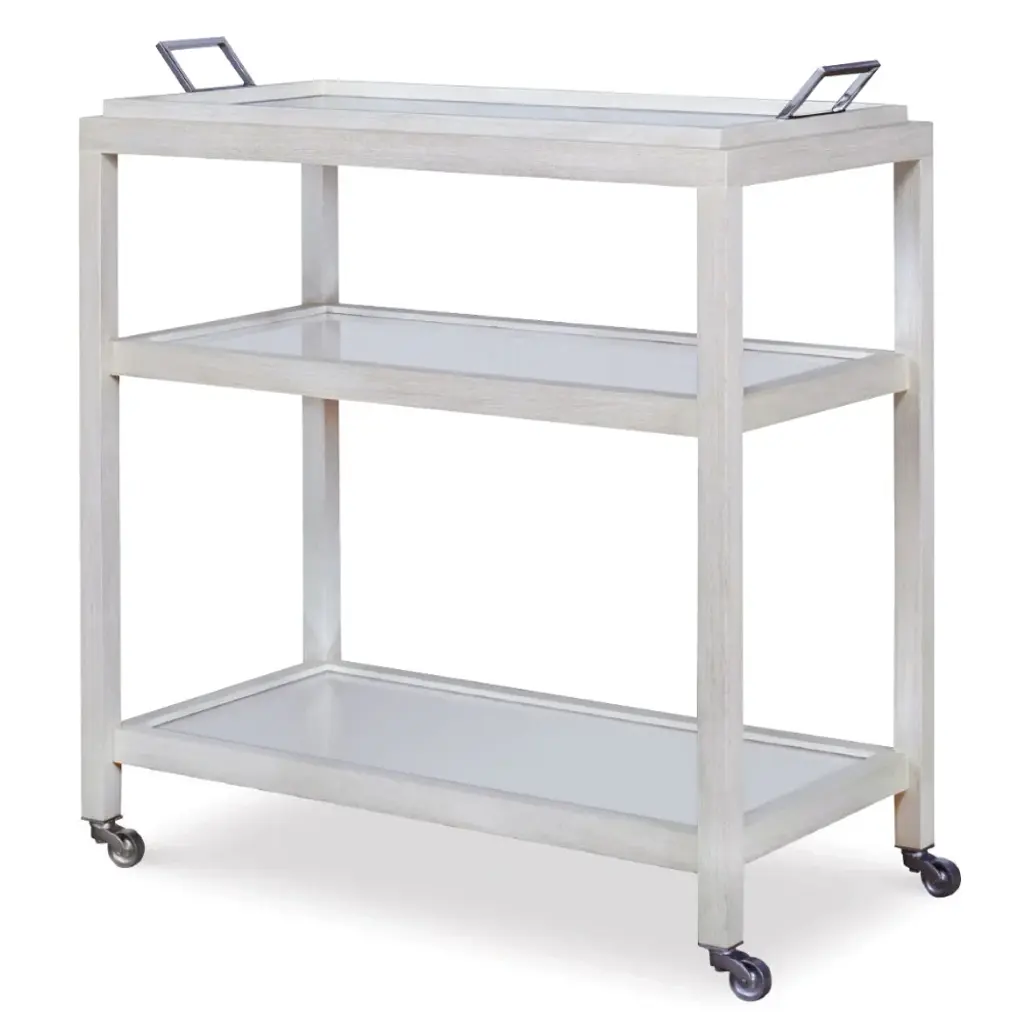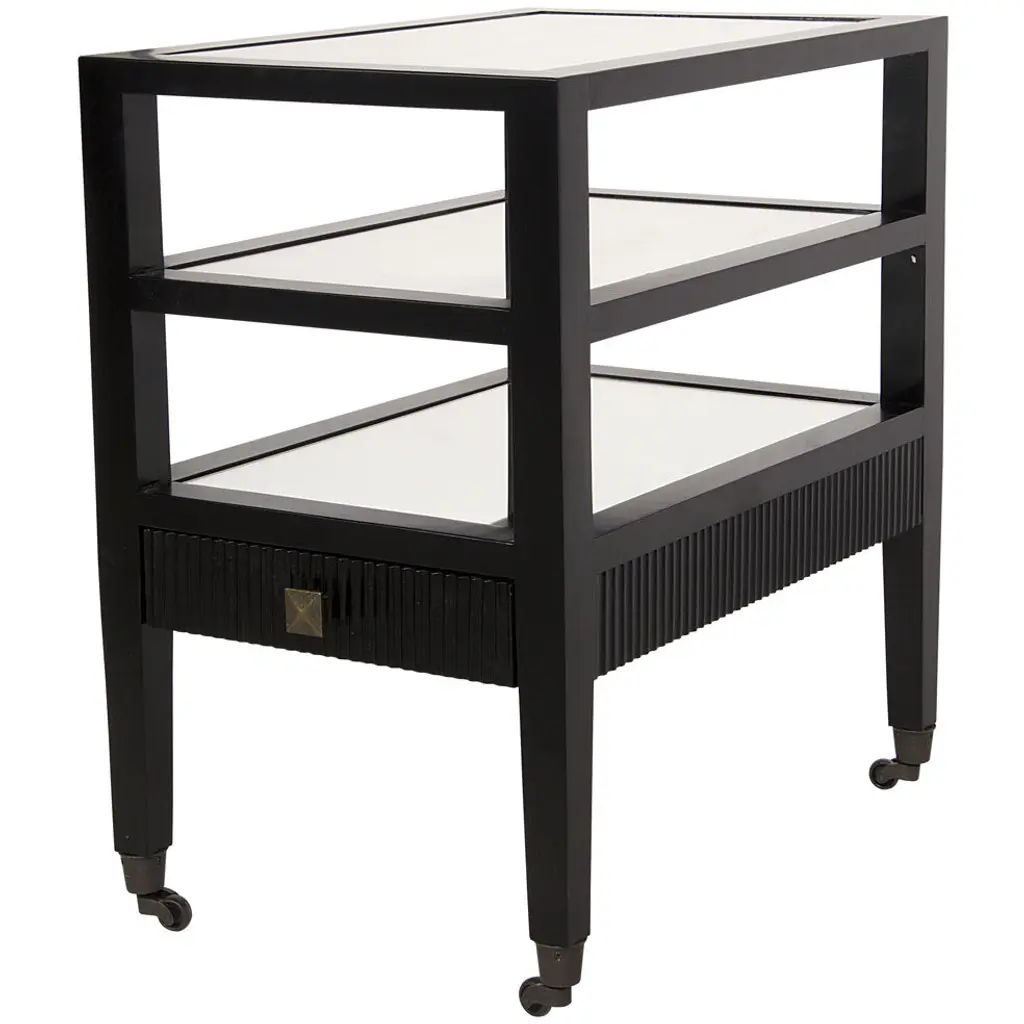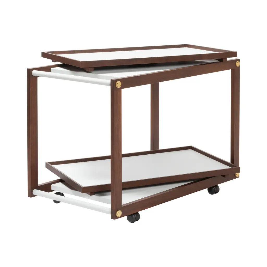Wood structure is available in different finishes featuring fine leather and metal inserts. Provided with two removable trays and omnidirectional wheels. Different walnut wood and metal finishes are available upon request.