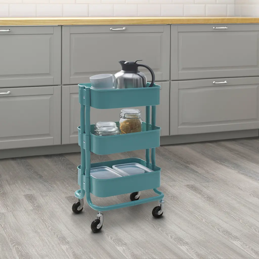 RÅSHULT Utility cart - turquoise 11x15x25 5/8 ". The sturdy construction and four castors make it easy for you to move the trolley and use it wherever you like. It even fits in tight spaces because of its small size. The adjustable middle section is easy to move to adapt to different storage needs.
