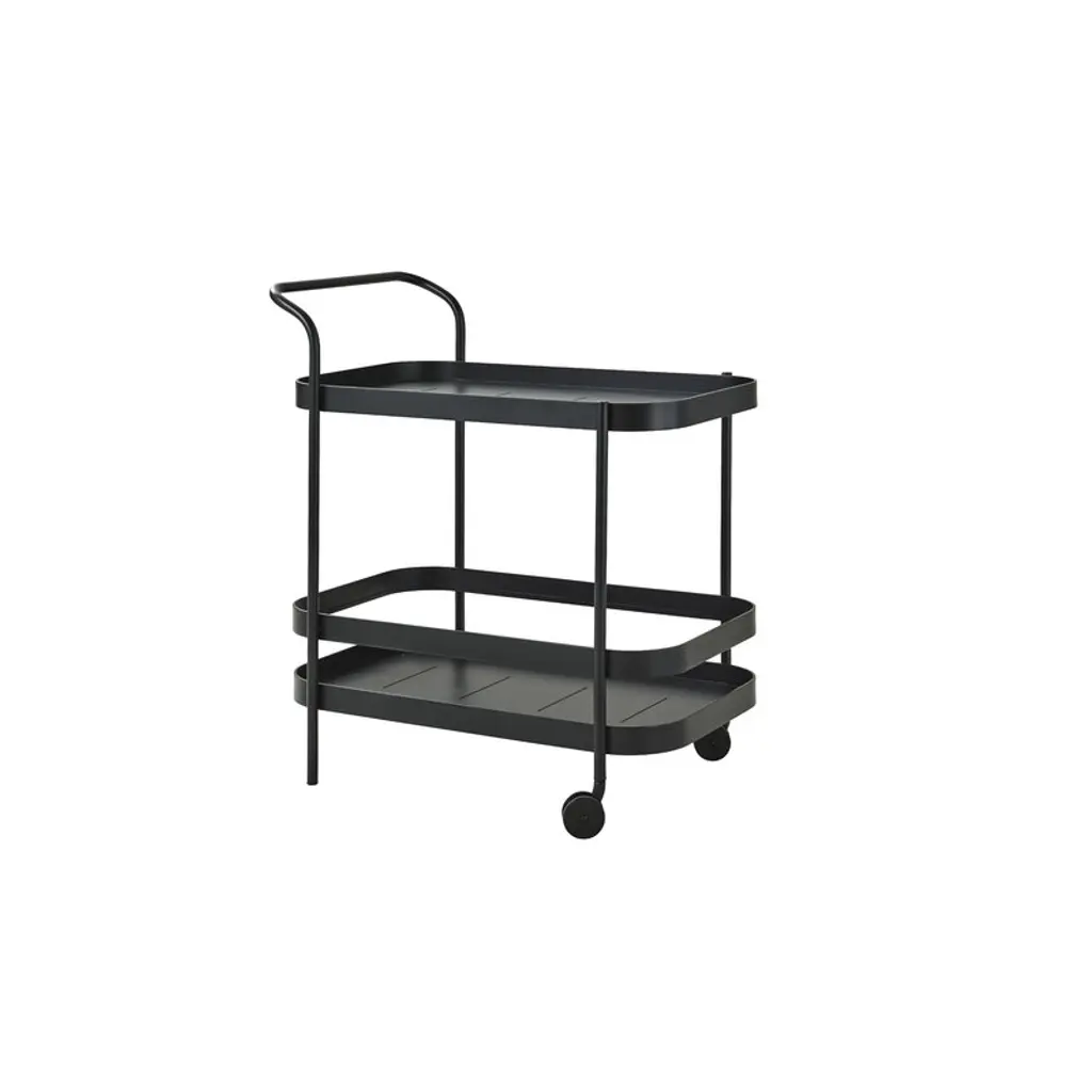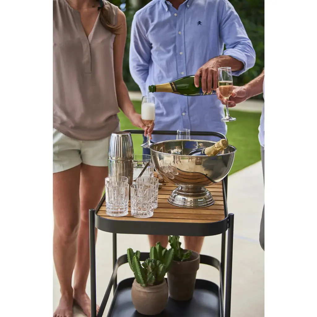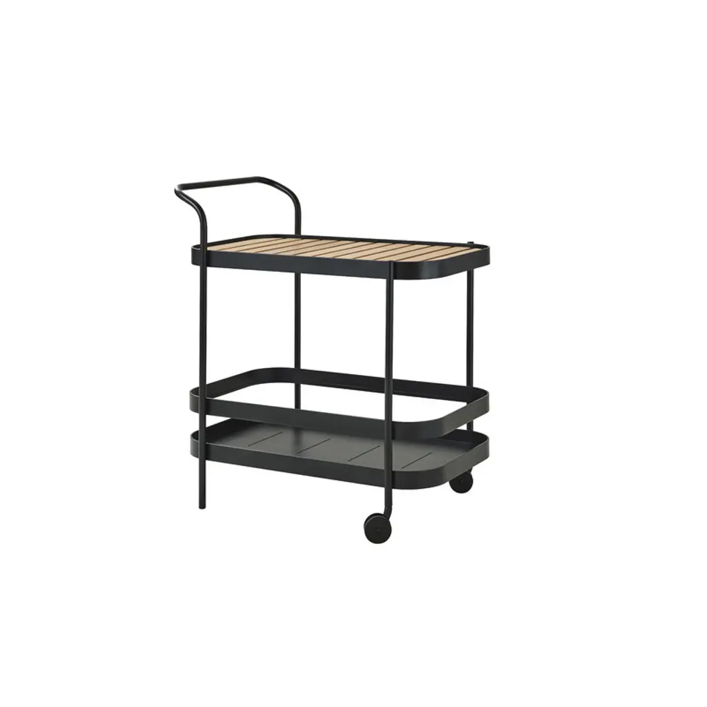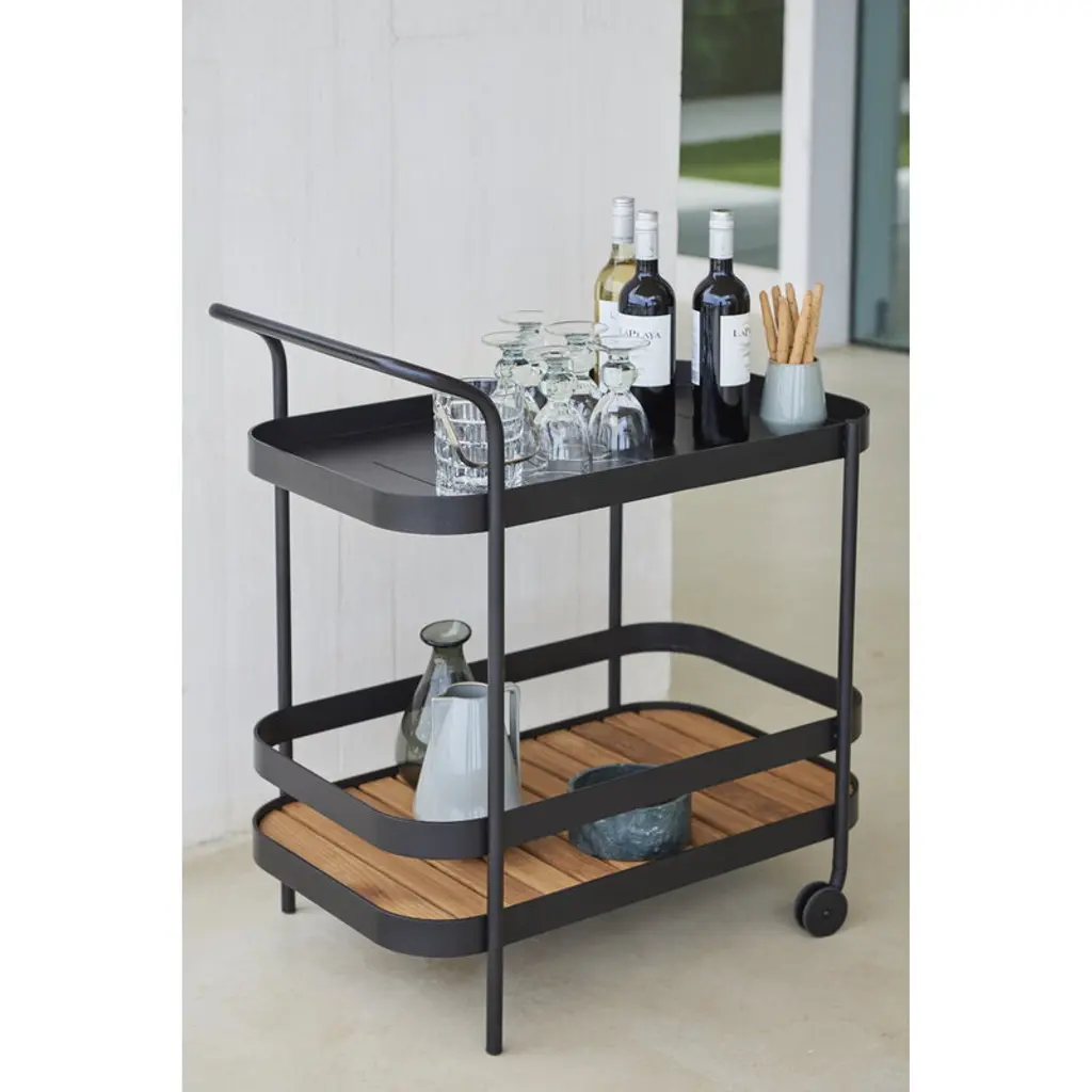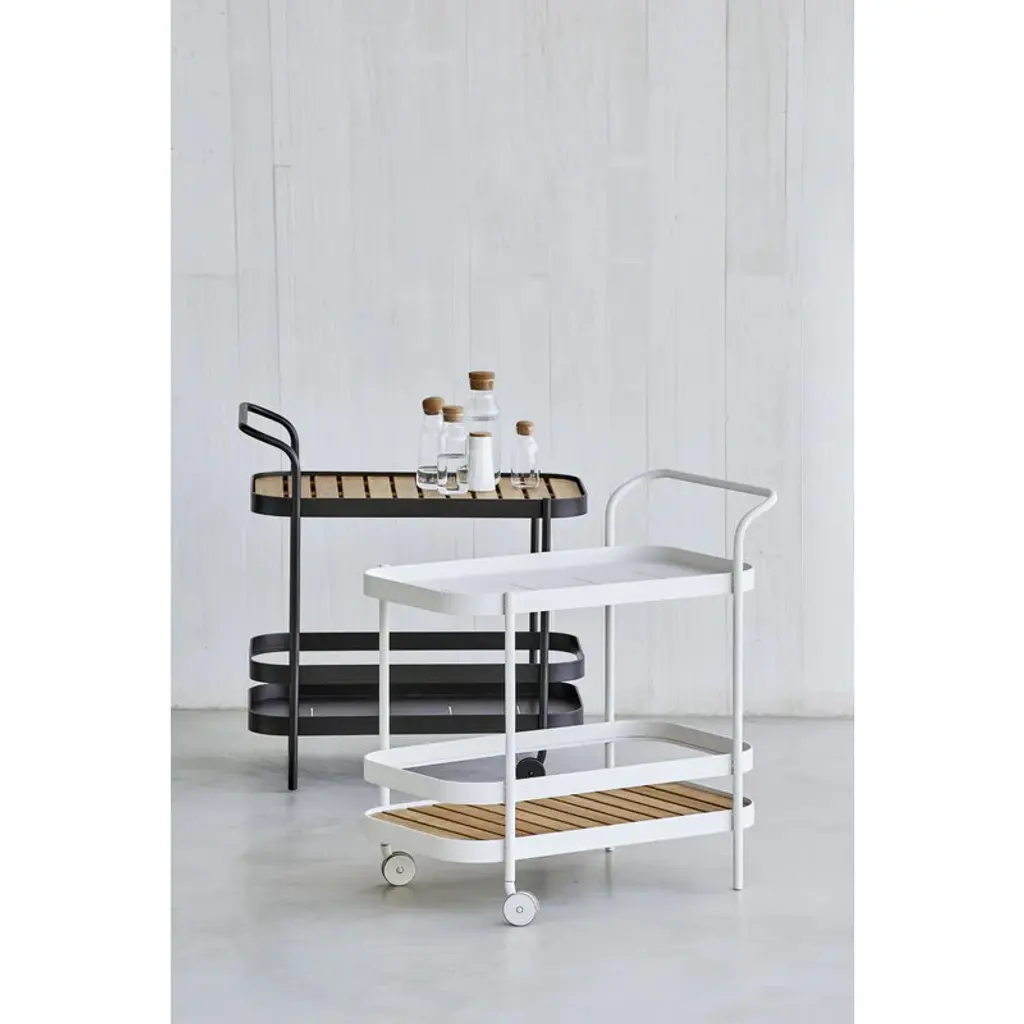 The Roll bar trolley, designed by Welling/Ludvik for Cane-line, is a modern and multifunctional piece of outdoor furniture that will easily blend into a variety of spaces for a variety of purposes. Due to its durable yet lightweight aluminum frame, Roll is a great option for the patio or garden, but can just as well be placed in the kitchen or living room. The removable teak plate allows you to change the look of the trolley in an instant – place it up, move it down or remove it altogether. The nifty feature also makes cleaning the trolley easier.