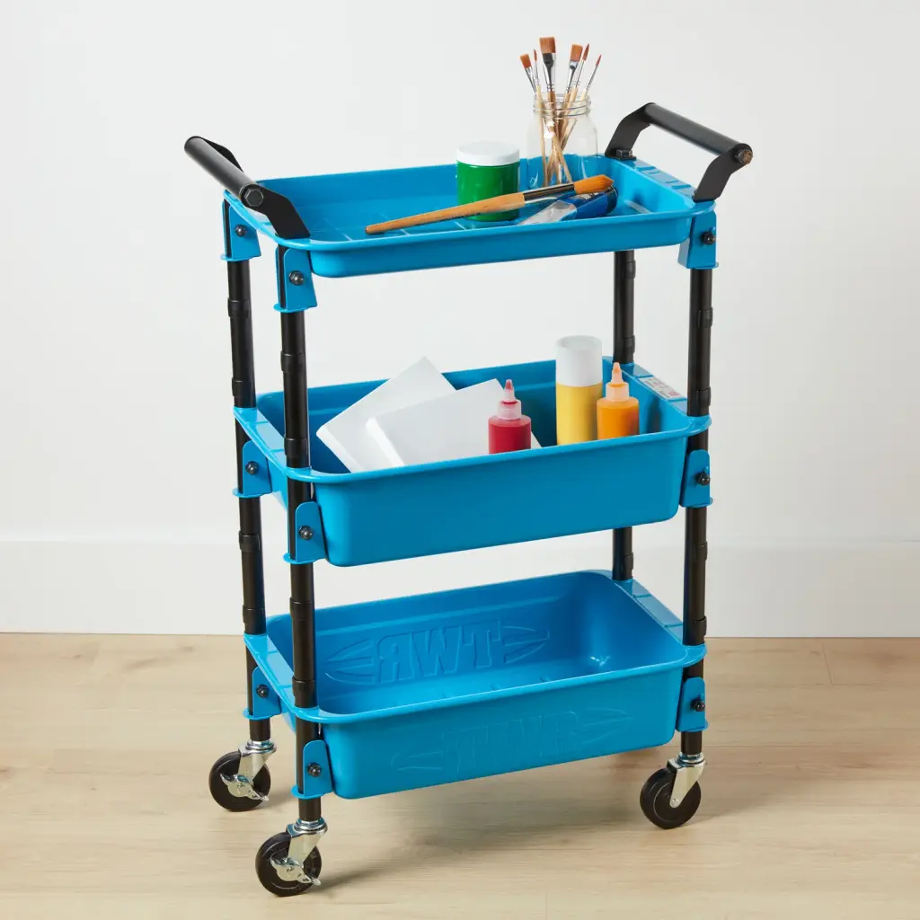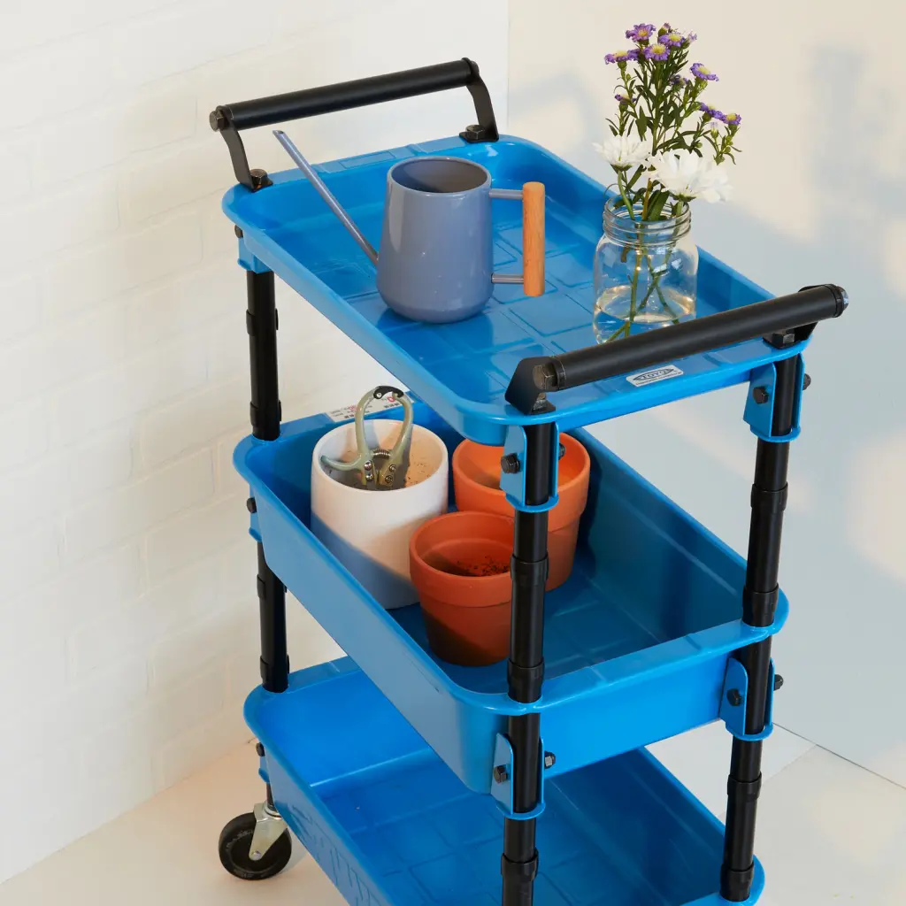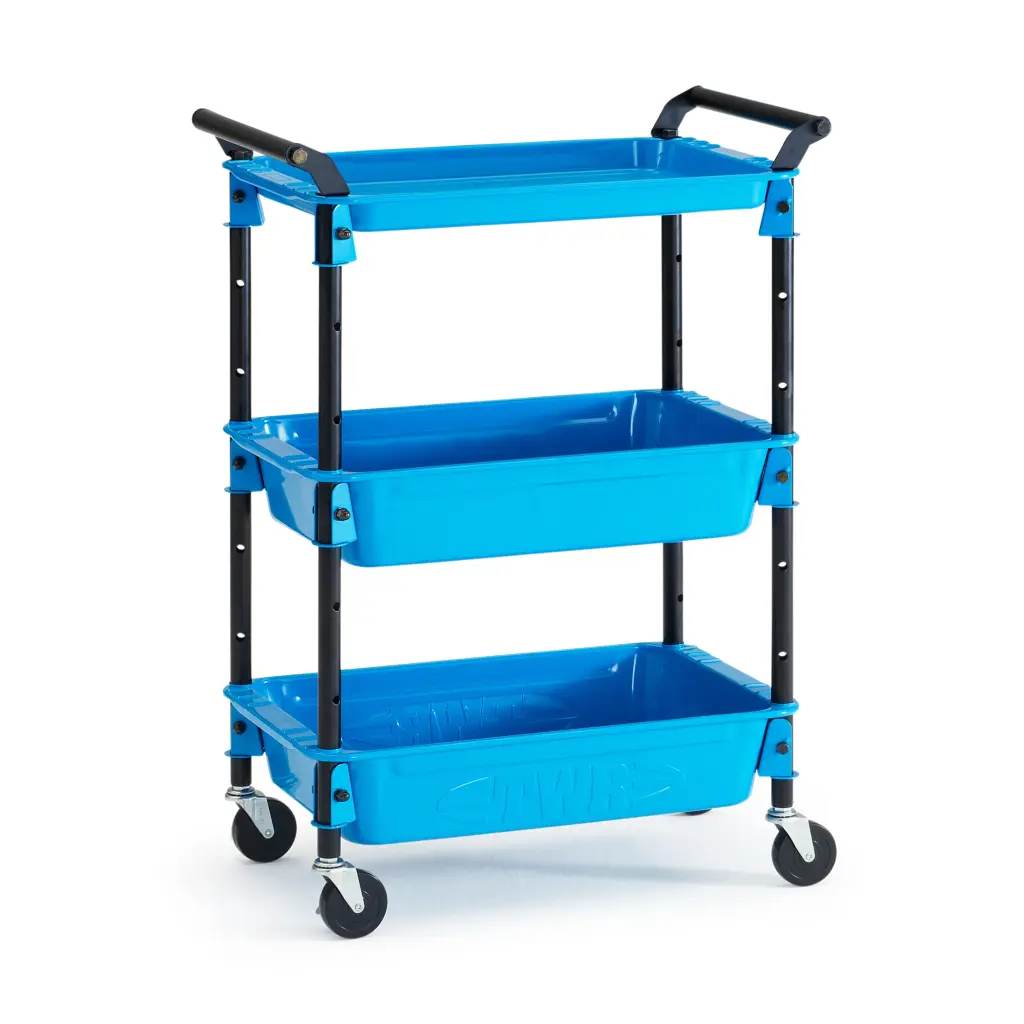 MoMA Exclusive: This high-quality, sturdy steel wheeled cart is incredibly versatile, and at just over 33”, it’s the perfect height to cozy up to a desk or work table for instant access to the tools, craft or office supplies you need to work comfortably. Two trays hold a good-sized supply of toys, tools, or even plants