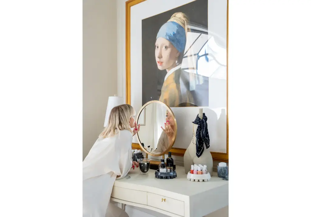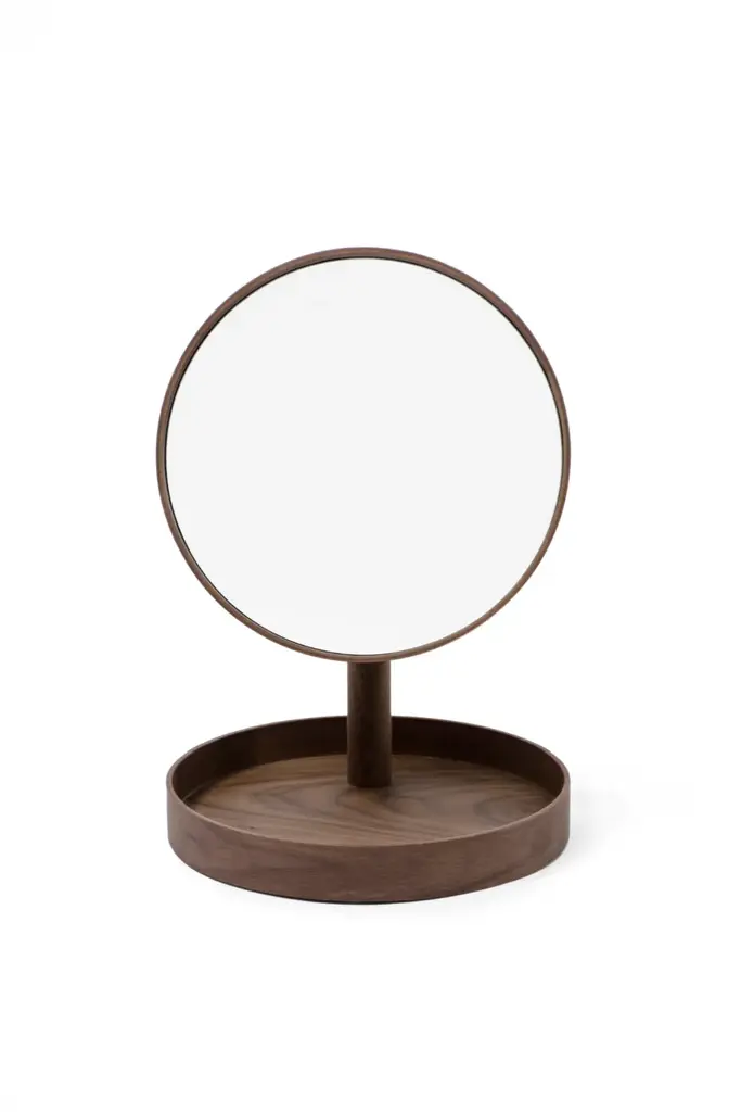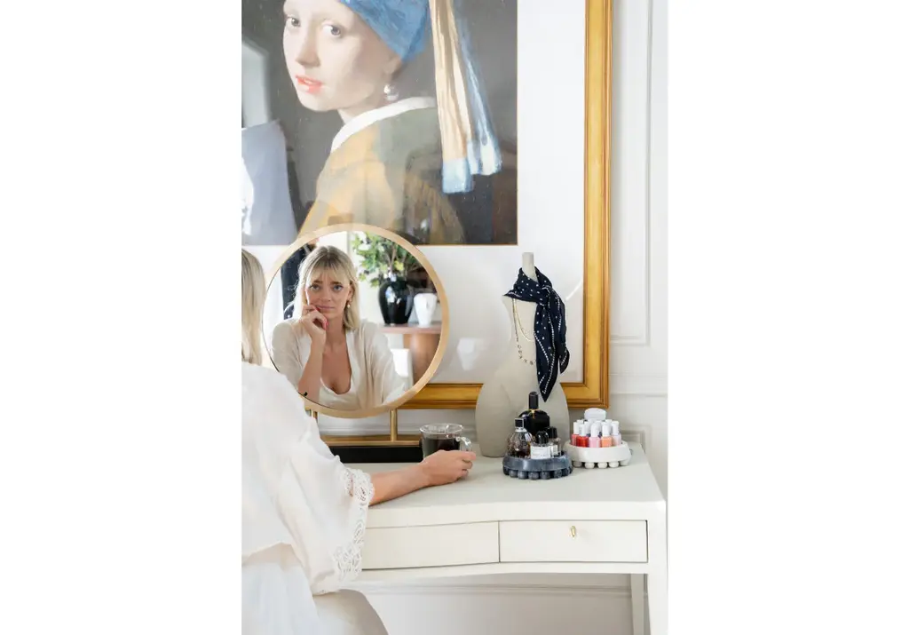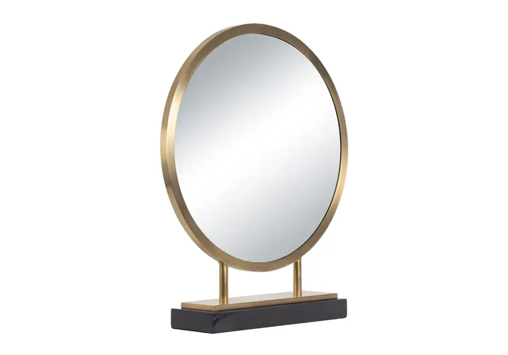 A timeless addition, this eye-catching piece is the perfect vanity must-have. Its spacious, rounded mirror provides complete visibility for hair and make-up and is enclosed by a generous real brass frame. A polished black marble base elevates its refined style, pairing well with bathroom counters and vanity desks.