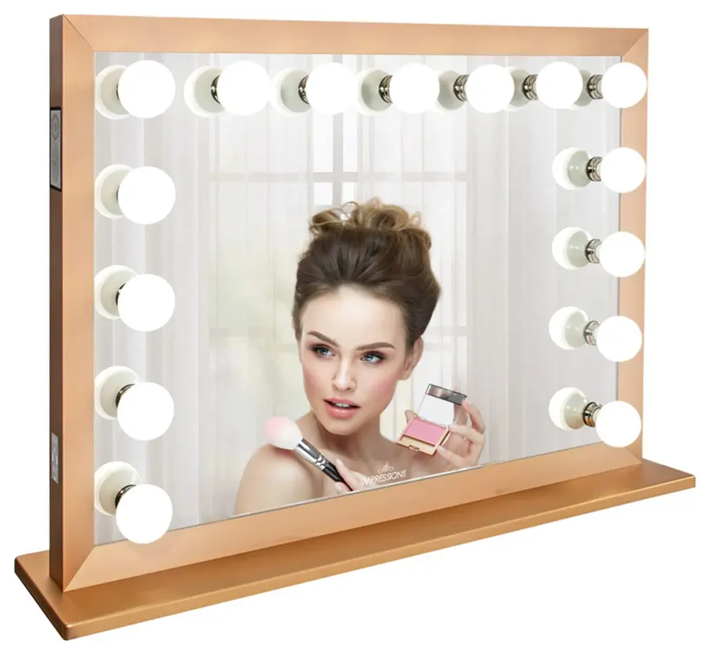 Impressions Vanity Hollywood Glow Pro cosmetic mirror is redefined classic mirror for makeup. This beauty vanity mirror features 15 LED lights which are replaceable. The makeup vanity also has a dimmer switch to adjust the brightness for making the view perfect. This trendy decorative led mirror will make your makeup room fashionable. Our aesthetic mirror will make you feel professional. This tall light up mirror also has a power switch. This table mirror comes with built-in outlets to power up your vanity accessories and built-in USB outlets to charge your devices. This Hollywood mirror also can be used as a mirror for walls. The light-up mirror has pre-drilled holes on the back. Wall mounting kits are sold separately to use as wall-mounted mirrorsFeatures:FRAMELESS DESIGN: The LED makeup mirror is a perfect rectangle mirror that adds a beautifully unique flair to your glam room. This large mirror maintains the classic Hollywood surrounding lights with a modern take by highlighting the rounded edges and frameless designDIMMABLE LED LIGHTS: Our mirror for the desk comes with 12 dimmable LED bulbs. You can easily adjust the brightness of the dresser mirror''s lights with the built-in dimmer switch making your view more beautiful, convenient for you to do your makeupBUILT-IN OUTLETS AND USB PORTS: This desk mirror features built-in 2 outlets to power up your vanity accessories. Our bedroom mirror also includes built-in USB ports. You can charge your phone and other devices with the help of the frameless mirrorMOUNTABLE OPTIONS: Our LED vanity mirror comes with a sturdy detachable base to use as a tabletop mirror. Besides this smart mirror also allows you to use it as a wall mirror. There are pre-drilled slots on the back of the lighted mirror for wall mounting
