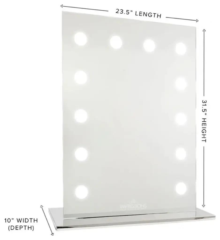 Impressions Vanity The Hollywood Mirage II beautifully combines Hollywood elegance with the modern sophistication of long-lasting, energy-saving LED lighting, eliminating the need for traditional bulbs while keeping the glamorous studio look. Its unique, amazingly flat bulb-less profile and edge-to-edge mirror surface give a super luxurious look that all your friends (and frenemies) will envy.Features:STUDIO MIRROR: If you are looking for a modern and bold statement piece for your home this dressing mirror is outstanding to your glam room. Also, it provides a perfect studio-quality makeup environmentLIGHTED MIRROR: This vanity mirror has an energy-saving LED bulb that provides a natural daylight effect, so can you get the perfect makeup look. Also, eliminate traditional bulbs and keep the glamorous studio lookMOUNTING MIRROR: This dressing mirror arrived with a mounting slot in the rear and a detachable base for easy wall mounting, so you can save space in the workplace or at home. Also, you can set it as a tabletop mirrorPOWER SYSTEM: This desk or wall-mounting mirror has side-mounted power outlets, that is perfect for hair tools like hair straightener, curler, and dryer, and charging your phone while getting glam
