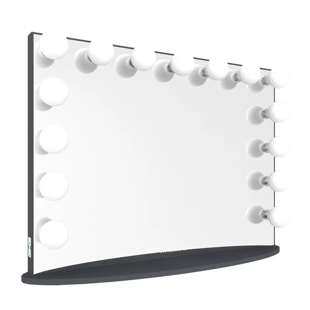 Impressions Vanity mirror is the original frameless mirror. Equipped with 15 light sockets and a dimmer switch for that perfect lighting! Includes built-in outlets and USB ports on the side to power up or charge your beauty accessories. A detachable base is included to easily remove and place on any of our SlayStation tables or attach the base and place it on any vanity setup. The Hollywood Glow Pro also includes the option of adding Wireless Bluetooth Speakers. TOUCH SENCER: This dressing mirror has the option of a wireless Bluetooth speaker with touch-sensitive buttons. Use the touch-sensitive control panel to engage the BluetoothBUILT IN MIRROR: This lighted makeup mirror includes built in outlets and USB ports on the side for you to power up or charge your beauty accessoriesDETACHABLE BASE: This vanity dressing mirror includes a detachable base to easily move and place on our slaystation tables or attach the base and place it in a vanity setup