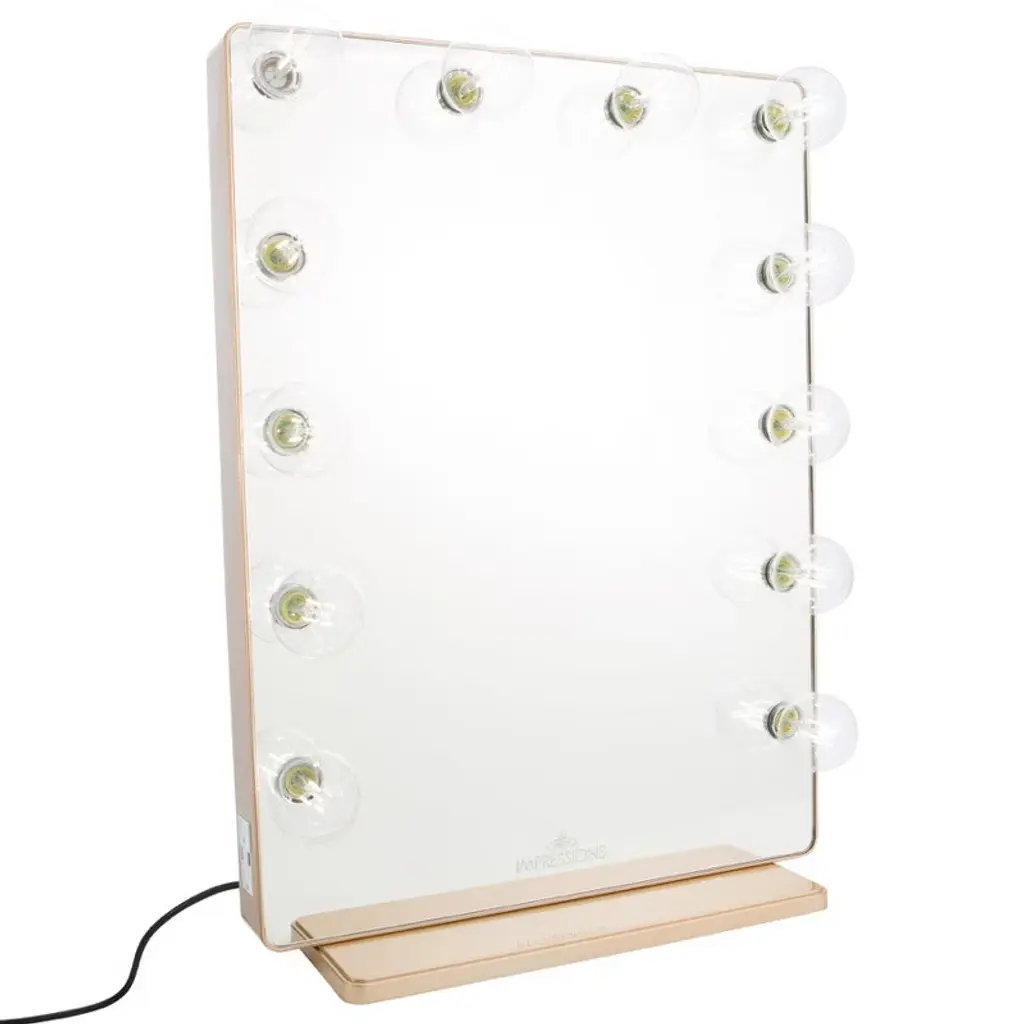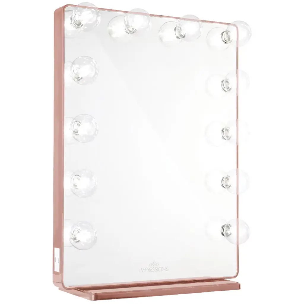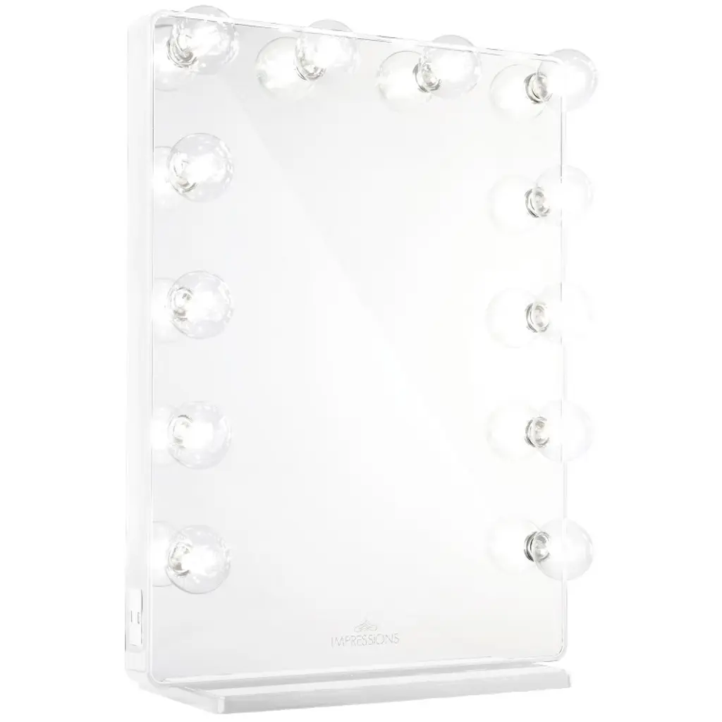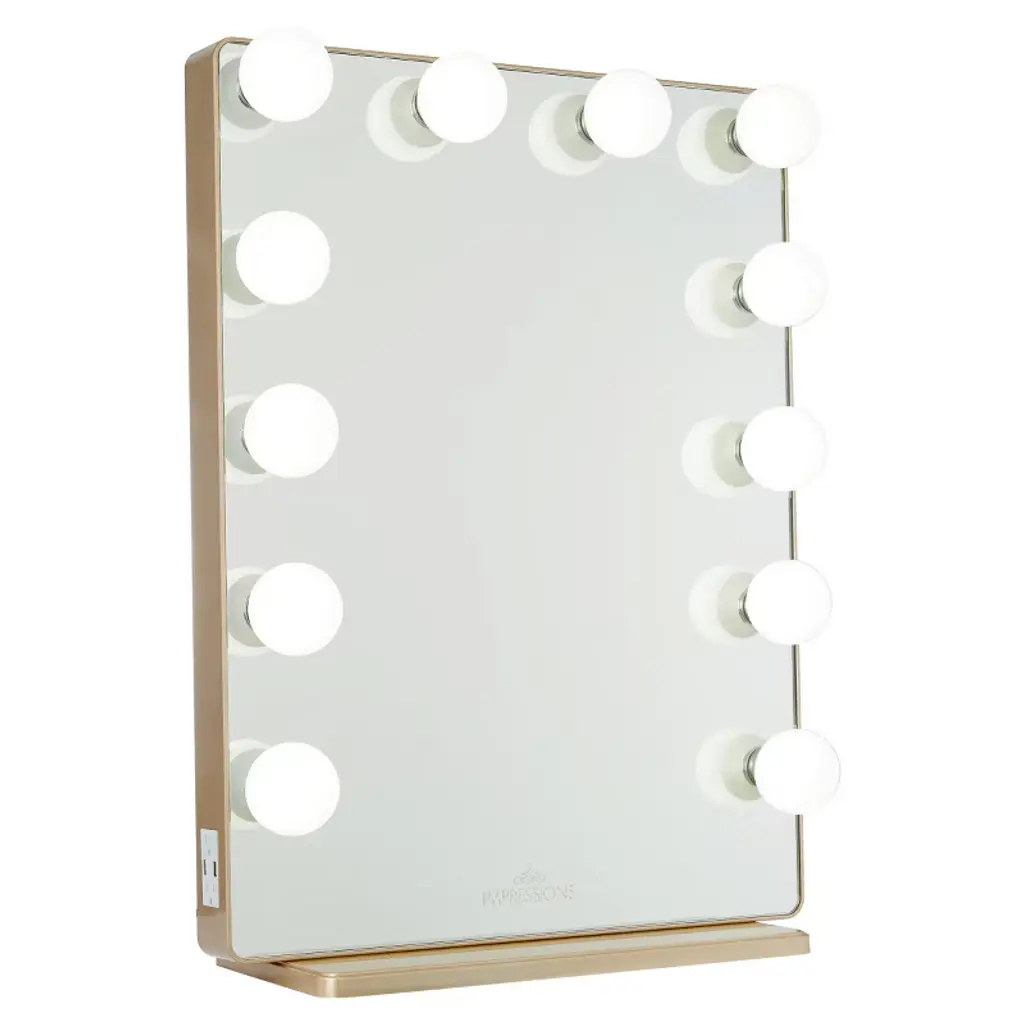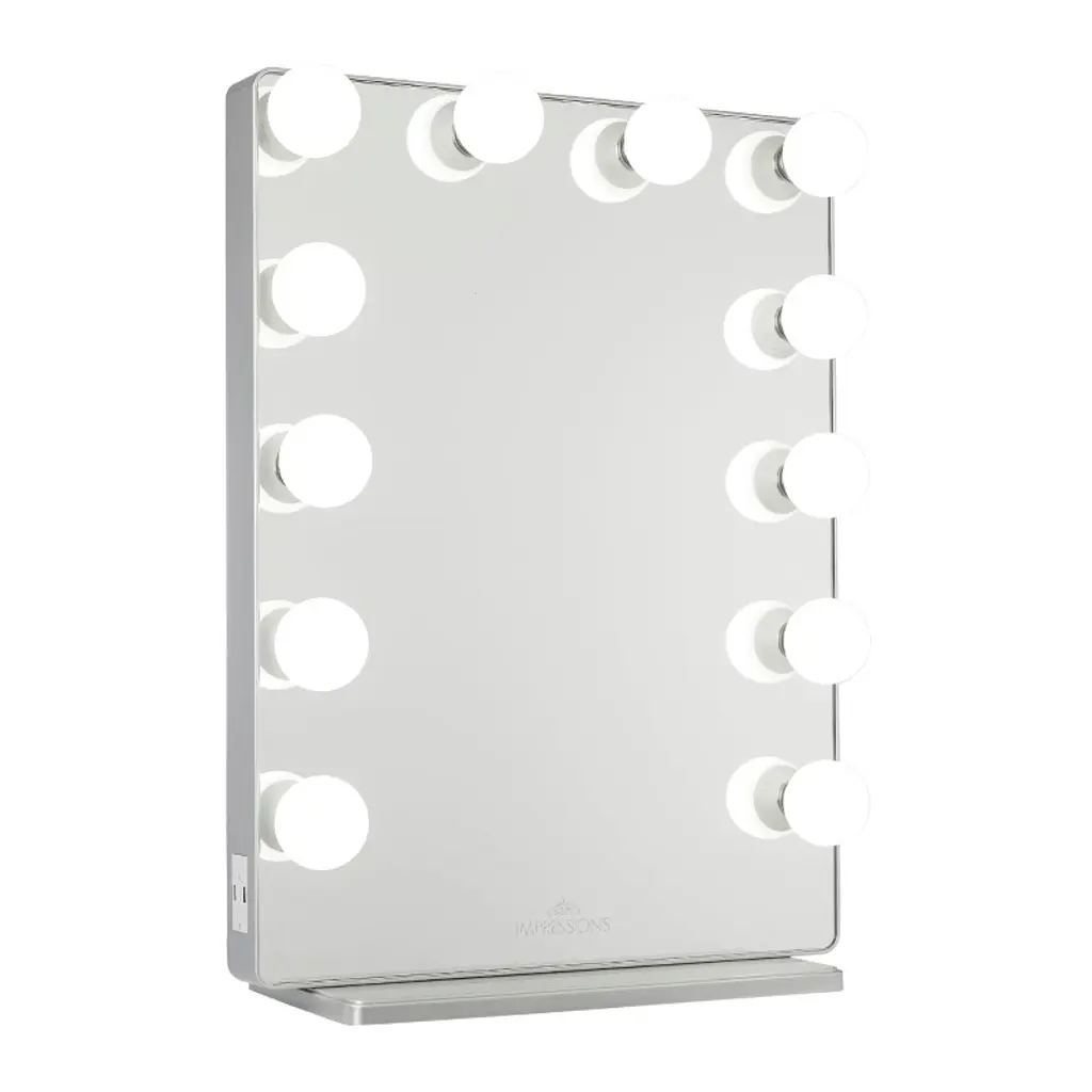 Impressions Vanity Hollywood Glow XL 2.0 cosmetic mirror is a redefined classic mirror for makeup. This beauty mirror features 12 replaceable LED lights. The makeup vanity also has a dimmer switch to adjust the brightness to make the view perfect. This table mirror comes with built-in outlets to power up your vanity accessories and built-in USB outlets to charge your devices. This Hollywood mirror also can be used as a mirror for walls. The light-up mirror has pre-drilled holes on the back. Wall mounting kits are sold separately to make this a wall-mounted mirror. !! Every occasion or your special day our vanity set plays a special role in your life and a perfect for any girl !! Overview Redefining a classic was no easy feat but Impressions Vanity’s Hollywood Glow® XL 2.0 did just that! This tall mirror maintains the classic Hollywood surrounding lights with a modern take by highlighting the rounded edges and frameless design. Features 12 bulbs for even lighting and equipped with a built-in dimmer switch to adjust the brightness to your perfect level. This modern mirror also comes with built-in three-pronged outlets to power up your vanity accessories and built-in USB outlets to charge your devices! Includes a detachable base to set the mirror and complete your vanity station. Or, remove the base and this mirror can be easily wall-mounted with the pre-drilled holes on the back! Features: Frameless design12 light sockets Lightbulbs included Built-in outlets and USB portsBuilt-in dimmer switchBase includedPre-drilled slots for wall-mounting Wall-mounting kit sold separately **Only Impressions Vanity® Hollywood Vanity Mirrors are certified by ETL, CE, and RoHS safety standards We love seeing your photos! Tag @ImpressionsVanity on Instagram with the hashtag #ImpressionsVanityGlow to submit your photo for a chance feature on our pages! Dimensions Mirror:19 x 25 in. Length:23 in.Width:9.5 in.Height:32.25 in.Weight:37 lbs. Bulb Types The main difference between our available incandescent and LED bulbs are the color temperature (glow color). Our incandescent bulbs have a warmer (more yellow) glow while LEDs have a more natural, whiter light as shown in the image* below: *computer rendered approximation, actual appearance may slightly differ LED bulbs also are energy-saving and do not get hot to the touch, unlike traditional incandescent bulbs.