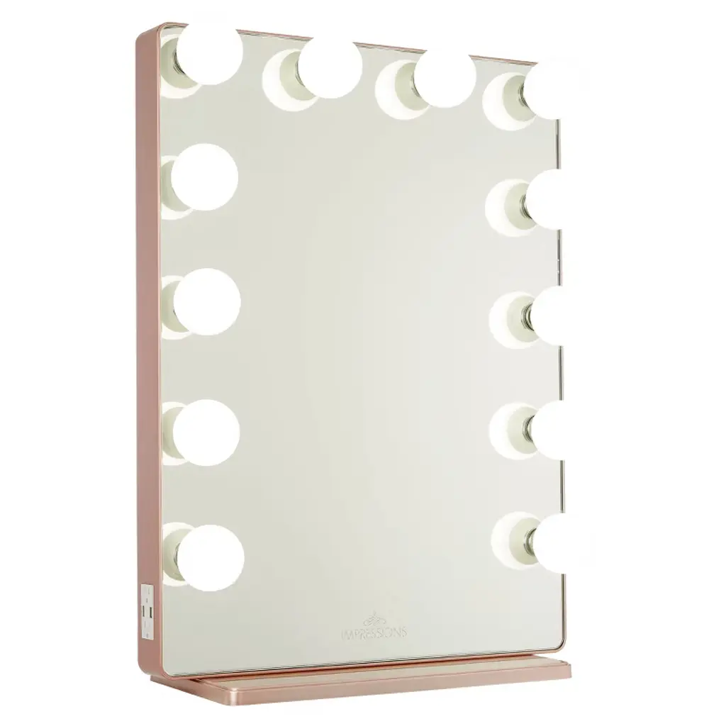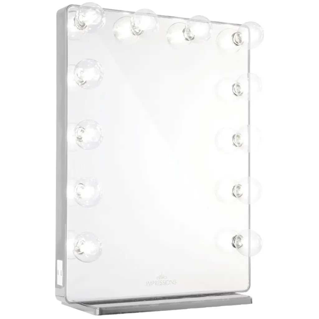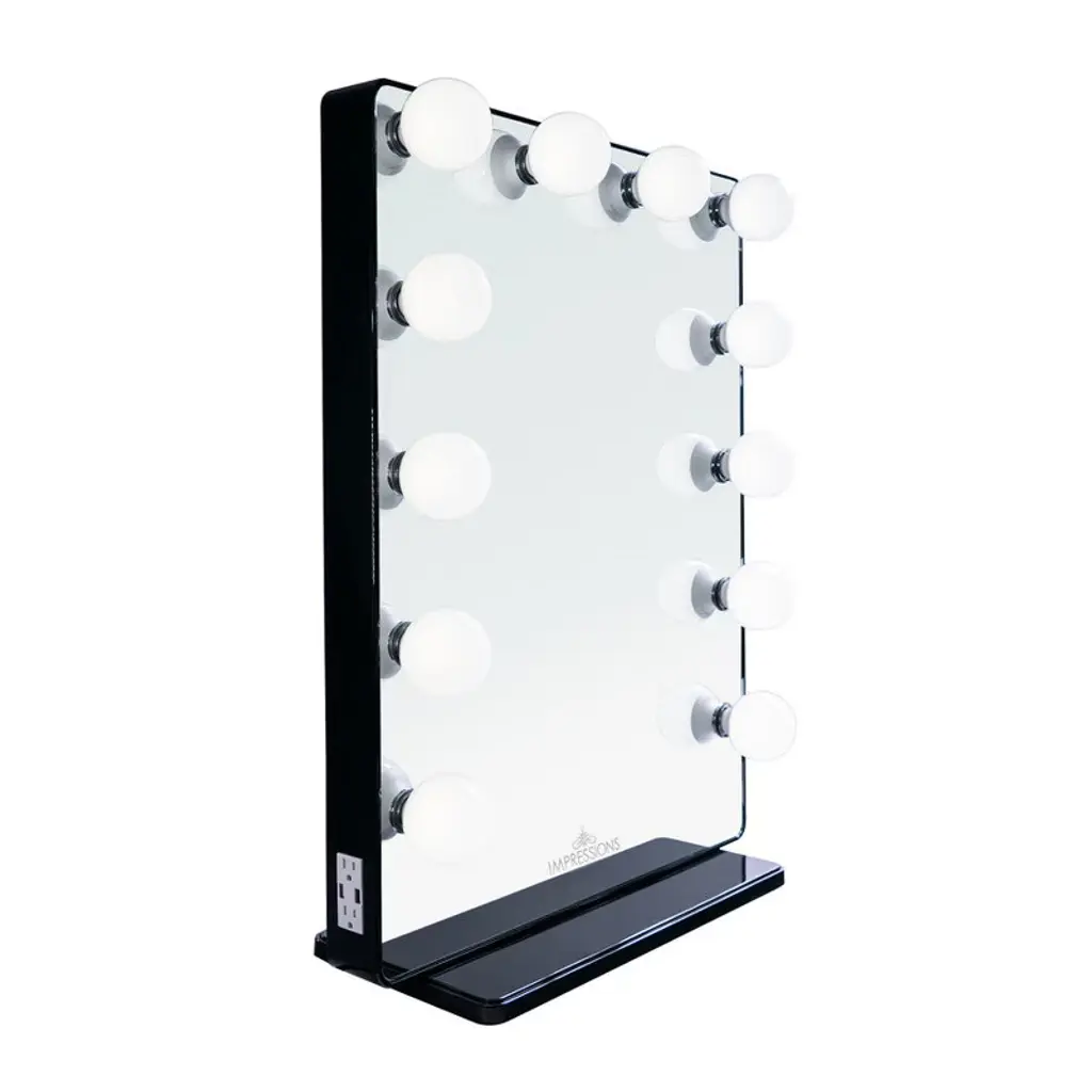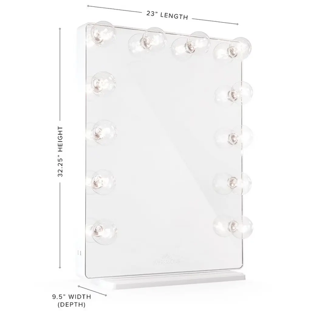 Impressions Vanity Hollywood Glow XL 2.0 cosmetic mirror is a redefined classic mirror for makeup. This beauty mirror features 12 replaceable LED lights. The makeup vanity also has a dimmer switch to adjust the brightness to make the view perfect. This table mirror comes with built-in outlets to power up your vanity accessories and built-in USB outlets to charge your devices. This Hollywood mirror also can be used as a mirror for walls. The light-up mirror has pre-drilled holes on the back. Wall mounting kits are sold separately to make this a wall-mounted mirror. !! Every occasion or your special day our vanity set plays a special role in your life and a perfect for any girl !! Overview Redefining a classic was no easy feat but Impressions Vanity’s Hollywood Glow® XL 2.0 did just that! This tall mirror maintains the classic Hollywood surrounding lights with a modern take by highlighting the rounded edges and frameless design. Features 12 bulbs for even lighting and equipped with a built-in dimmer switch to adjust the brightness to your perfect level. This modern mirror also comes with built-in three-pronged outlets to power up your vanity accessories and built-in USB outlets to charge your devices! Includes a detachable base to set the mirror and complete your vanity station. Or, remove the base and this mirror can be easily wall-mounted with the pre-drilled holes on the back! Features: Frameless design12 light sockets Lightbulbs included Built-in outlets and USB portsBuilt-in dimmer switchBase includedPre-drilled slots for wall-mounting Wall-mounting kit sold separately **Only Impressions Vanity® Hollywood Vanity Mirrors are certified by ETL, CE, and RoHS safety standards We love seeing your photos! Tag @ImpressionsVanity on Instagram with the hashtag #ImpressionsVanityGlow to submit your photo for a chance feature on our pages! Dimensions Mirror:19 x 25 in. Length:23 in.Width:9.5 in.Height:32.25 in.Weight:37 lbs. Bulb Types The main difference between our available incandescent and LED bulbs are the color temperature (glow color). Our incandescent bulbs have a warmer (more yellow) glow while LEDs have a more natural, whiter light as shown in the image* below: *computer rendered approximation, actual appearance may slightly differ LED bulbs also are energy-saving and do not get hot to the touch, unlike traditional incandescent bulbs.