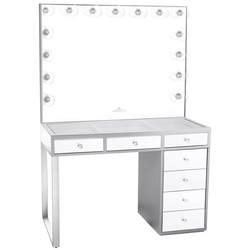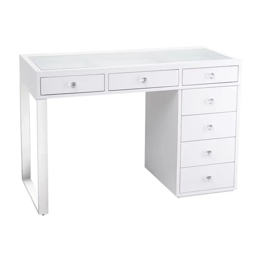 Impressions Vanity table is a stylish and functional contemporary piece of furniture for your home. Soft close drawers and compartments offer ample storage space for your makeup accessories. ELEGANT DESIGN: Our makeup vanity desk boasts a clear glass tabletop, perfect for showcasing your favorite vanity items, while the 3 spacious drawers provide ample display space STORAGE UNITS: With a drawer unit serving as the vanity table's sturdy base, you'll have a total of 4 drawers at your disposal and plenty of room LUXURIOUS TOUCH: Enhance the aesthetic appeal of your space with the crystal lux knobs adorning each drawer. They add a touch of opulence to the makeup table DURABLE CRAFTSMANSHIP: Crafted from high quality MDF material, this makeup vanity desk is built to last. Its robust construction ensures a long lasting stable addition to your room PERFECT GIFT IDEA: We choose beautiful packaging, it can be a great gift for makeup lovers, on Valentine's Day, Christmas, or Thanksgiving Day !! Everything in your home deserves more because furniture defines you !! Equipped with 3 soft close drawers underneath the tabletop, providing ample storage Includes a drawer unit serving as a sturdy base, offering a total of 4 drawers The drawers are adorned with luxurious crystal knobs, adding an opulent touch Crafted from high quality MDF material, the vanity table is built to ensure stability The vanity desk can be placed in various locations such as the bedroom, bathroom or closet Combines style and functionality, making it a perfect piece of contemporary furniture for your home The vanity table’s elegant design and luxurious details are designed to suit any decor This makeup vanity desk makes an ideal gift for makeup lovers