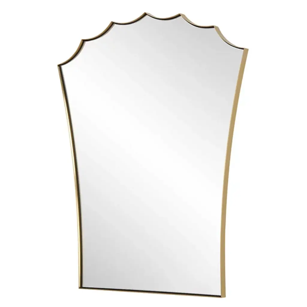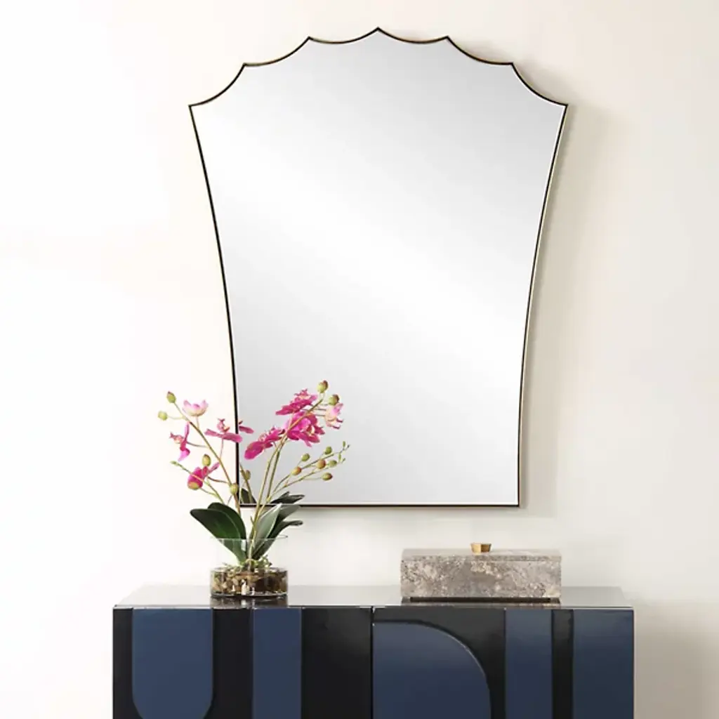 The Monarch Vanity Mirror from Uttermost, designed by Jim Parsons, draws inspiration from vintage vanity designs of the Art Deco era. Its scalloped arch and tapered edges create an ornate outline that channels the opulence of classic dressing tables. The plated antique finish adds warmth and depth against the polished mirror surface, while the curved sides offer a fresh interpretation of traditional mirror design. This piece is ideal for powder rooms, dressing areas, and spaces that benefit from refined design details.