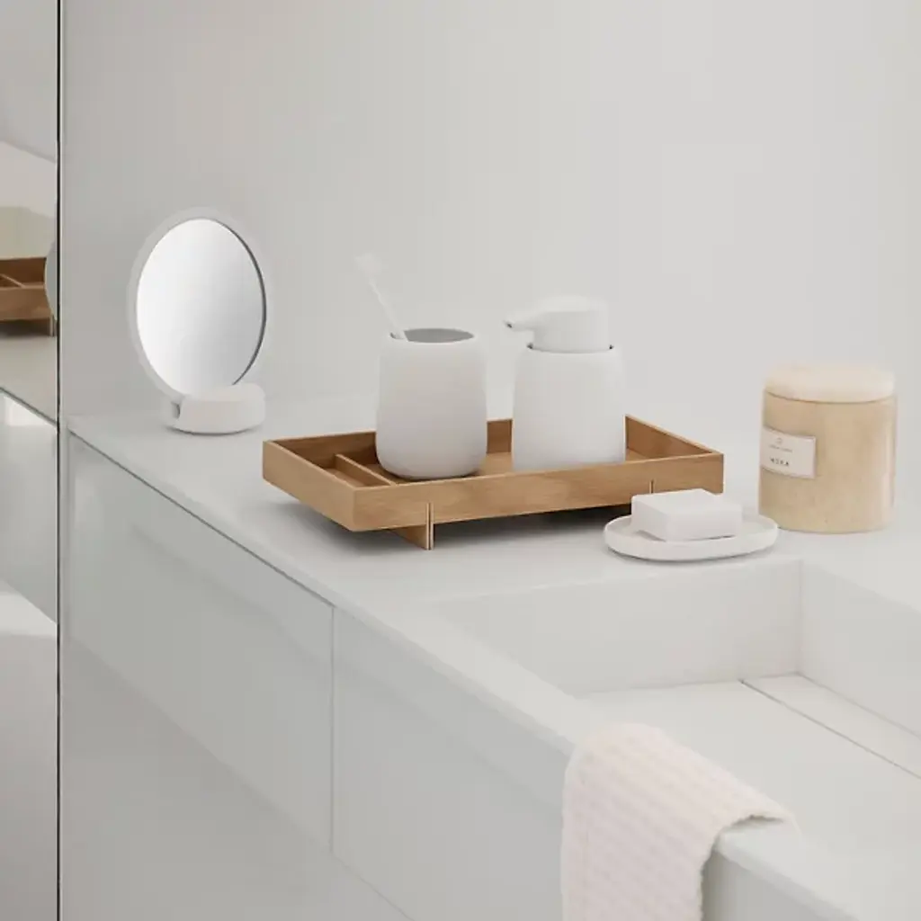 Tidy up at your dressing table, bathroom, or couch with the versatile Sono Vanity Mirror from Blomus. Set the piece up on any table surface with its cool matte base. Its crisp mirror stands out with a sharp circular trim; it slots into the recession of the base and can be taken out freely for handheld uses. The mirror’s 5x magnification highlights your smile in all its glory.