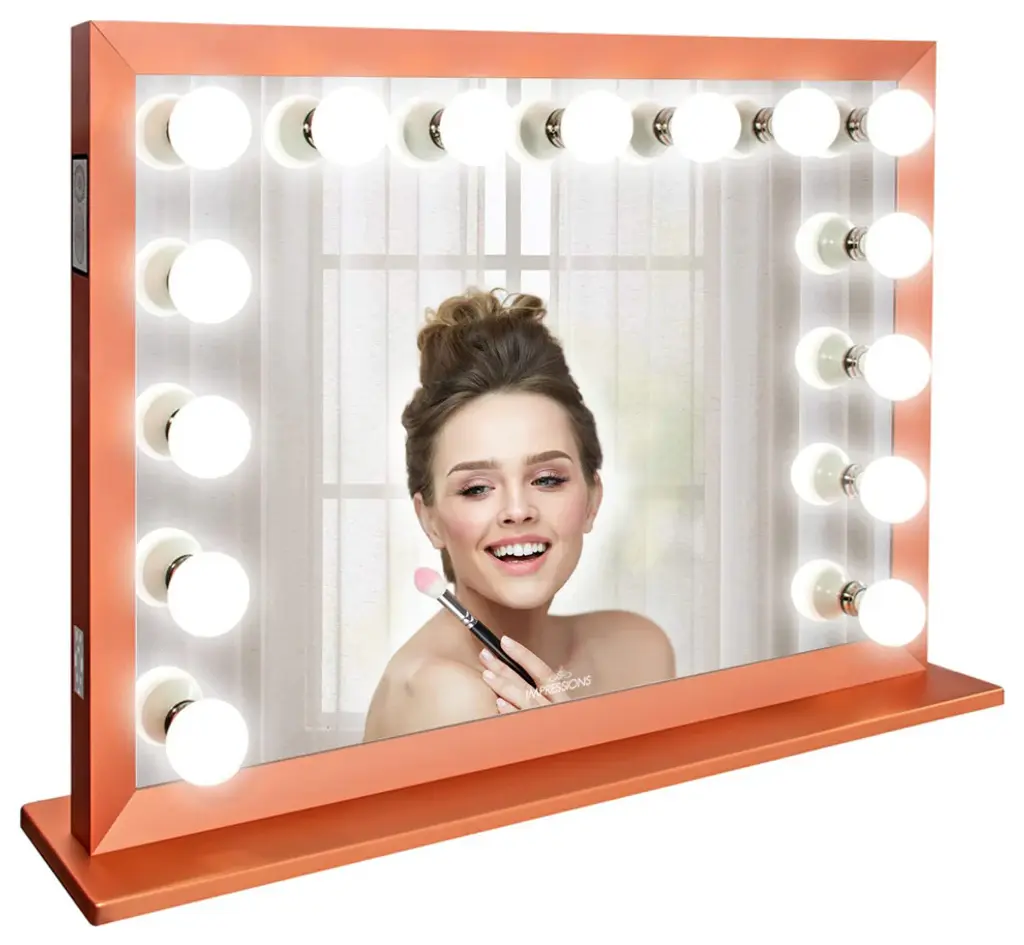 Impressions Vanity The Starlight Pro vanity mirror provides perfect lighting for makeup application, and taking the perfect selfies. Also, it comes with 15 LED bulbs and a magnetic magnified mirror which provides perfect and superior mirror reflection clarity. It has a dimmer power switch and dual accessory power outlets in a light metal body, it also comes with a detachable base designed and convenient mounting slots for both tabletop and wall mounted setups.Features:HOLLYWOOD STUDIO MIRROR: If you are looking for a modern and bold statement piece for your home this vanity mirror is outstanding to your glam room. Light up your space and create a studio environmentDIMMABLE LIGHT: This lighted mirror is equipped with 15 LED bulbs and a dimmer power switch to adjust your perfect brightness. Also, it has dual accessory power outlets for charges and beauty accessoriesMAGNIFYING MIRROR: This facial mirror includes a 6.75 in. diameter detachable magnetic glass placed on the mirror which can help to do detailed work or do perfect makeupSTANDING BASE: This Hollywood mirror is made of a metal body, also it comes with a detachable base designed and convenient mounting slots for both tabletop and wall mounted setups