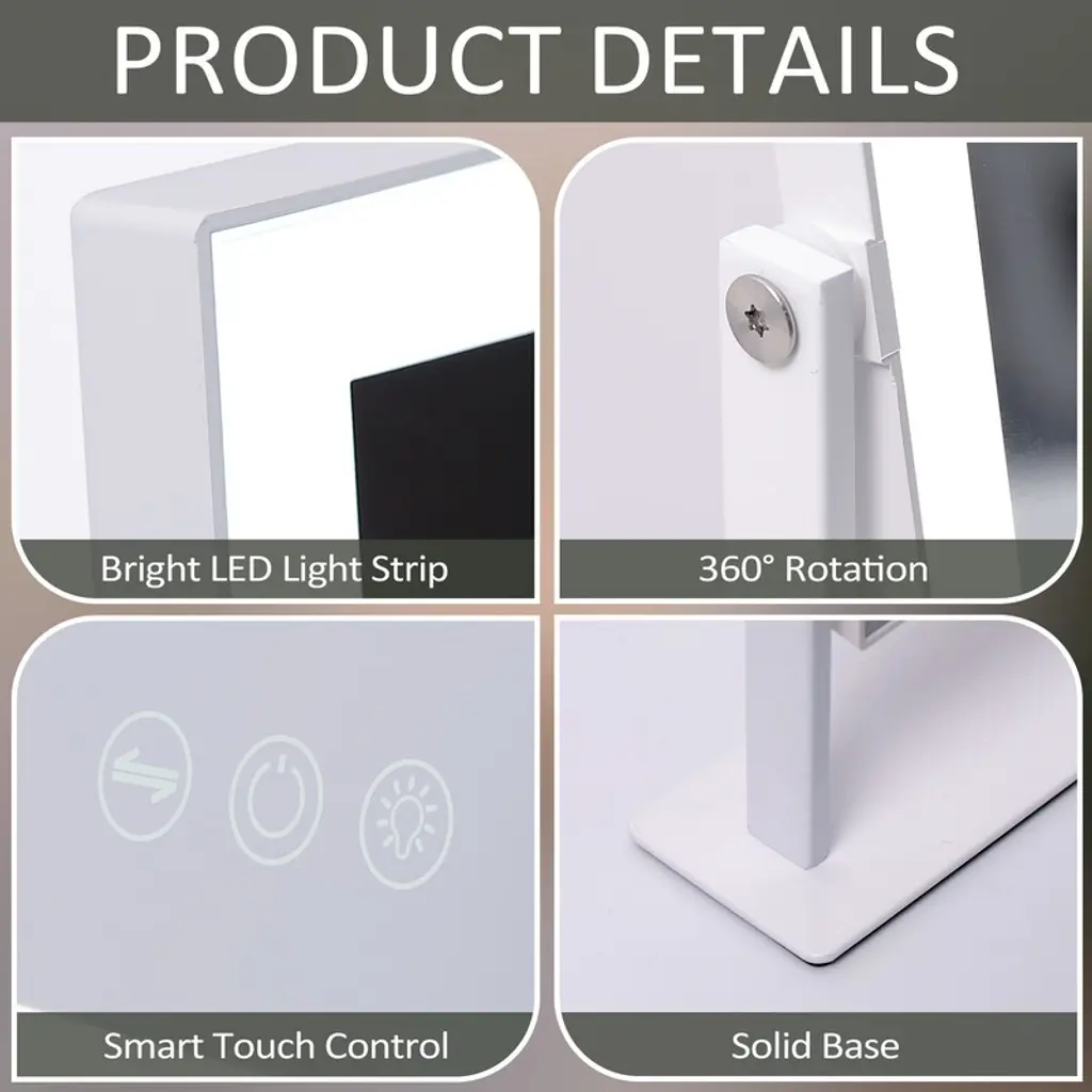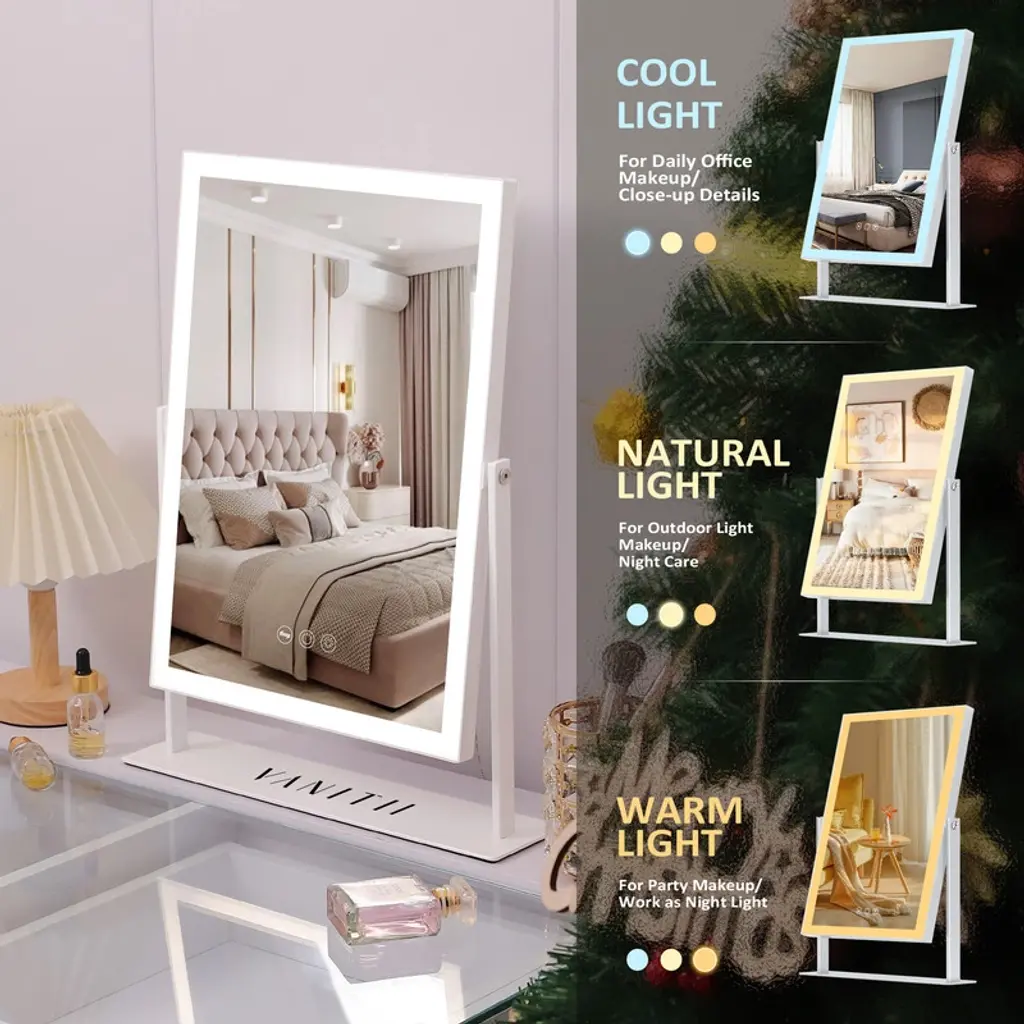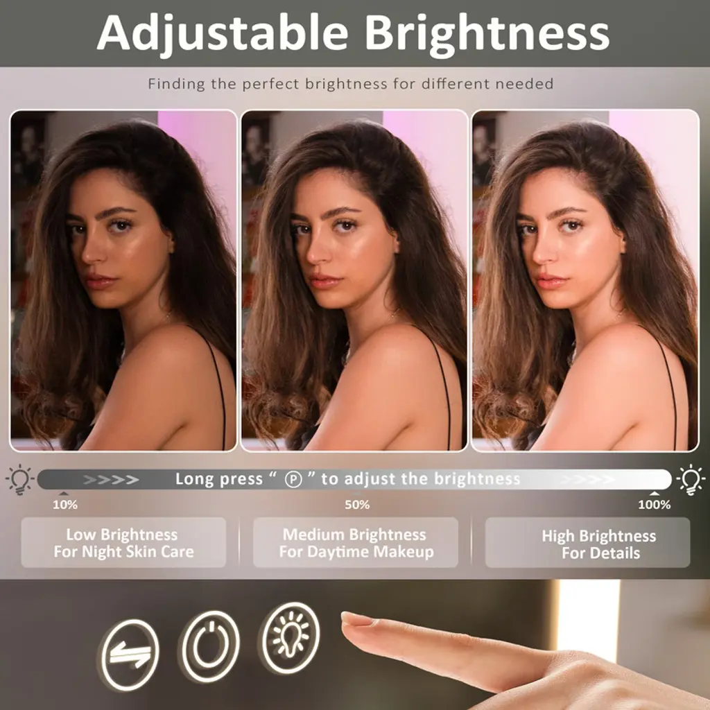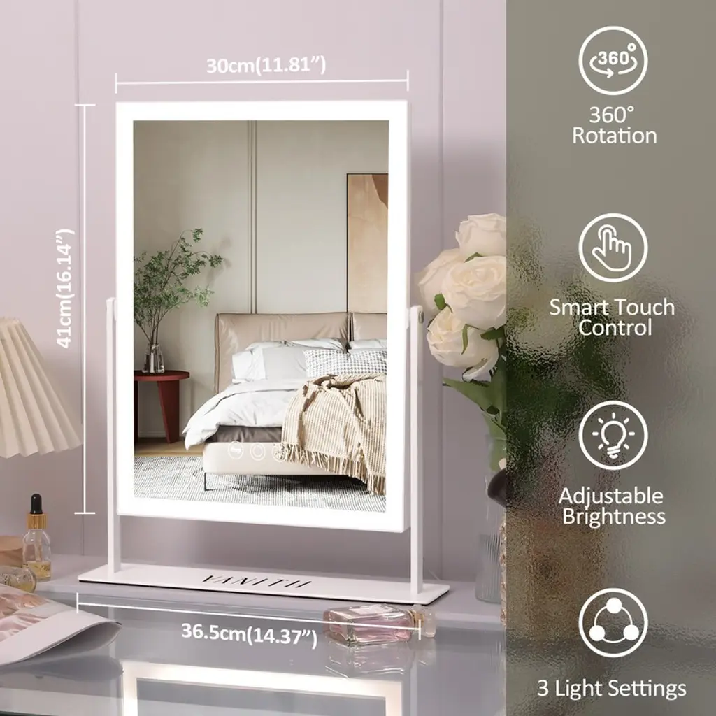 Generous Viewing AreaThis mirror offers a spacious 12" x 16" reflective surface, providing ample space to view your entire face and more. It's perfect for applying makeup, skincare routines, or detailed grooming with ease.LED Light StripEquipped with a high-quality LED light strip, this mirror illuminates your face evenly, ensuring that every detail is visible. The natural daylight-like lighting helps in achieving flawless makeup application and precise grooming.Adjustable Brightness & 3 Light TemperaturesCustomize your lighting experience with adjustable brightness levels and three different light temperature settings. Whether you're getting ready for a day at the office, a night out, or simply need a clear view for your skincare routine, you can choose the perfect illumination to suit any occasion. 10X Magnifying MirrorFor those moments when you need to see the finer details, the attached 10X magnifying mirror is just what you need. It's ideal for tasks like tweezing, eyeliner application, or inspecting your skin closely, allowing you to achieve precision and perfection.USB Port for Charging Convenience Never worry about finding a place to charge your devices while you get ready. The integrated USB port allows you to charge your smartphone, tablet, or other compatible devices, keeping them powered up and within reach as you prepare for your day or evening.