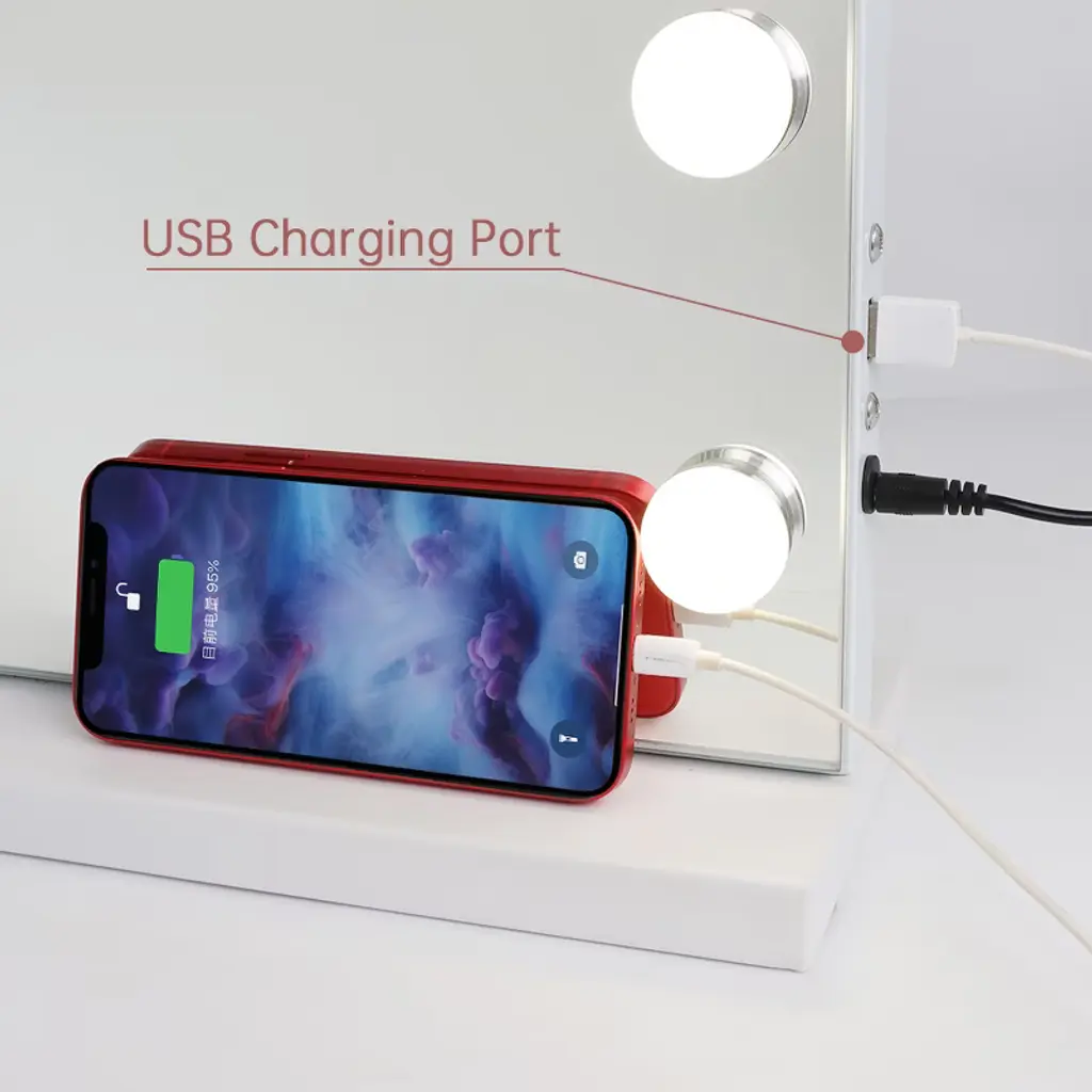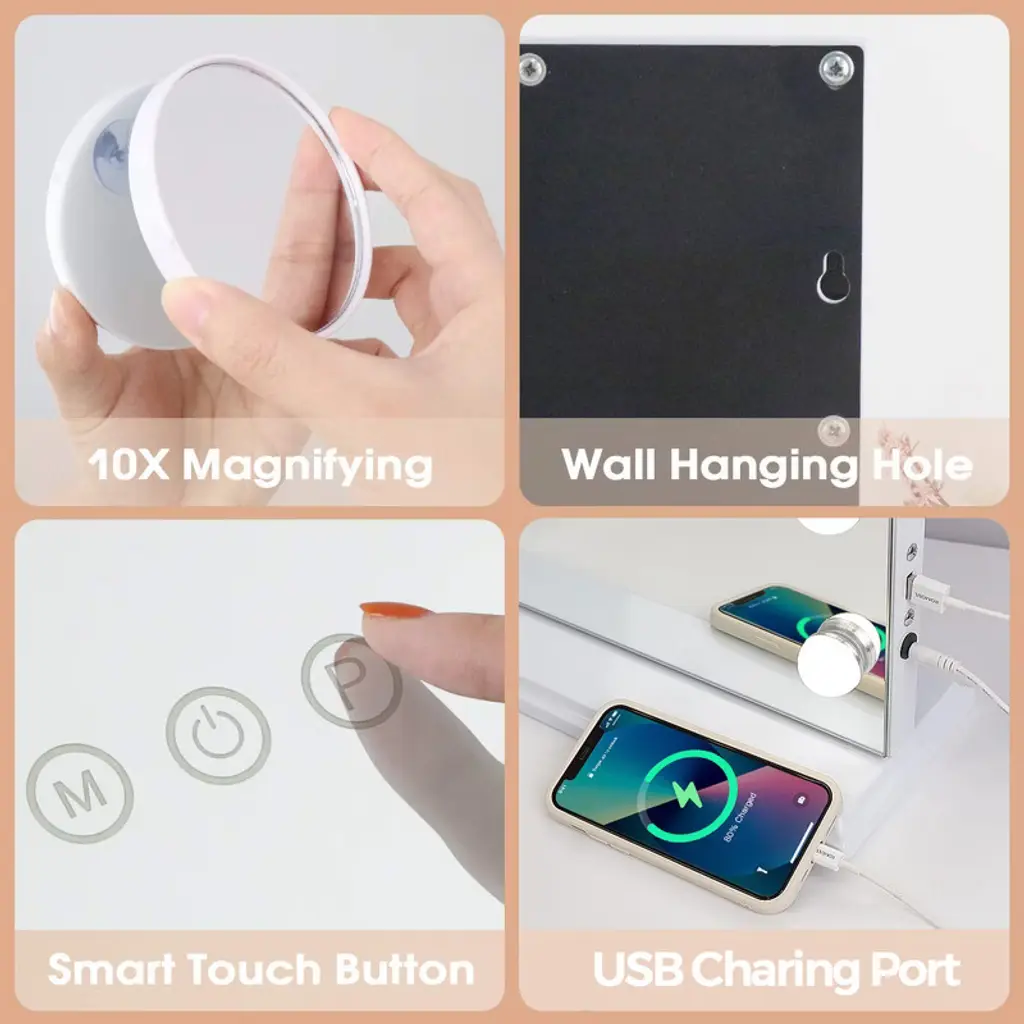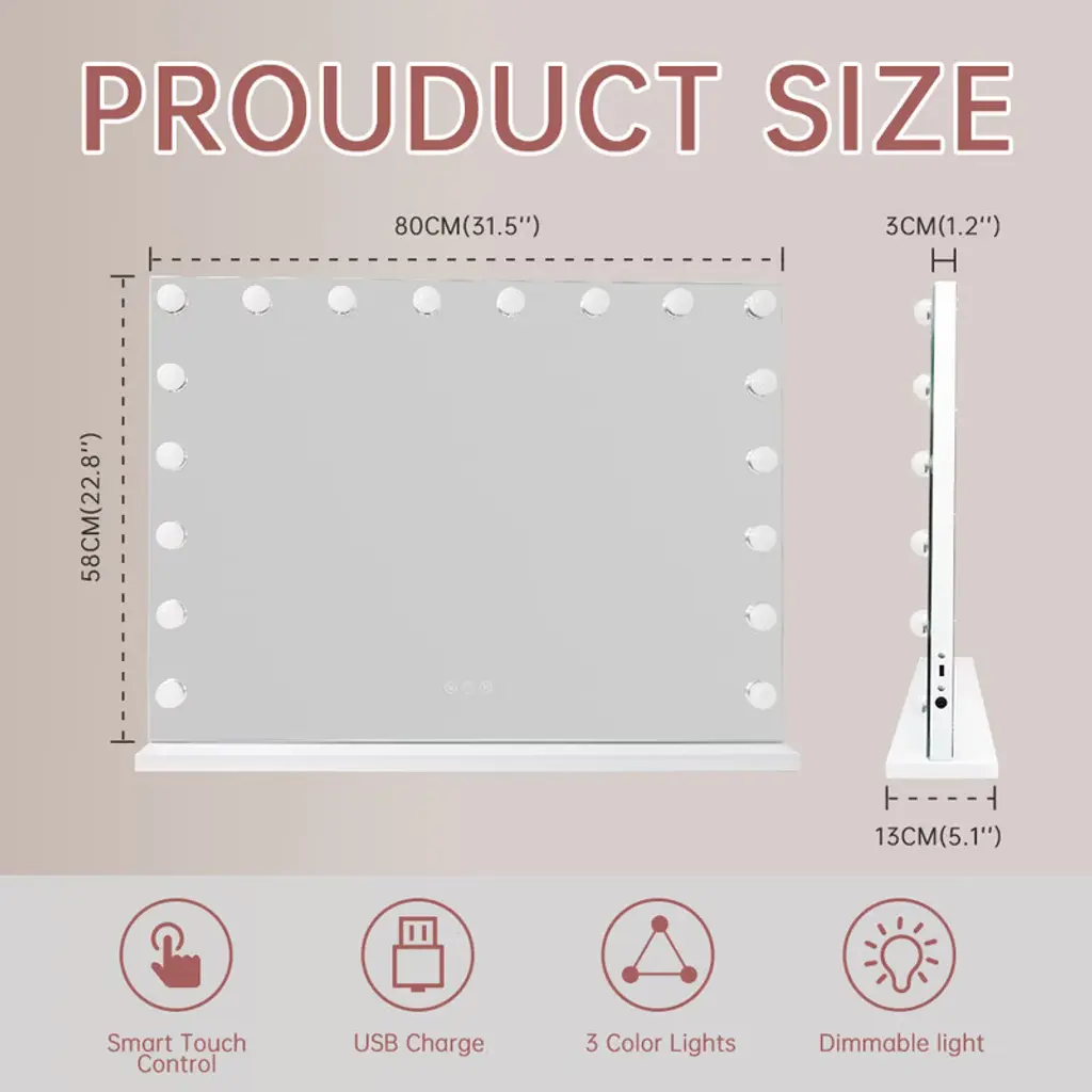 Large Size & 18 LED Bulbs32"x 23", this Hollywood Vanity Mirror has a large size providing you with a perfect upper body view.Adjustable Brightness & 3 Light SettingsThere are 3 different light settings with the ability to dim and brighten each setting: warm light, day light and cold light.USB Charging PortThere is a USB charging port on the right side for you to charge your phone or other USB devices.10X Magnification MirrorThere is a detachable 10X mini Magnification Mirror included for you doing makeup. Wall Mounted OptionWith a detachable base and there are 2 holes on the back for nails. You can either place the Vanity Mirror on tabletop or on wall.